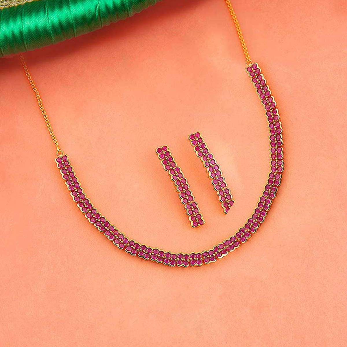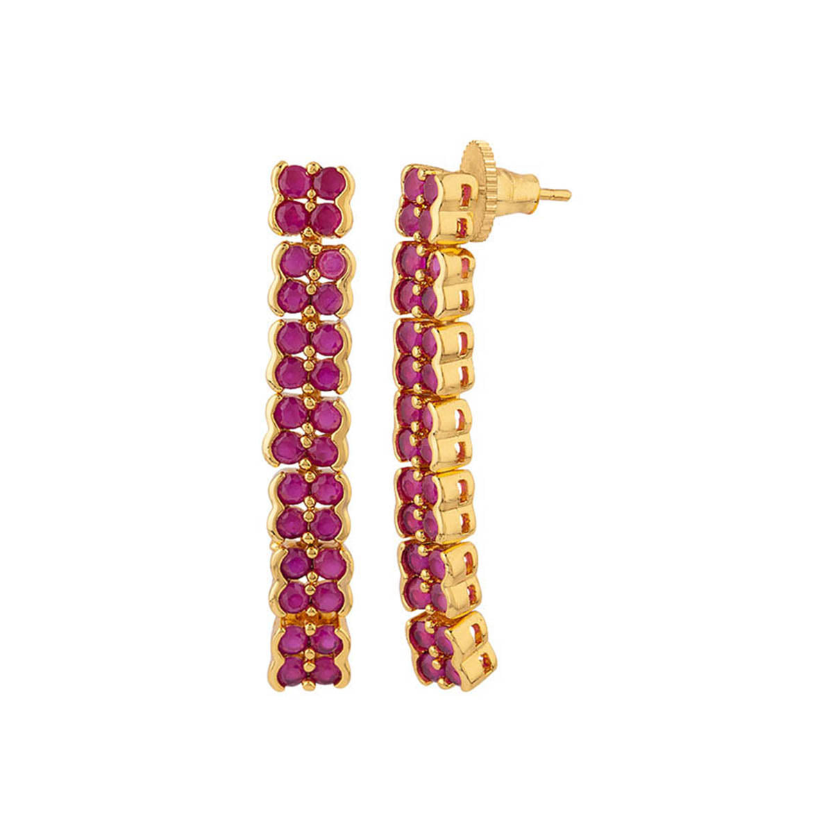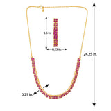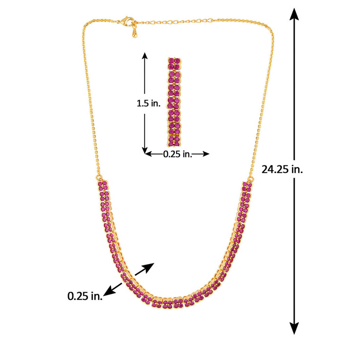Red gemstones adorned brass necklace set with yellow gold plating. Wear with a formal evening gown. This piece of jewelry comes with the Voylla assurance of quality and durability.