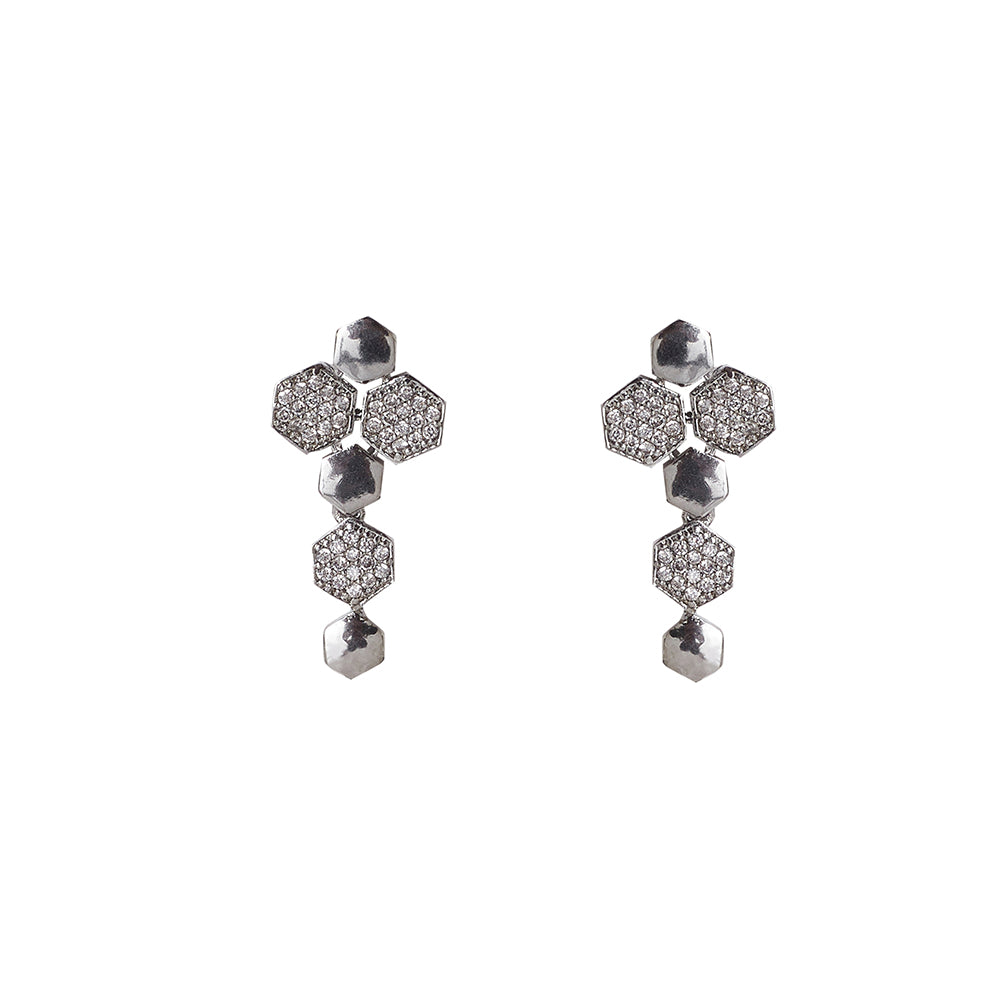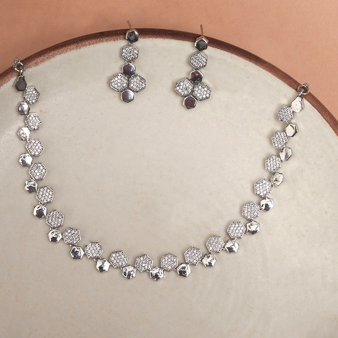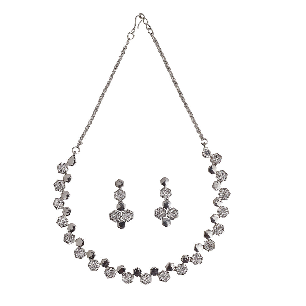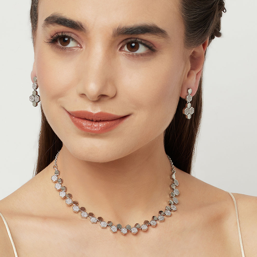 A versatile jewellery set, fashioned out of quality brass and embellished with tiny, round cut cubic zirconia gemstones. Silver plating adds to the charm of this luxurious set, which can be paired with just about everything.