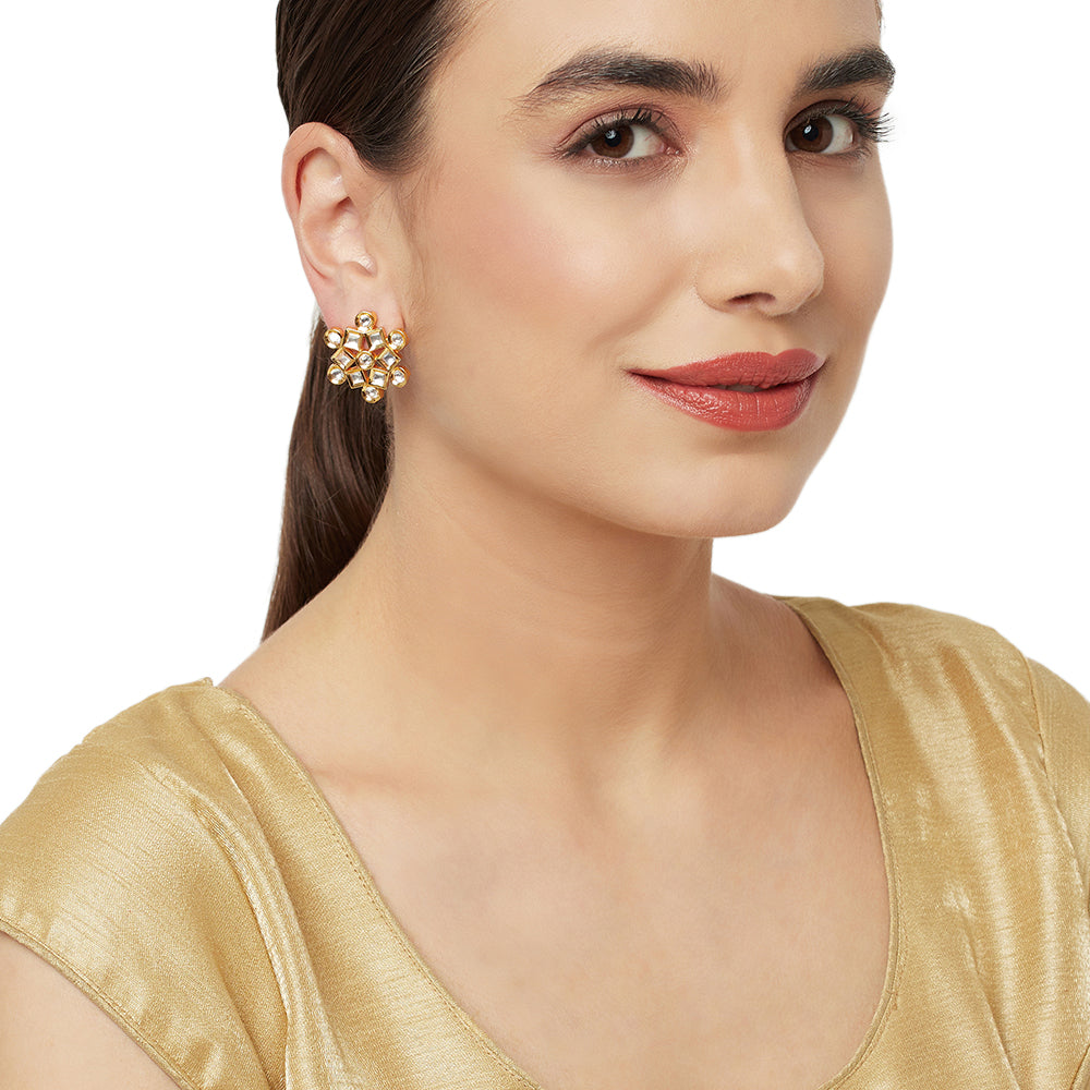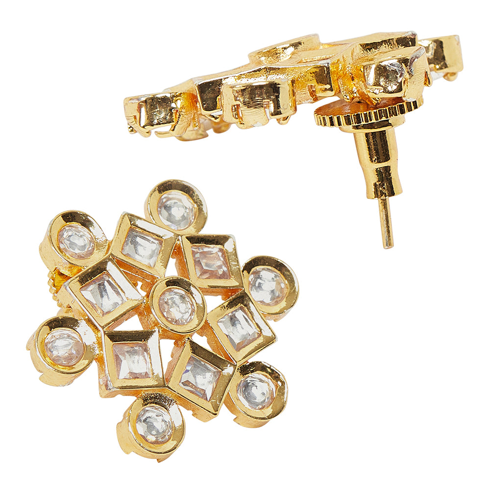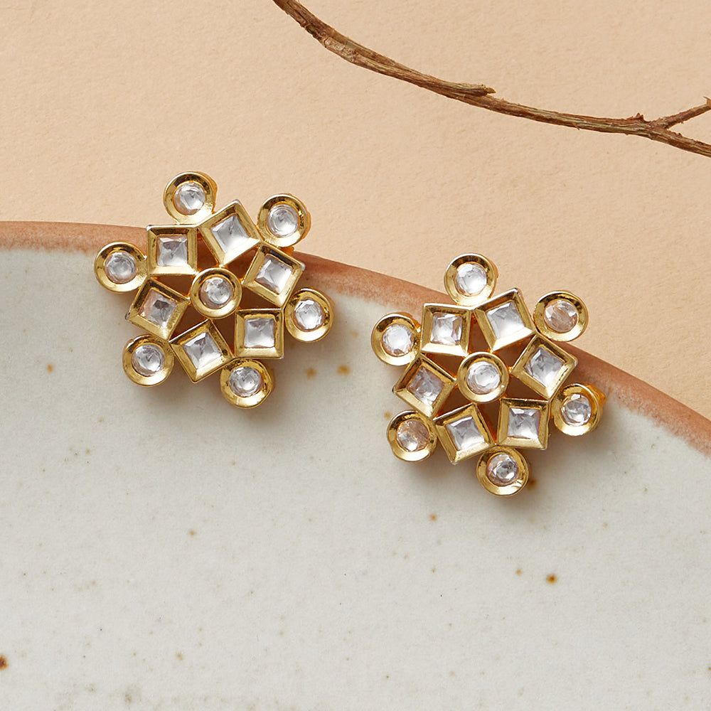 Faux kundan gemstones in a square cut adorn these stud earrings, which have been fashioned out of brass. Classic yellow gold plating adds to the charm of this lightweight pair, which is versatile enough to be worn with Indian and Indo-Western looks of all kinds.