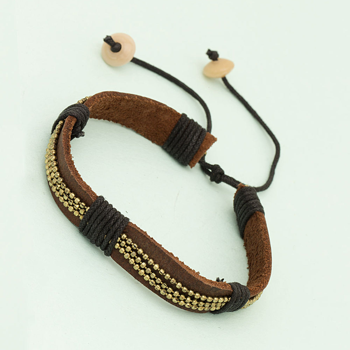 brown pu leather bracelet adorned with twisted black thread and tiny golden beads