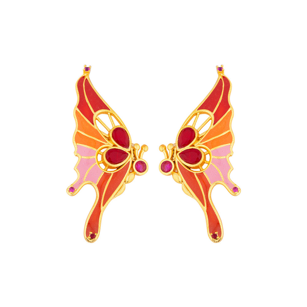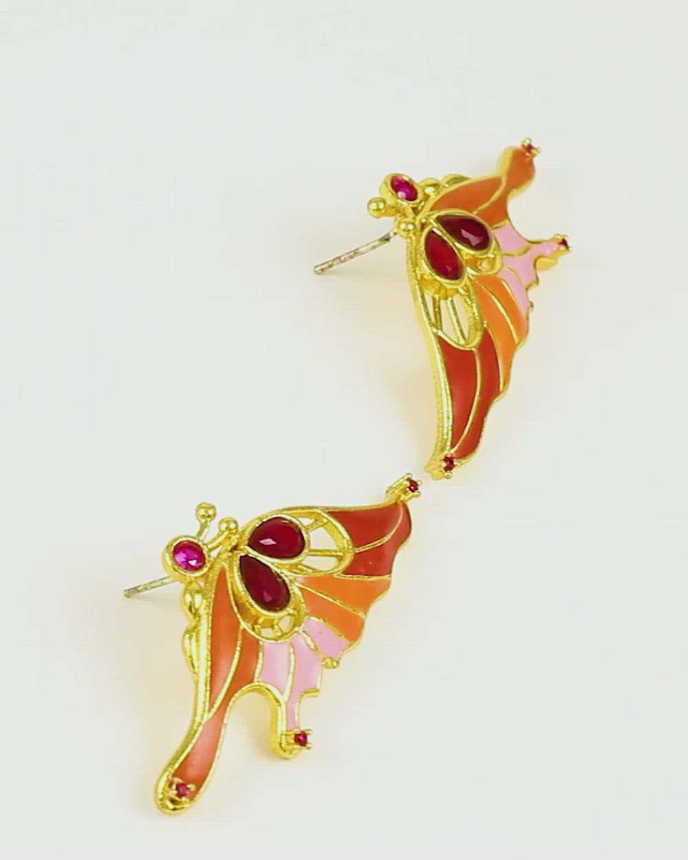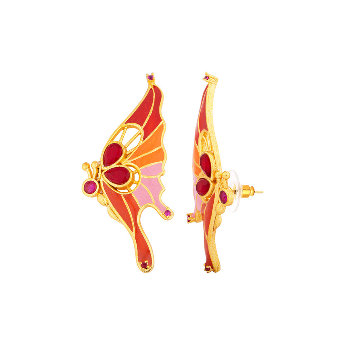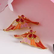 Butterfly inspired motifs earrings made from brass. Dye gold plated and enameled. Pair with casual attire.