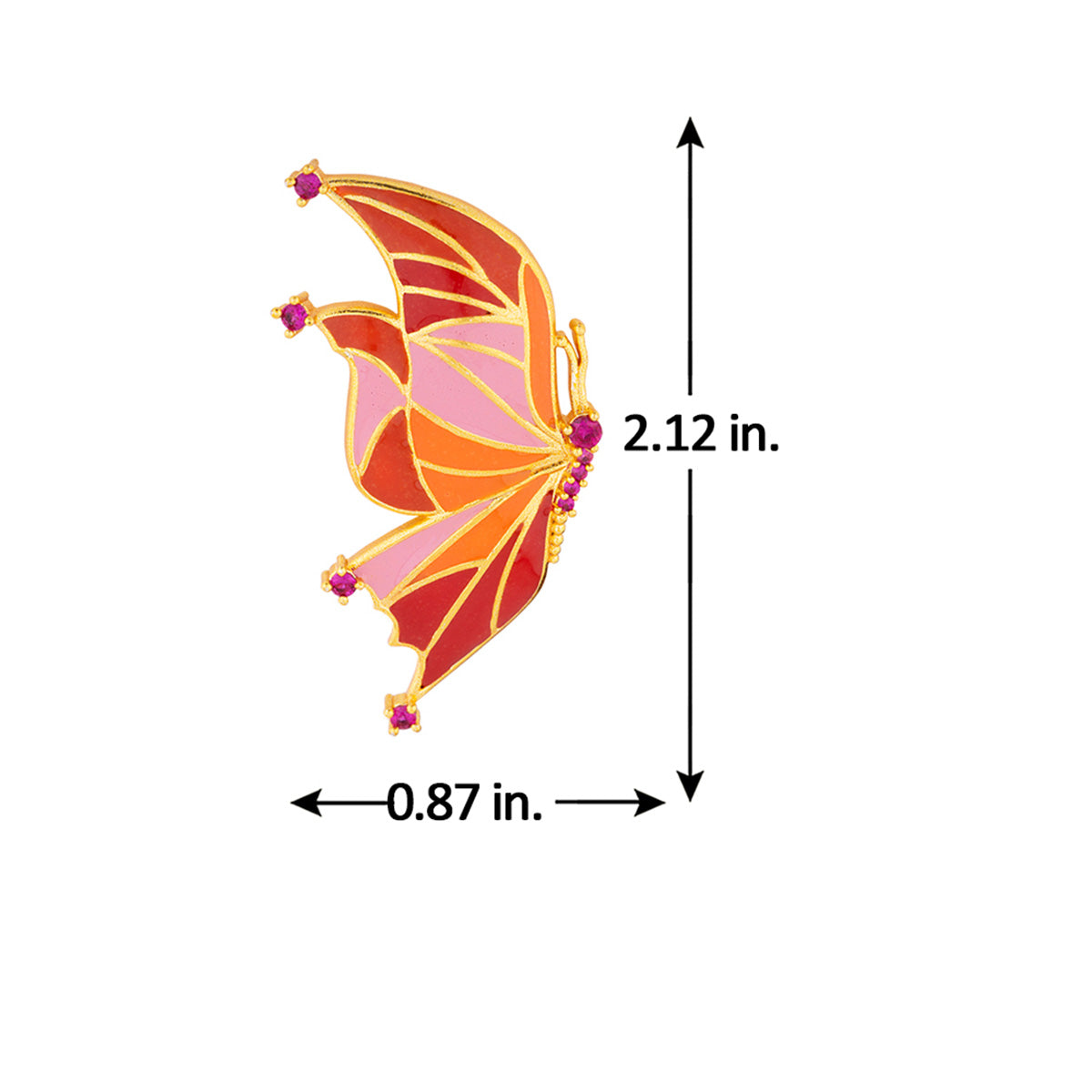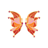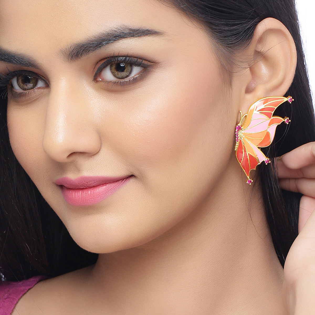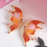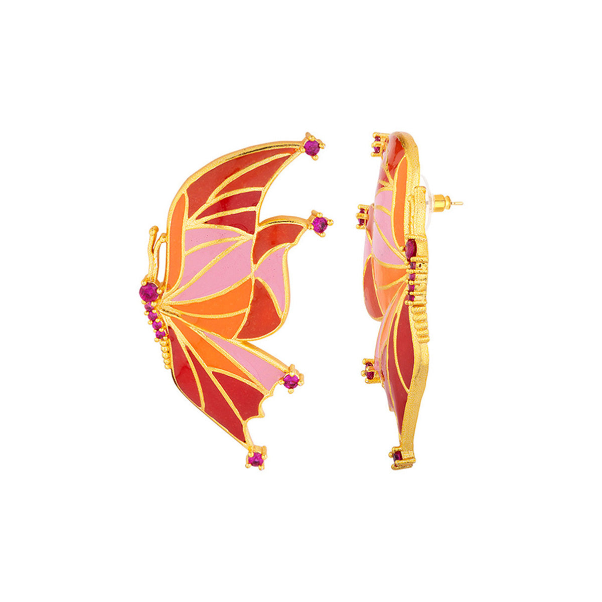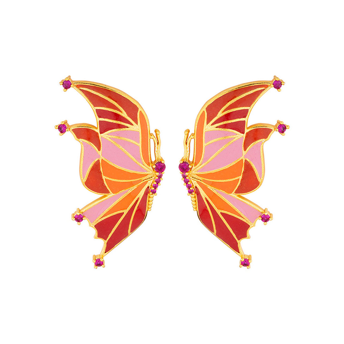Butterfly motif earrings with coloured enamel. Made from brass and dye gold plated. Lightly embellished and good for formal and everyday wear.