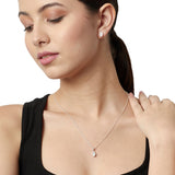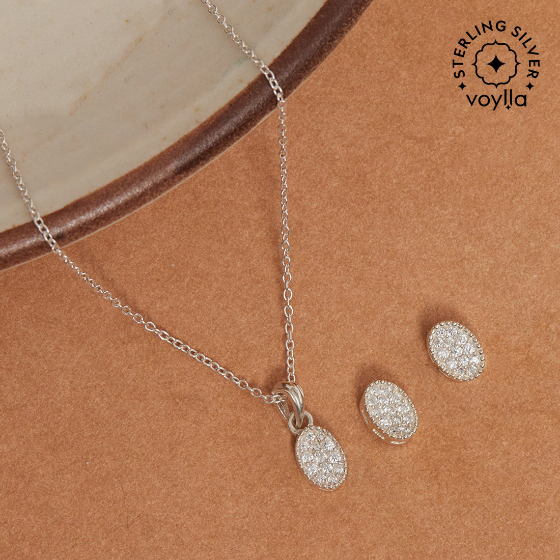 Elegance never goes out of style. A stylish and trendy pendant/ear-studs set in 925 Sterling Silver studded with high quality, sparkling Cubic Zirconia will serve you as a staple in your collection for years to come..?This tasteful women's pendant and earring set is versatile enough to complement a wide range of outfits.
