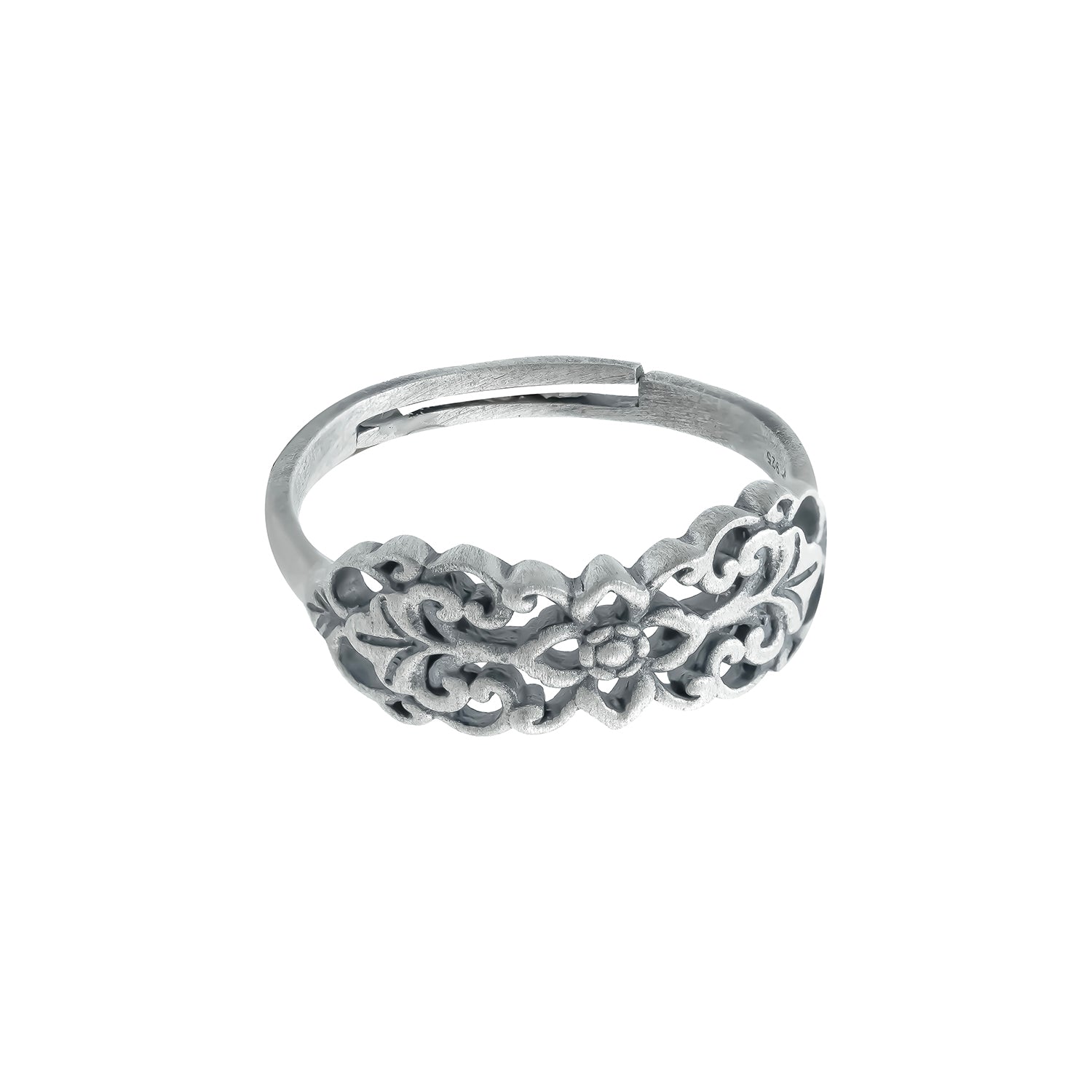 Inspired by delicate floral carvings found in hidden caves, the Cave Chronicles Floral Embellish Dangle Ring is a refined silver ring for women that blends organic beauty with modern craftsmanship. Crafted from premium 925 sterling silver and finished with silver e-coating plating and a soft matte finish, this ring for women showcases intricate floral detailing in a beautifully sculpted openwork band. The floral motif sits gracefully within flowing vine-like patterns, creating depth, texture, and a soft statement that feels both elegant and contemporary. Designed for daily-wear western styling as well as modern Indo-western looks, this silver ring adds a subtle touch of artistry to everything from casual outfits to festive ensembles. Whether worn as a gift for self or chosen as a meaningful gift for valentines or Valentine’s Day, this ring for woman celebrates individuality, craftsmanship, and timeless style.