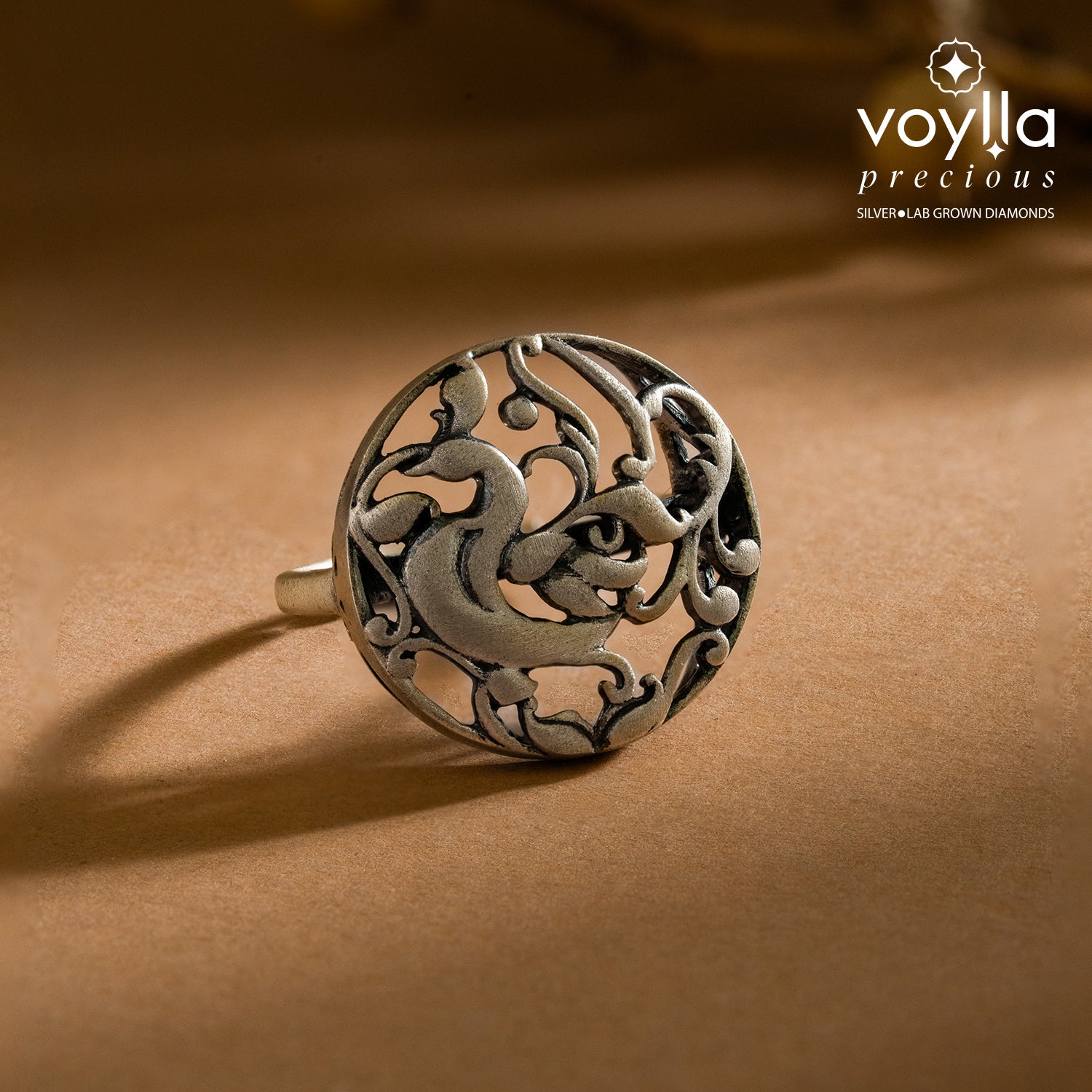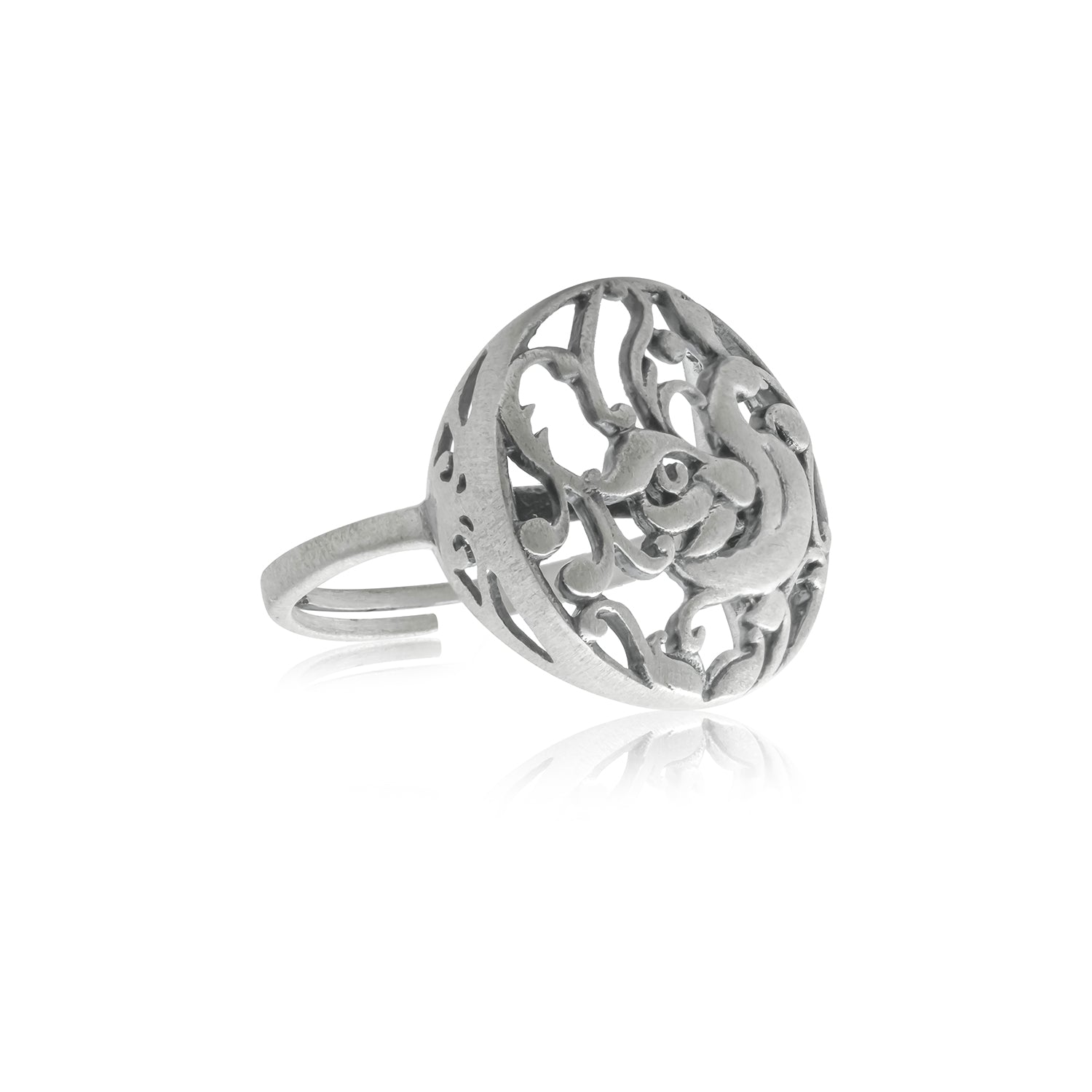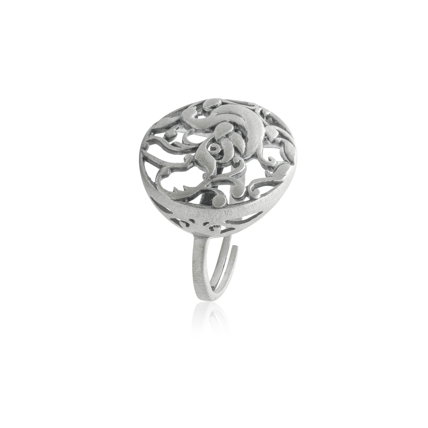 Inspired by the grace and symbolism of the peacock, the Cave Chronicles Peacock Reverie Ring is a striking silver ring for women that blends heritage artistry with modern elegance. Crafted from premium 925 sterling silver and finished with silver e-coating plating and a refined matte finish, this ring for women showcases an intricately sculpted peacock enclosed within a beautifully detailed openwork frame. The peacock, a timeless symbol of beauty, renewal, and confidence, is rendered in flowing lines that create depth, movement, and artistic expression. Designed for daily-wear western styling as well as modern Indo-western looks, this silver ring adds a refined statement to both minimal and festive outfits. Its sculptural silhouette and muted silver tone make it a standout piece that feels powerful yet elegant. Whether worn as a gift for self or chosen as a meaningful gift for valentines or Valentine’s Day, this ring for woman celebrates individuality, grace, and timeless style.