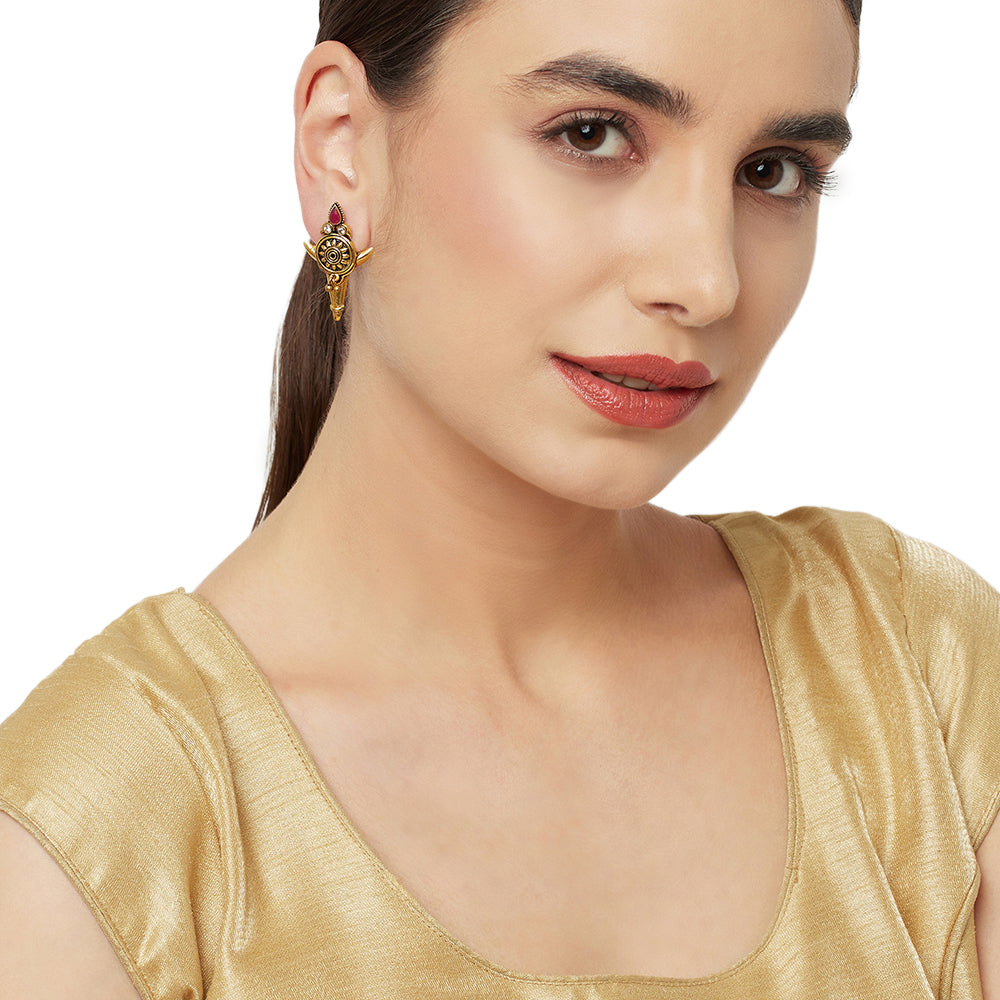 Inspired by classic Bohemian jewellery pieces, these brass earrings have been given a yellow gold plating for added charm. Lightly embellished, the earrings promise to be a comfortable wear and will pair well with Indian and Indo-Western looks.