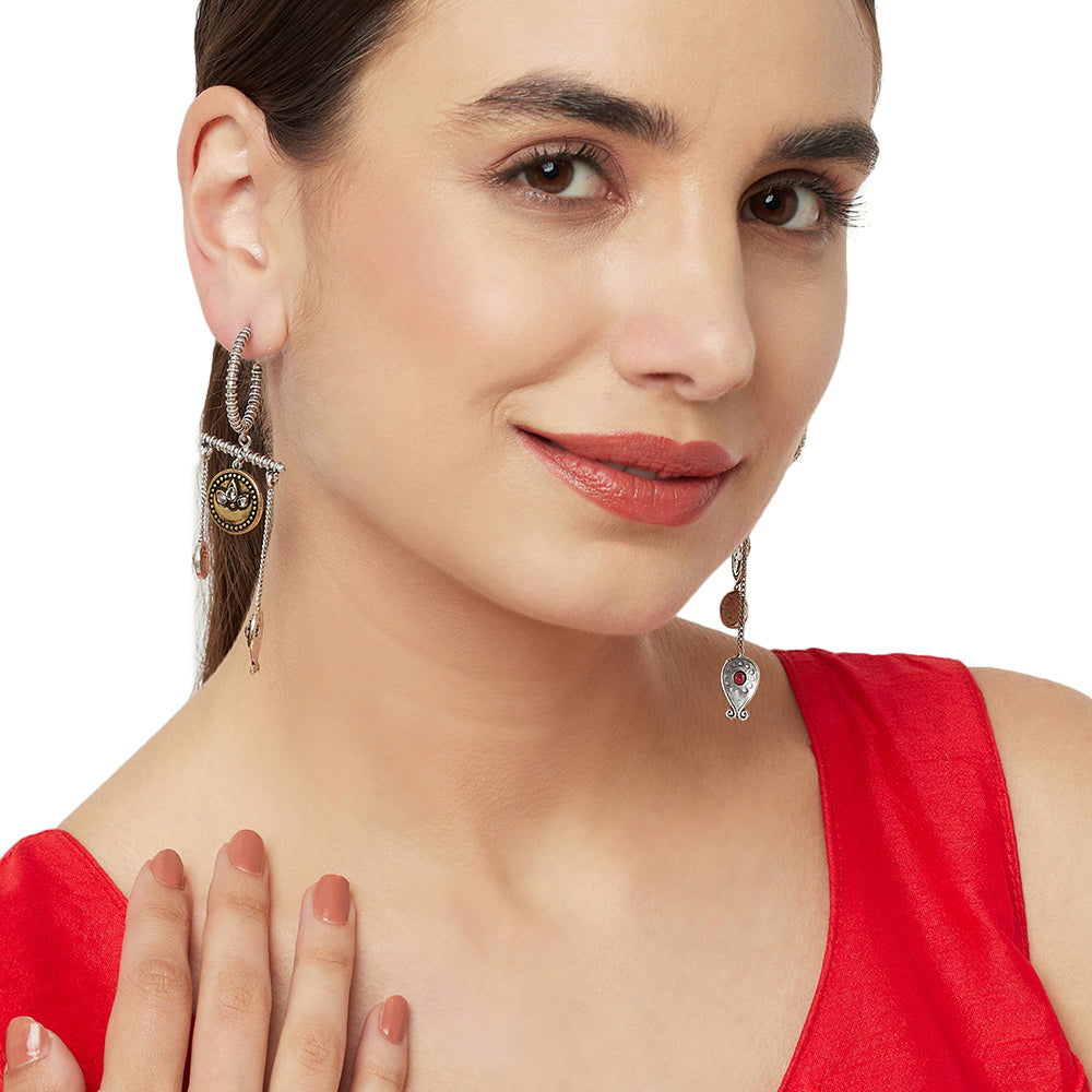 Brass drop earrings, fashioned into an asymmetrical design and featuring a dainty half-moon design. Lightly embellished and silver plated for added charm, the pair is lightweight and comfortable. The earrings will look splendid when paired with a Bohemian outfit.