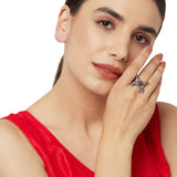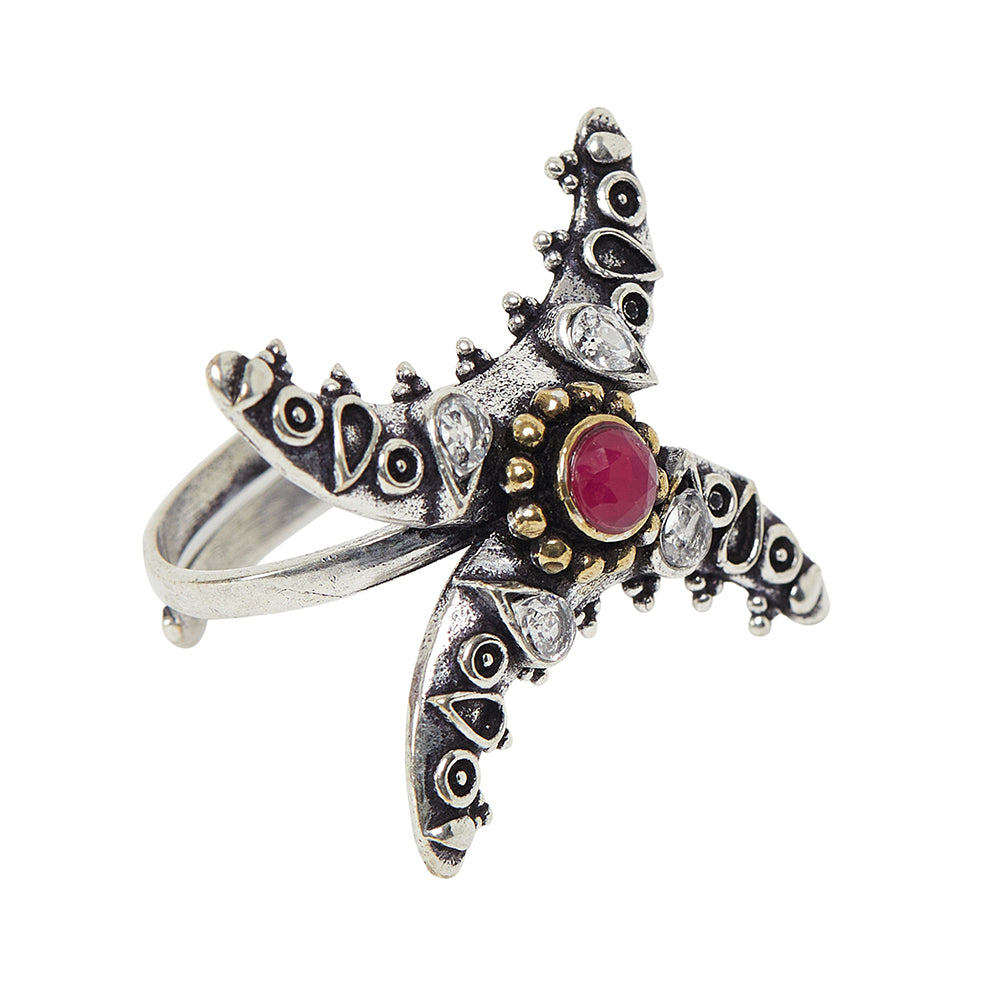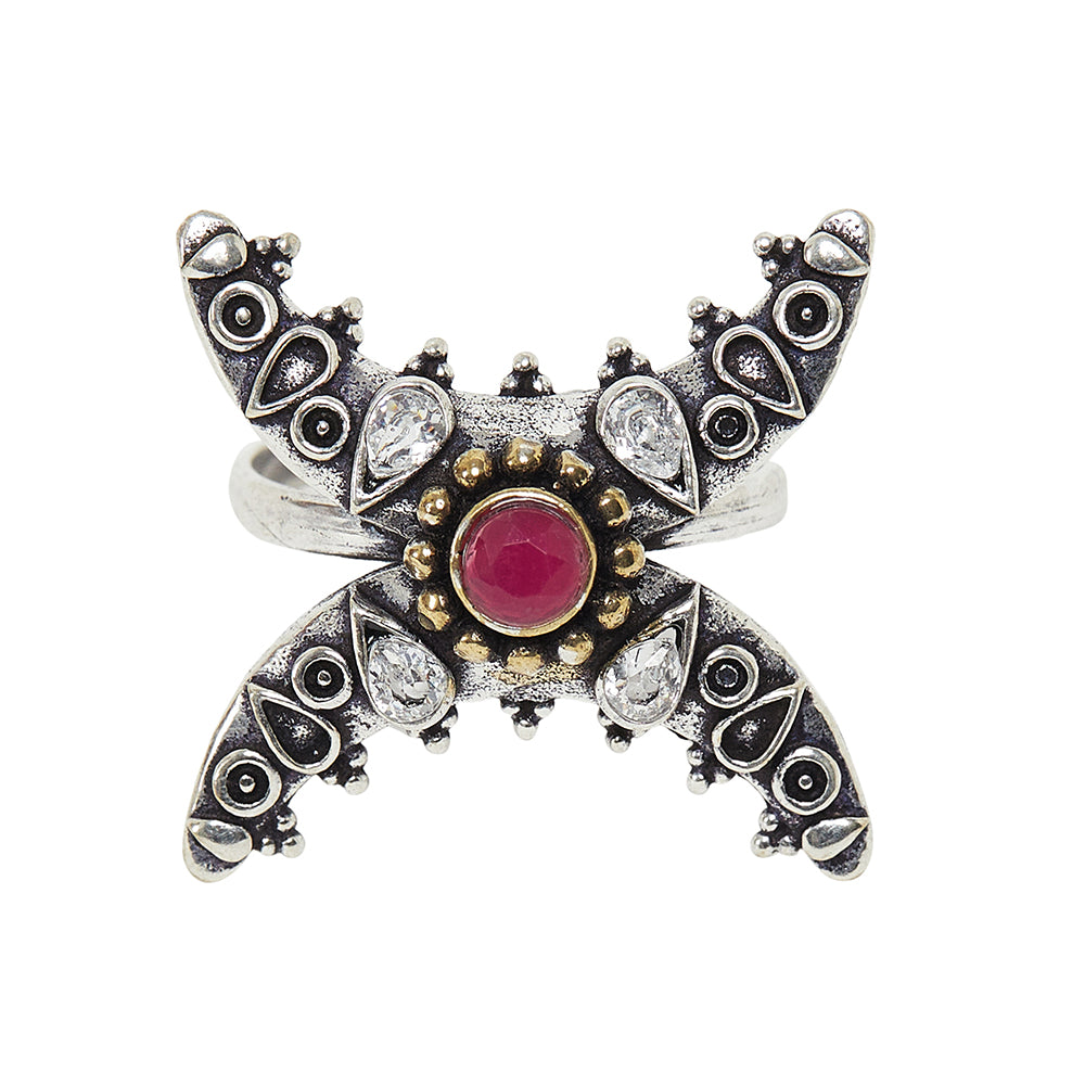 Tribal inspired finger ring, made from brass and featuring a classic silver plating. Embellished with faux kundan gems, the adjustable ring is a comfortable and versatile wear. Pair it with ethnic or Indo-Western looks.