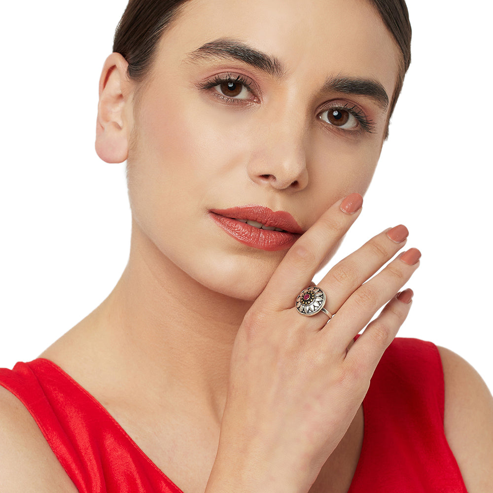 Silver plated ring fashioned from brass into a vintage inspired design. Adjustable for maximum comfort and lightly embellished, the ring will pair well with all your looks and outfits.