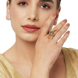 Tribal inspired yellow gold plated ring for women, fashioned out of quality brass. The adjustable ring is comfortable and versatile enough to be paired with just about everything.