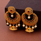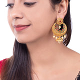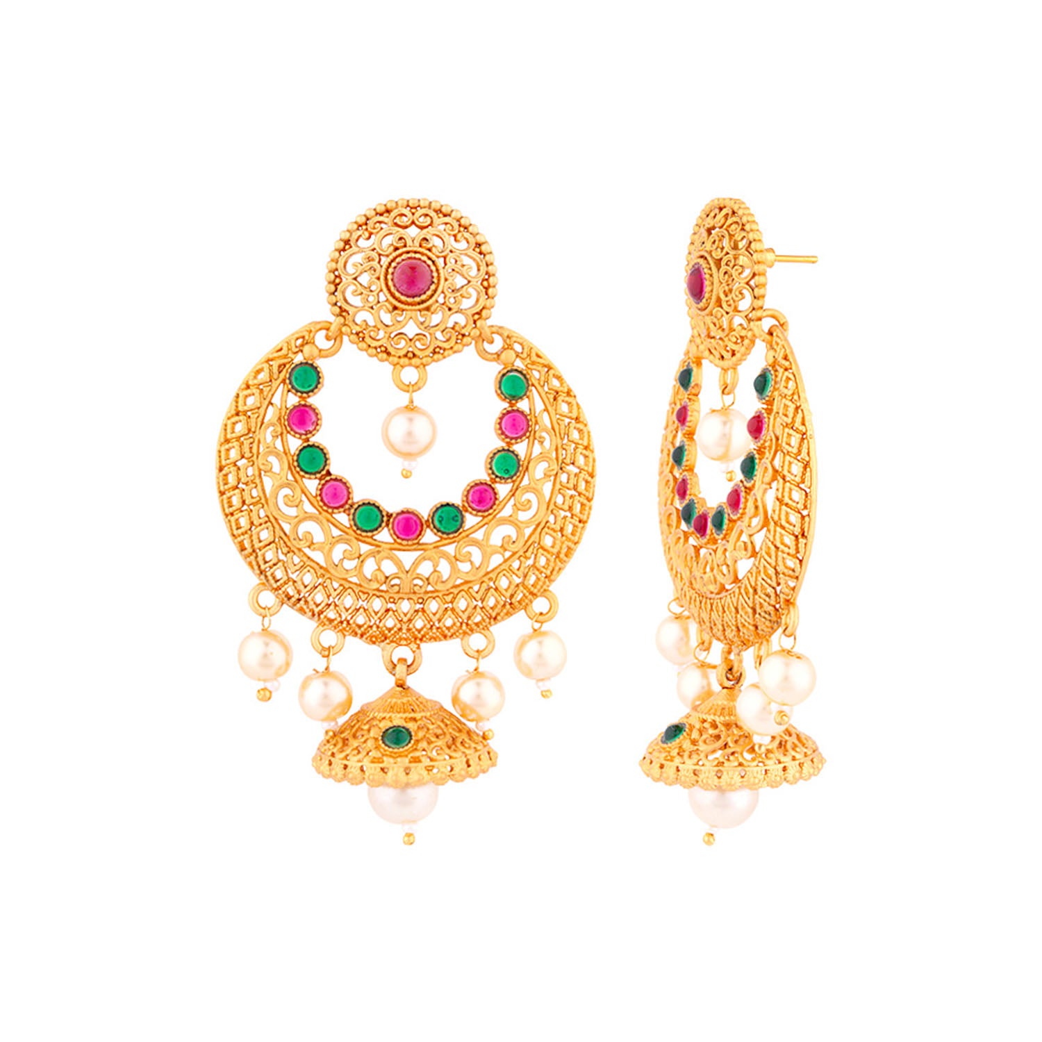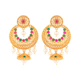 Chandbali earrings with faux pearls and American Diamond gems. Made from brass and yellow gold plated. Wear the drop earrings with a traditional kurta.
