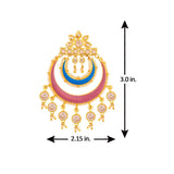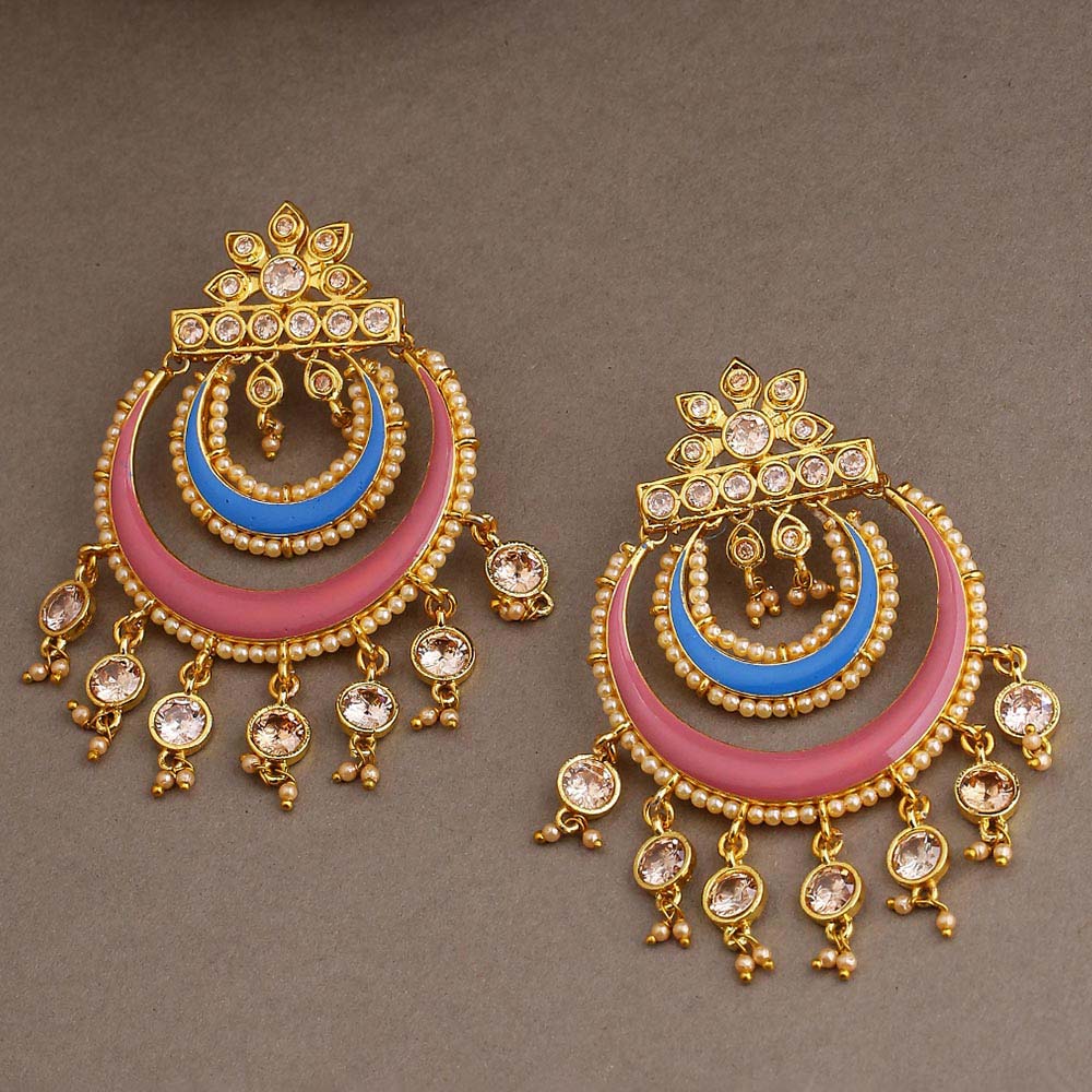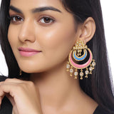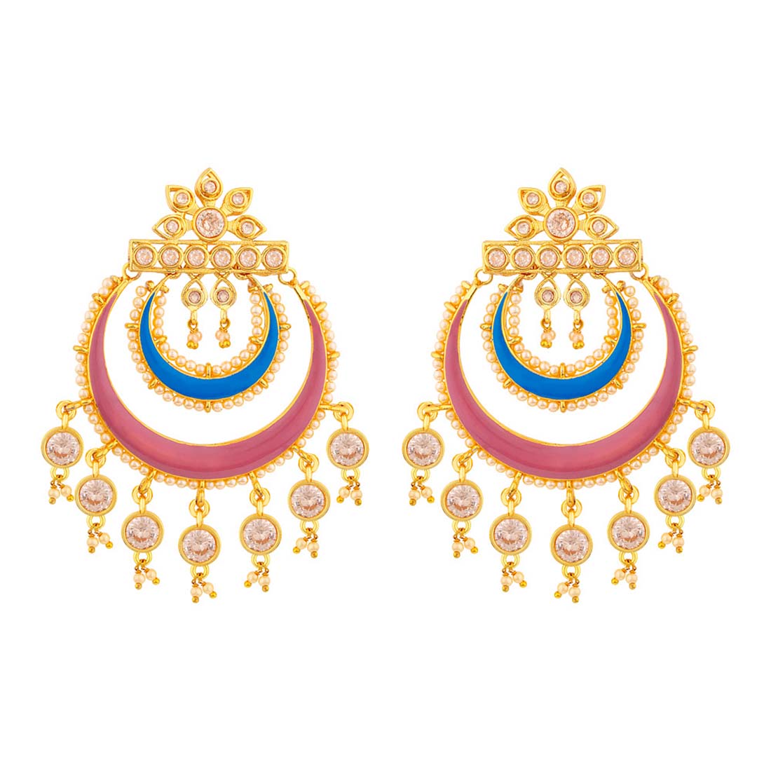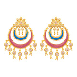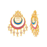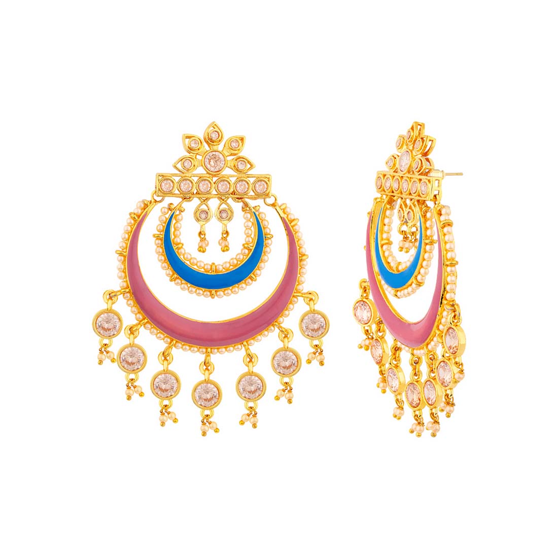 Layered ethnic hoop earrings made from brass. Enameled and yellow gold plated, the pair has been embellished with American Diamond gems. Wear with a traditional silk saree.