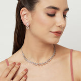 Fashioned from brass into a circular design, this jewellery set has been given a silver plating for added glam. Embellished with CZ gems, the drop earrings and necklace are comfortable, lightweight and versatile.
