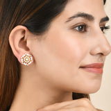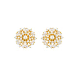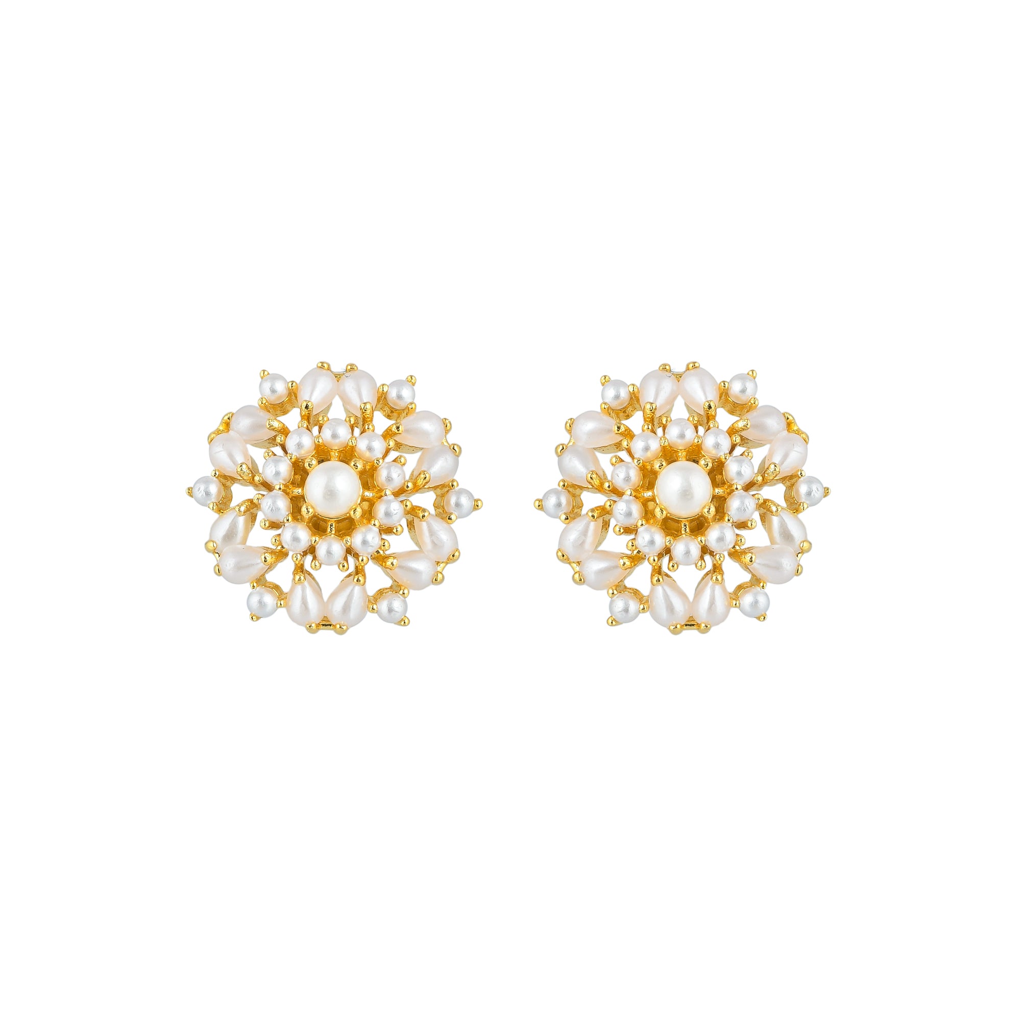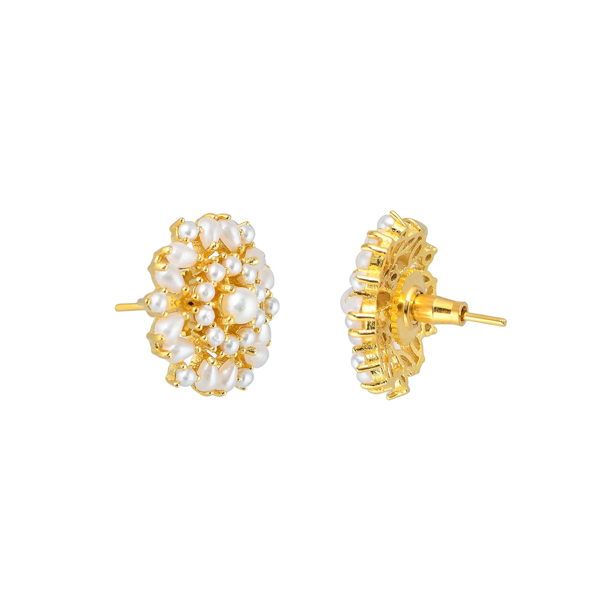 Traditional style white pearl beaded round stud earrings. Gold plated and crafted from brass. A good match for Indian looks.
