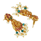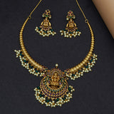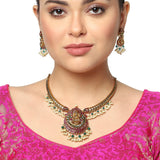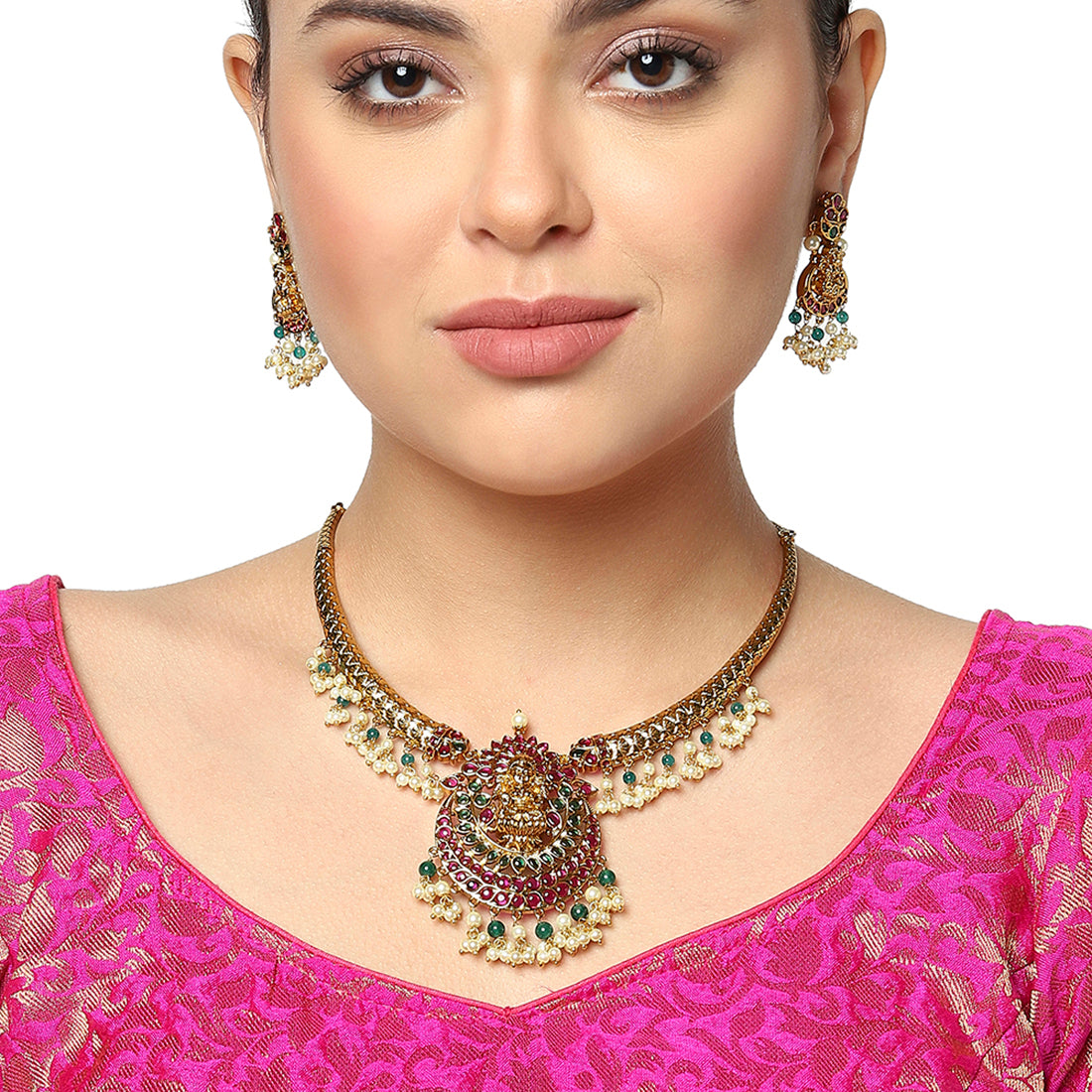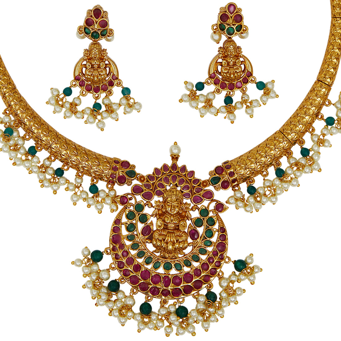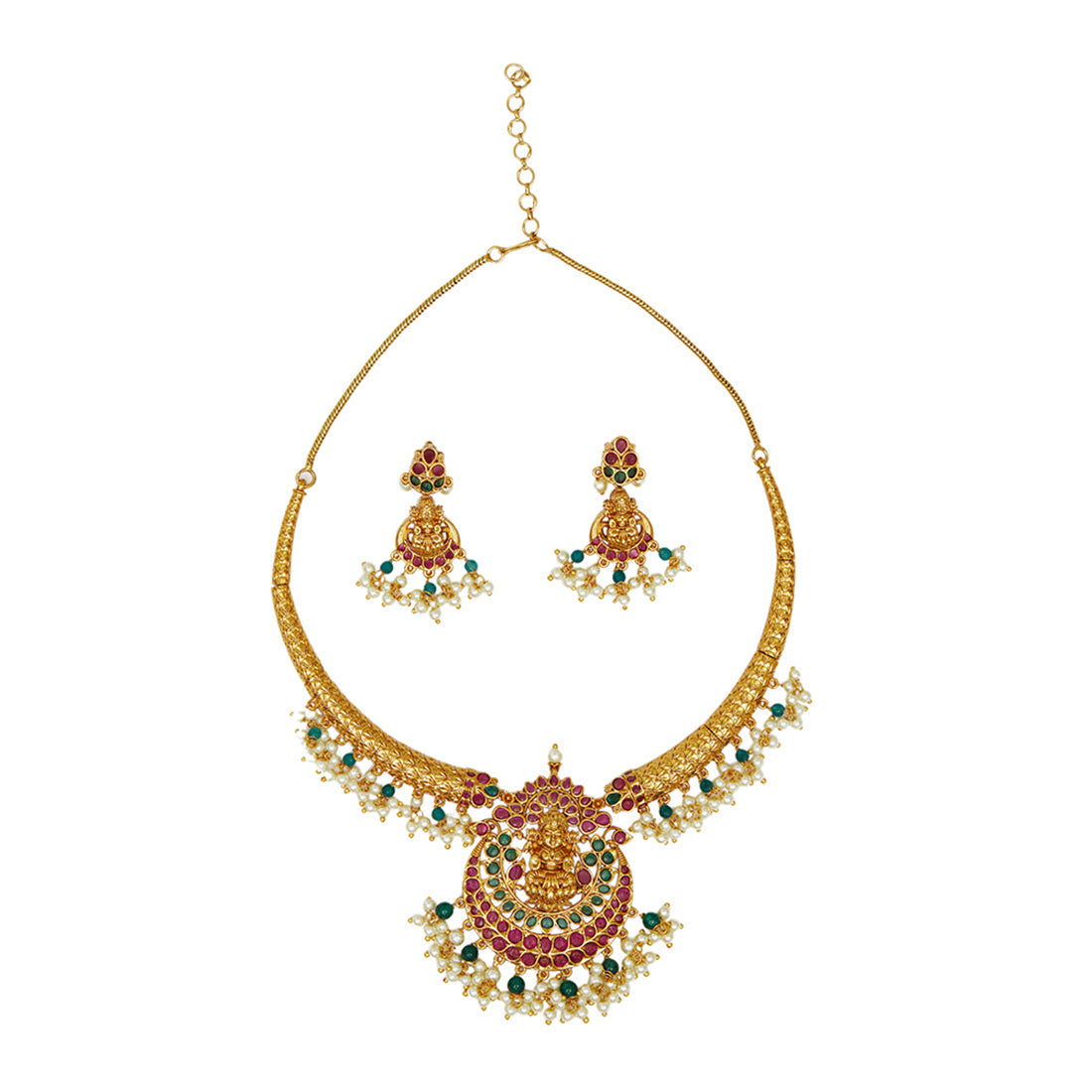 Traditional jewellery set, fashioned out of quality brass. Yellow gold plated and embellished with cluster faux white pearls, the necklace and drop earrings are lightweight and comfortable. Pair the versatile set with formal ethnic or Indo-Western looks.