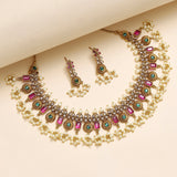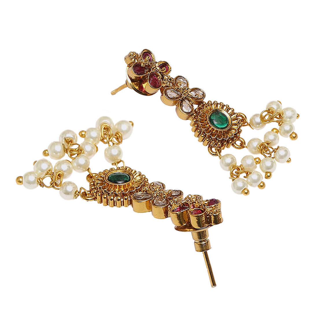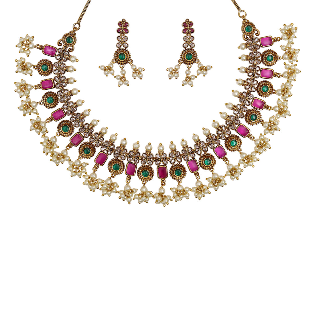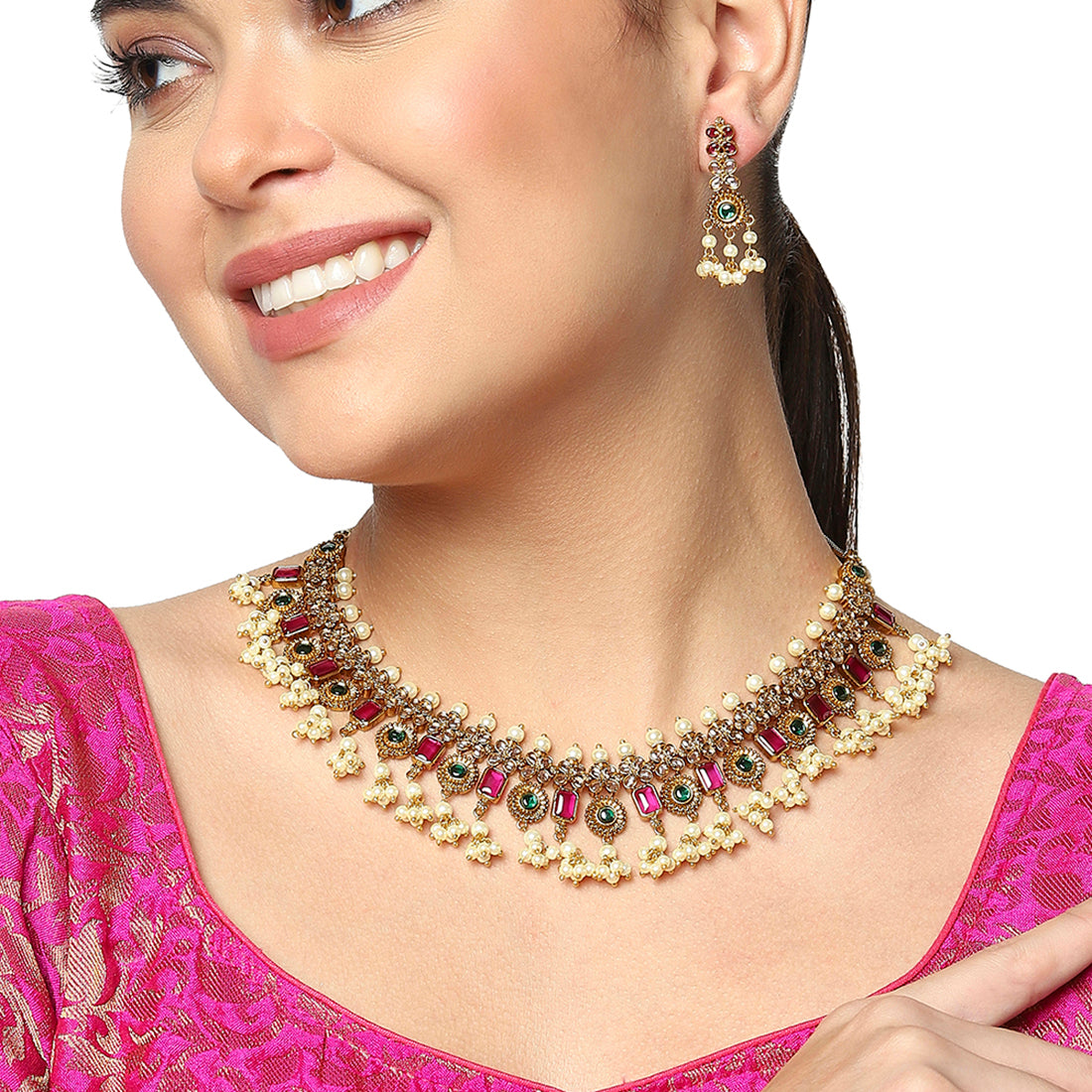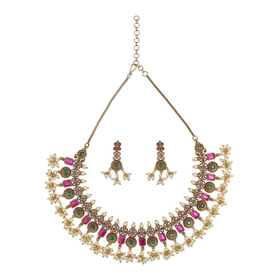 Embellished with faux pearls and cubic zirconia gemstones in a classic cluster setting, this jewellery set has been crafted from quality brass. Yellow gold plating adds to the opulent charm of the necklace and earrings, which are lightweight and comfortable. The set will look splendid with formal ethnic attire.