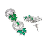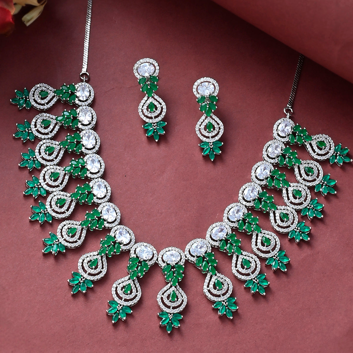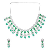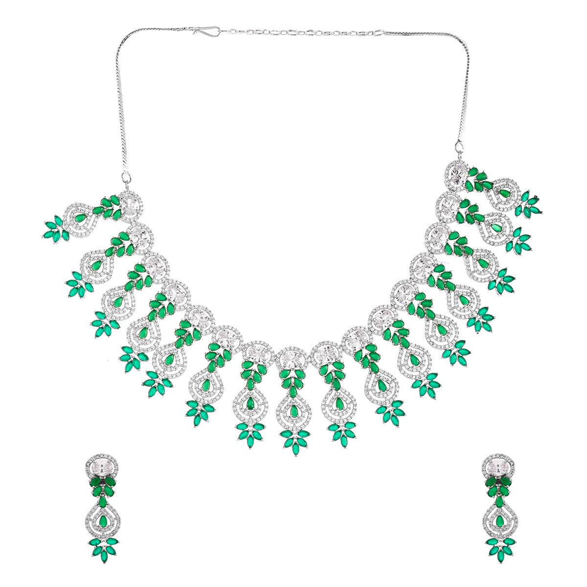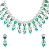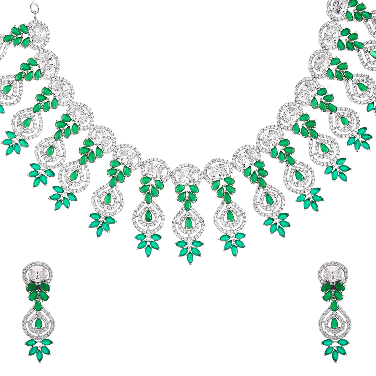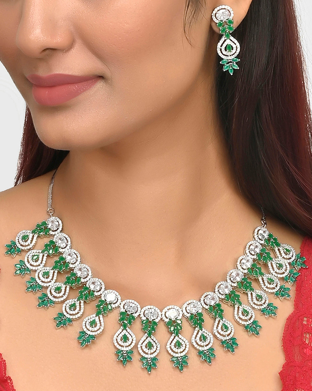 A luxurious jewellery set adorned with green and white cubic zirconia gemstones in a cluster setting. The choker necklace and drop earrings have been fashioned out of brass. Silver plating adds to the opulence of this set, which can be paired with formal looks of all kinds.