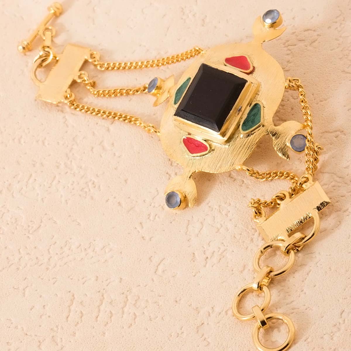 Be the talk of the party with this stunning bracelet. Featuring an intricate design with black onyx and blue stone embellishment with colourful enamel work on a gold-toned surface, this piece is the perfect accessory for a special night out.