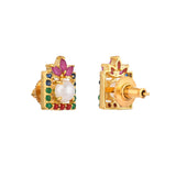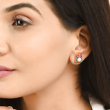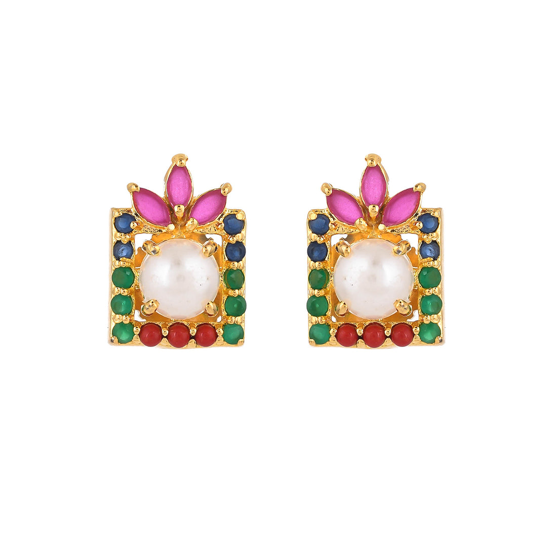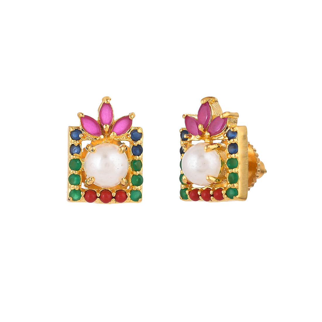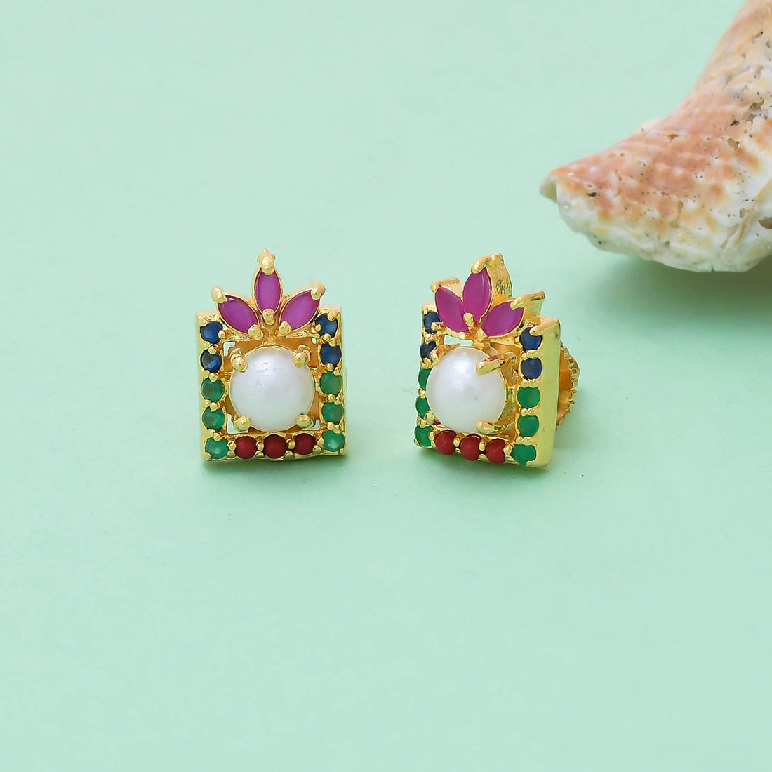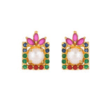 White pearl and coloured CZ gemstones stud earrings. Made from brass and gold plated. Pair with everyday attire.