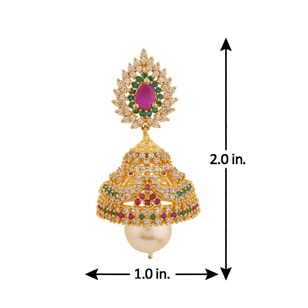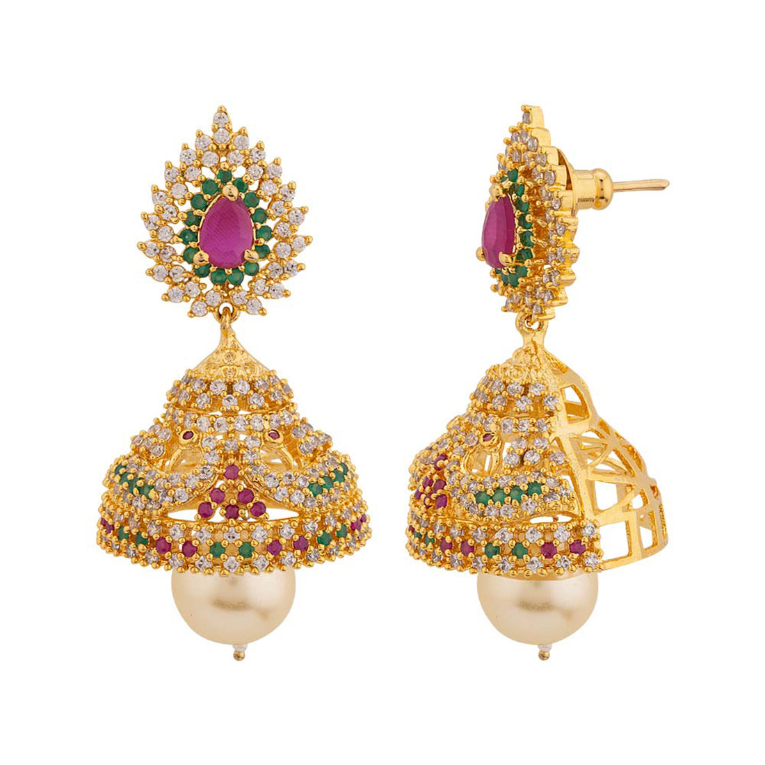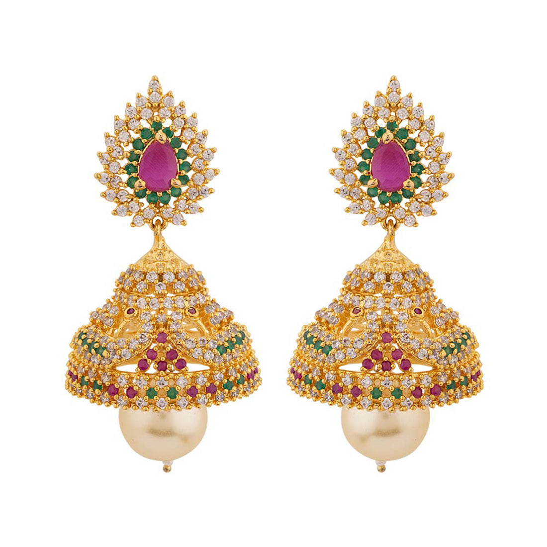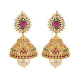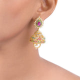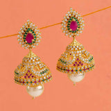 Embellished with coloured gemstones, these jhumka earrings have been crafted from brass. Yellow gold plated and good for everyday and even work wear.