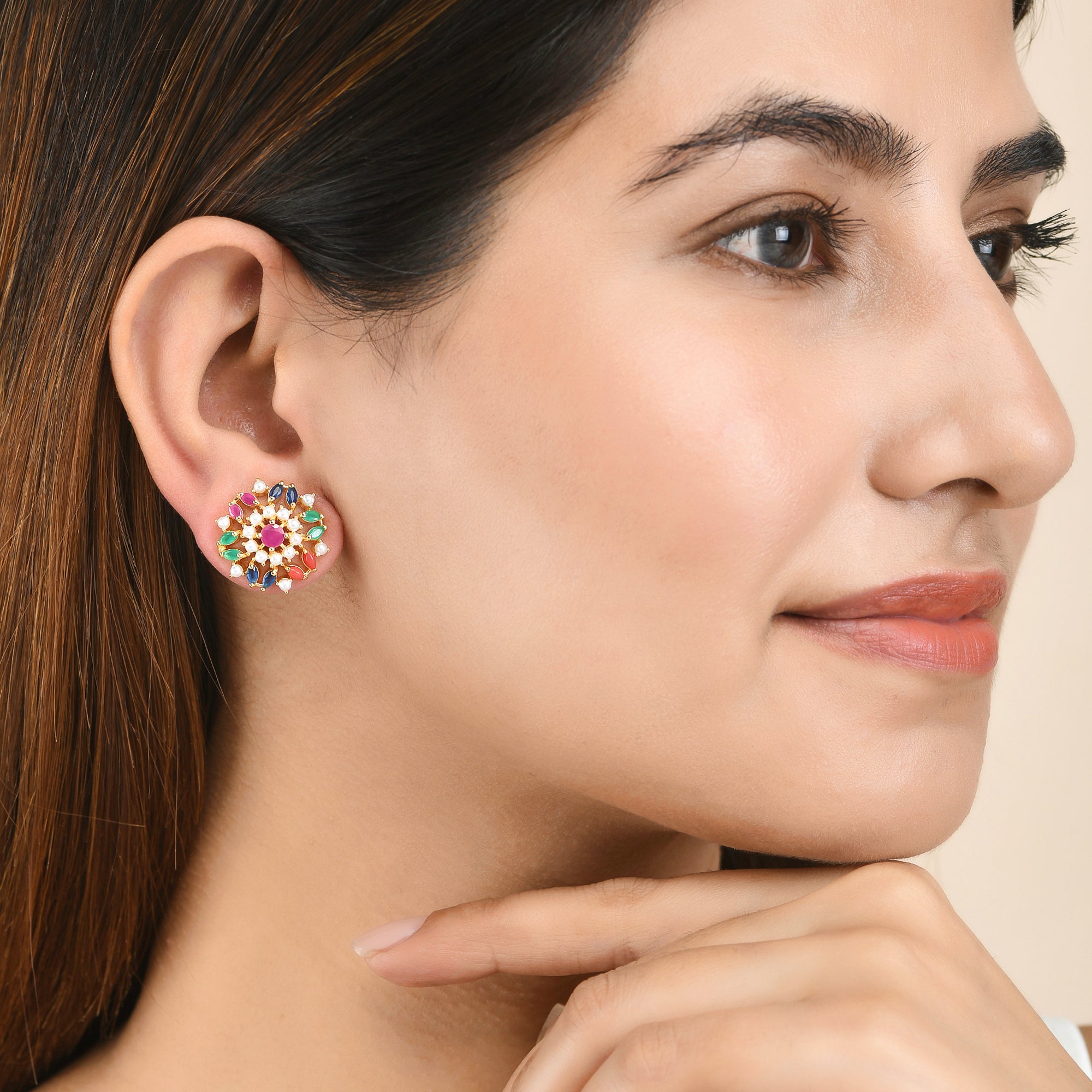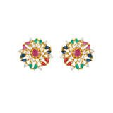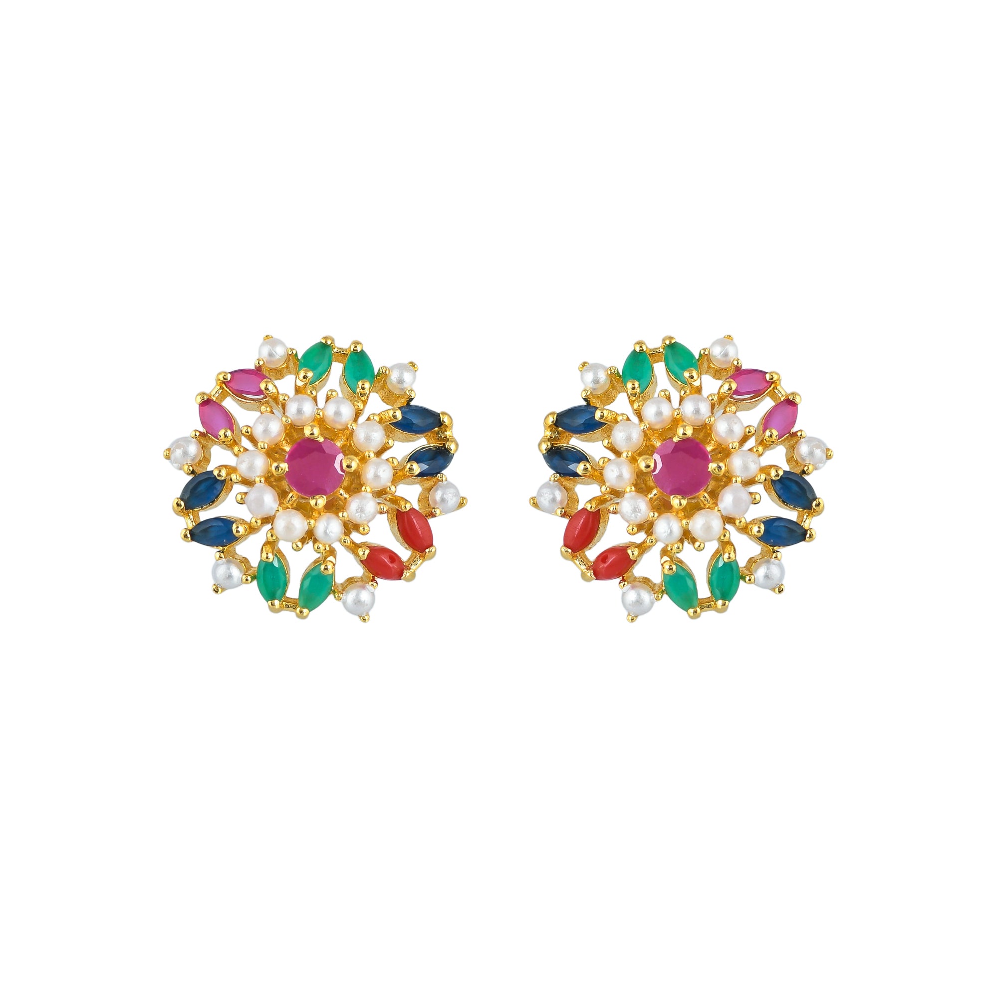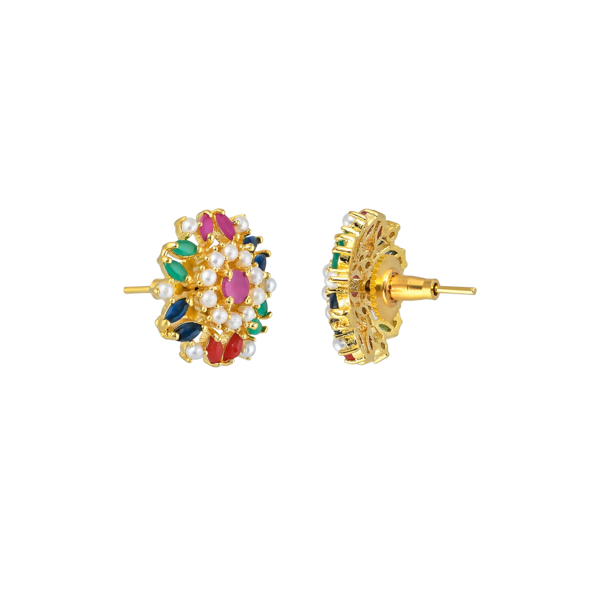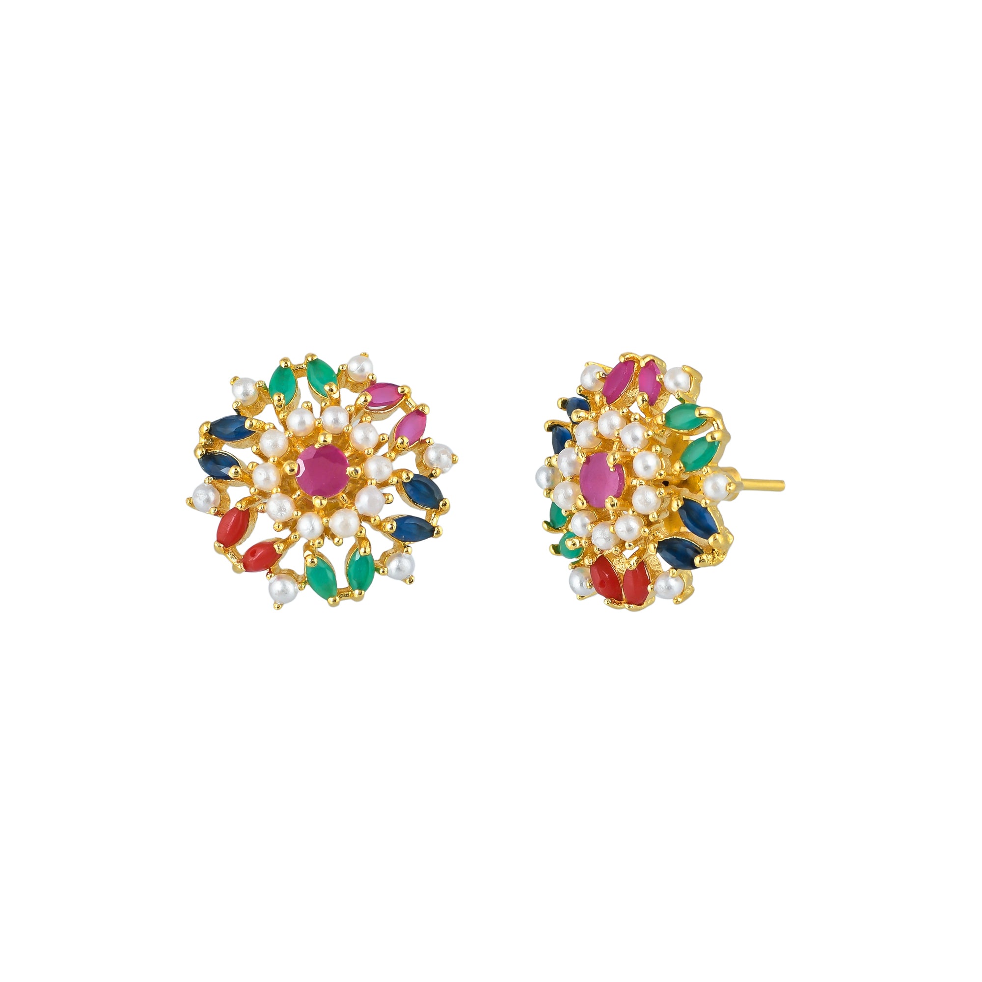 Coloured Zircon Gems and White Pearl Beads Stud Earrings