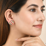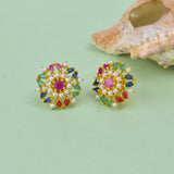 Yellow gold plated stud earrings with coloured zirconia gemstones and white pearl beads. Made from brass. Good for ethnic looks of all kinds.