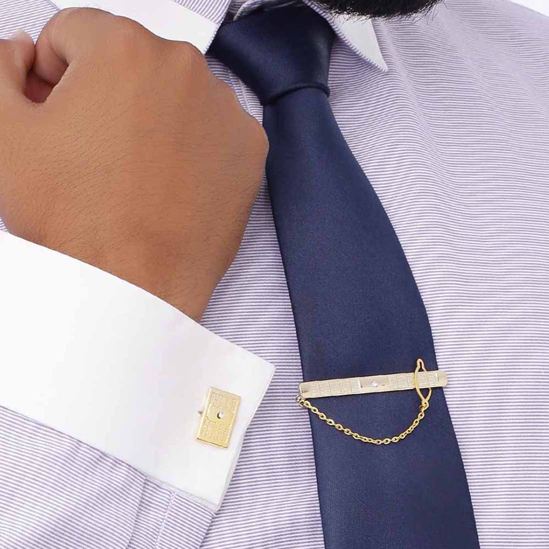 Yellow gold plated cufflink tiepin set fashioned out of stainless steel. A good match for formal looks. To make your accessories last longer avoid harsh chemicals and moisture. Keep dry, clean with dry cloth and wear with panache. "India?s largest fashion jewelry brand DARE, comes from the House of Voylla as a limited edition of handcrafted accessories for the modern Indian men. "