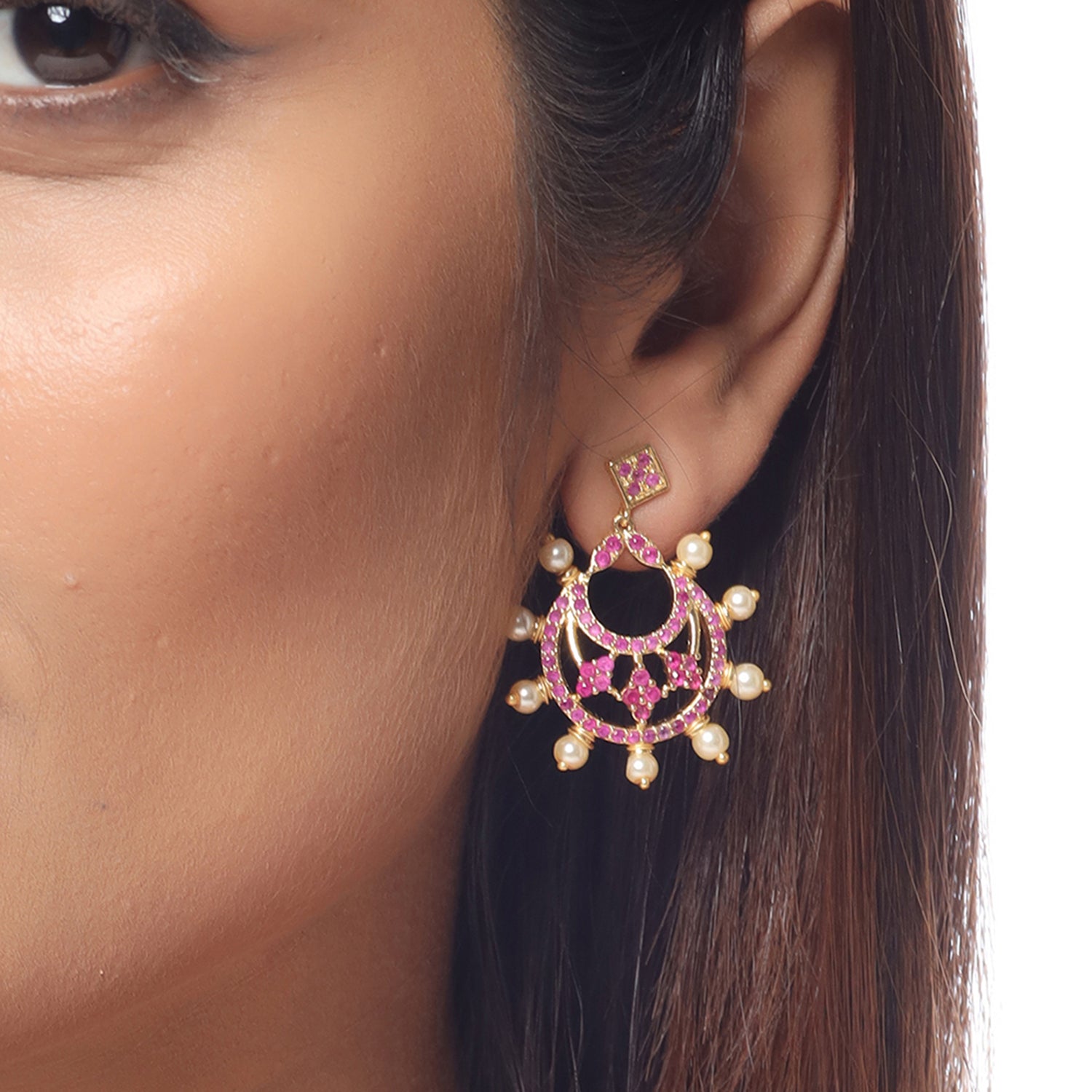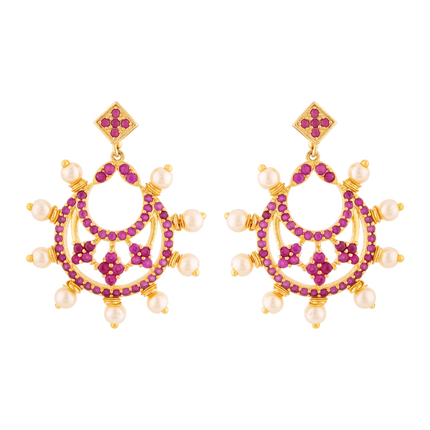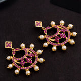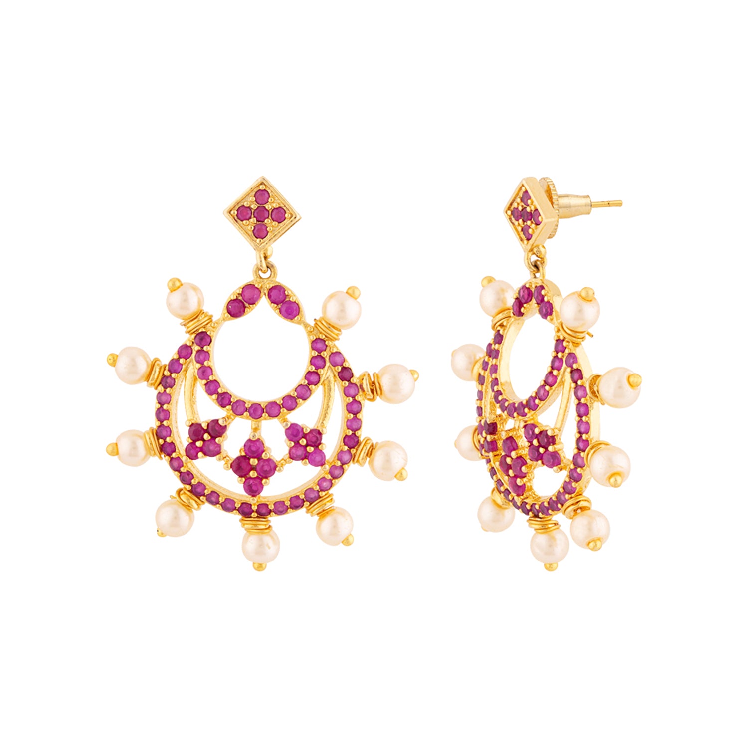 Brass chandbali earrings featuring a classic cutwork design. Yellow gold plated and embellished with faux pearls and American Diamond gems. Wear with a traditional kurta.
