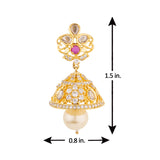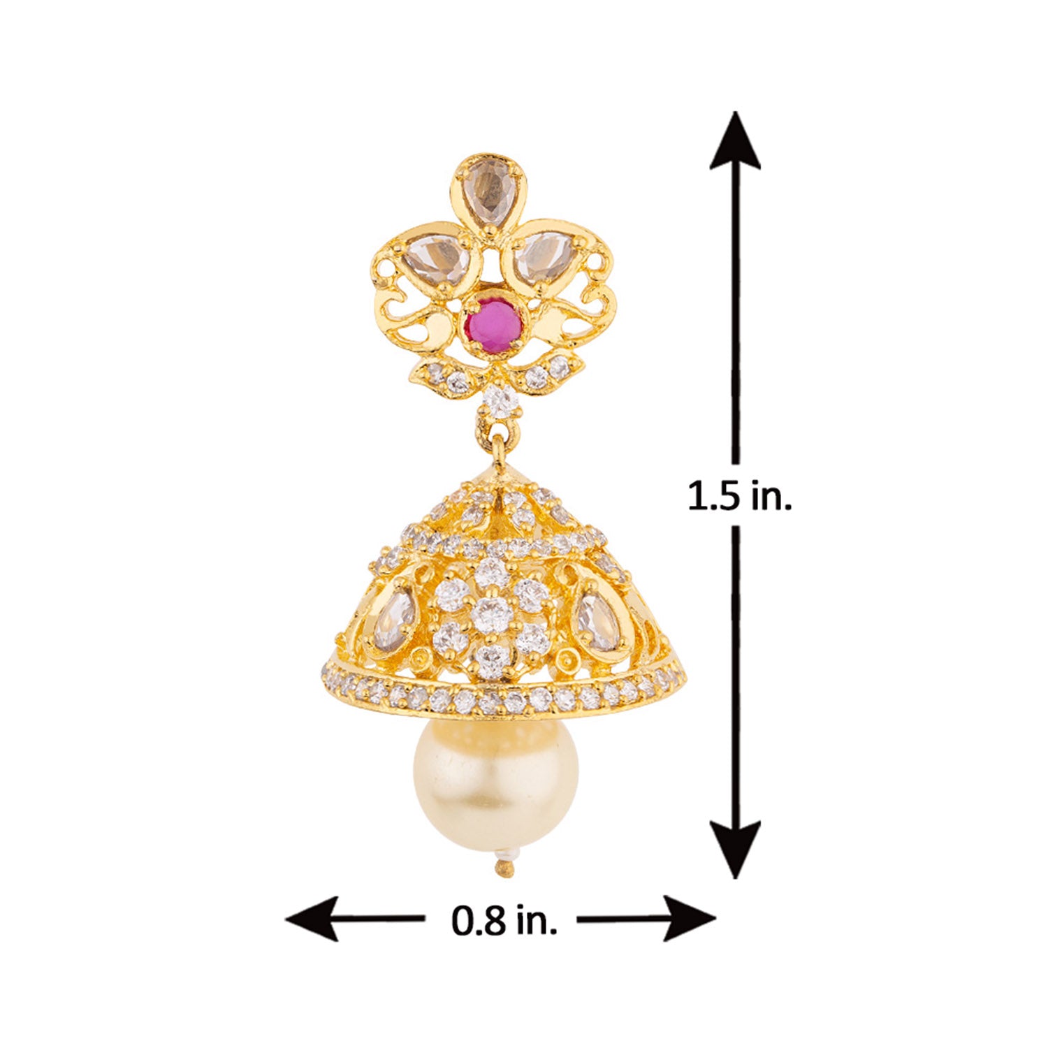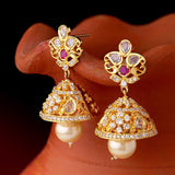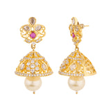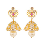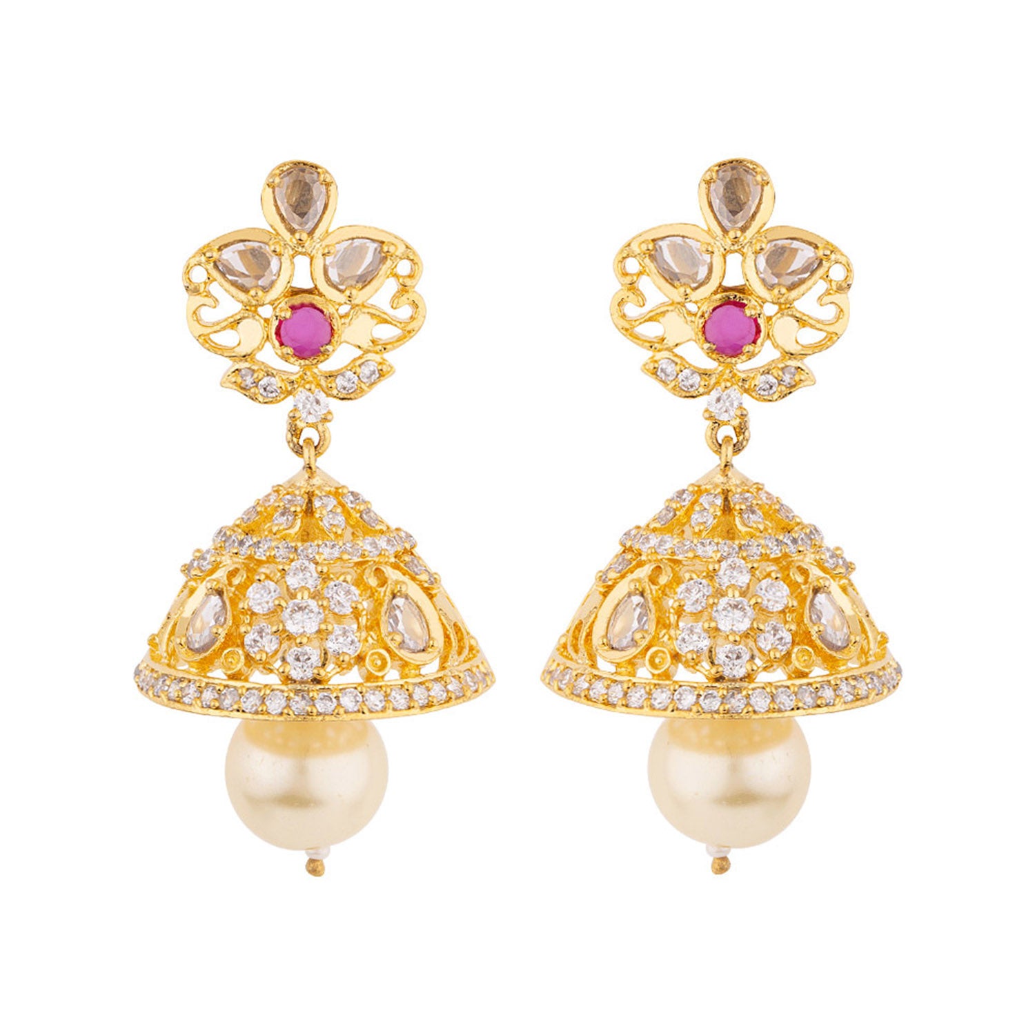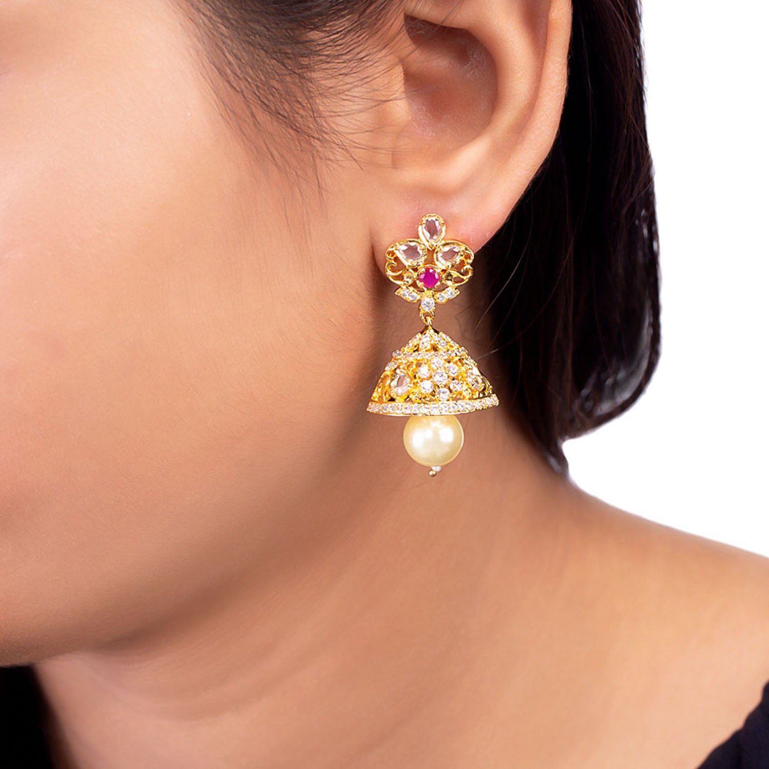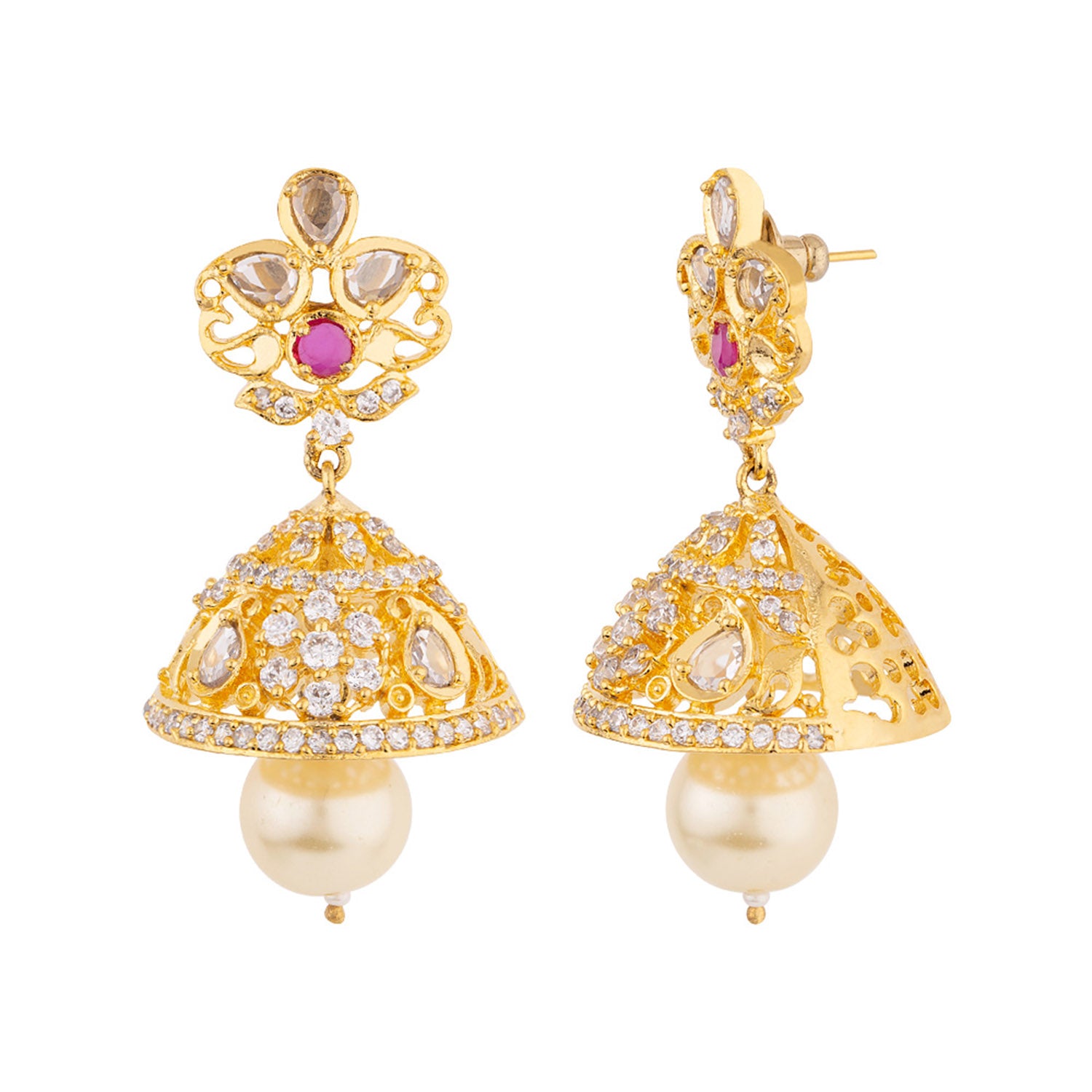 Cutwork design brass jhumka earrings with yellow gold plating. Embellished with American Diamond gems and faux pearls. Wear with ethnic attire.