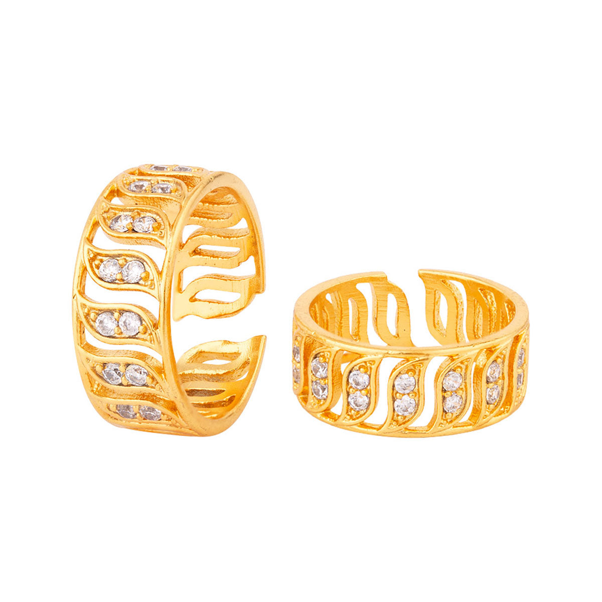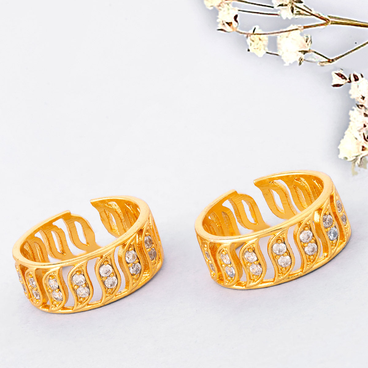 Cutwork pattern brass toe rings with yellow gold plating. Lightly embellished and good for casual looks. This piece of jewelry comes with the Voylla assurance of quality and durability.