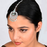 Maang tika made from brass and embellished with zircons in cluster setting. Silver plated for added charm. A comfortable and versatile piece.