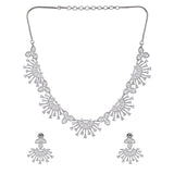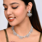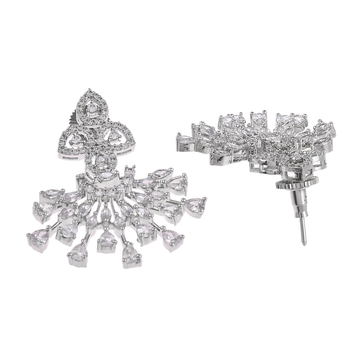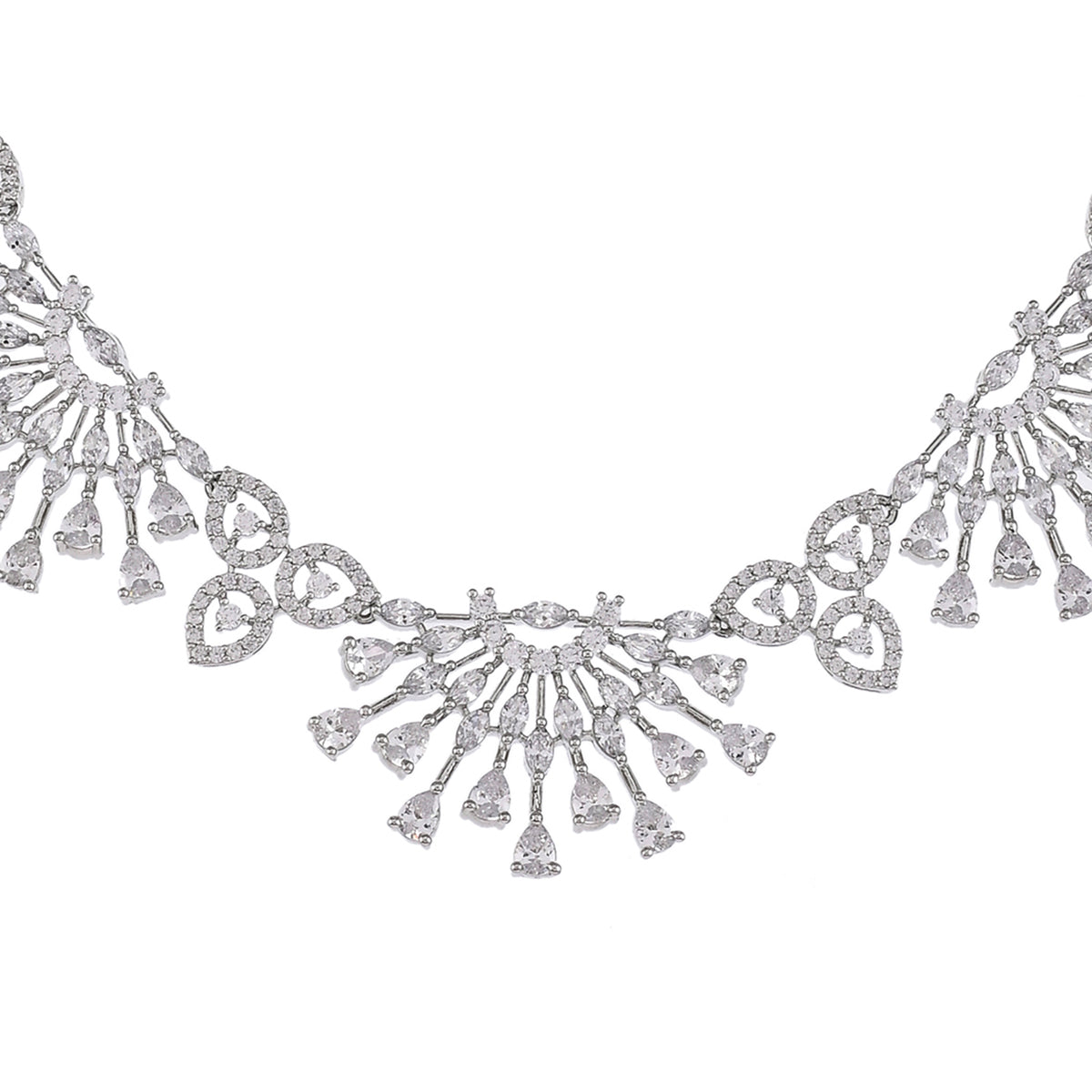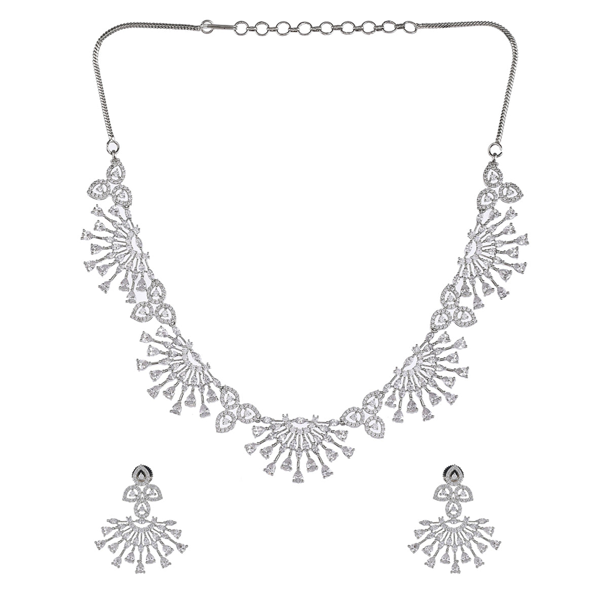 Heavily embellished with zirconia gemstones, this brass jewellery set has been fashioned into an edgy, modern design. Silver plated for added charm. Pair with a designer saree or cocktail dress.