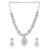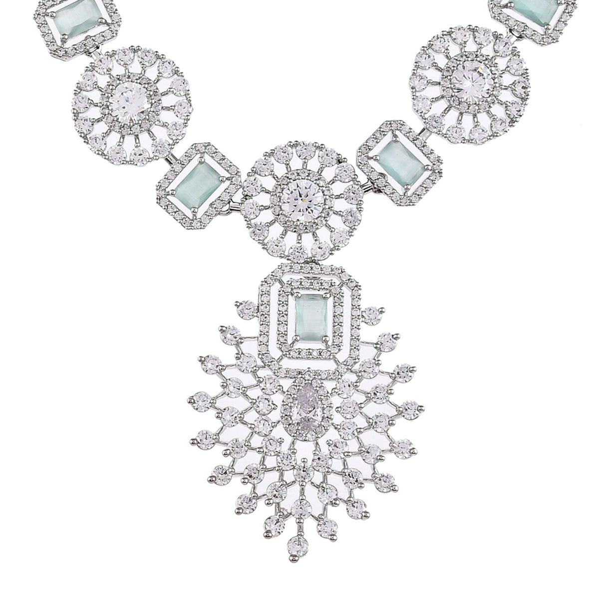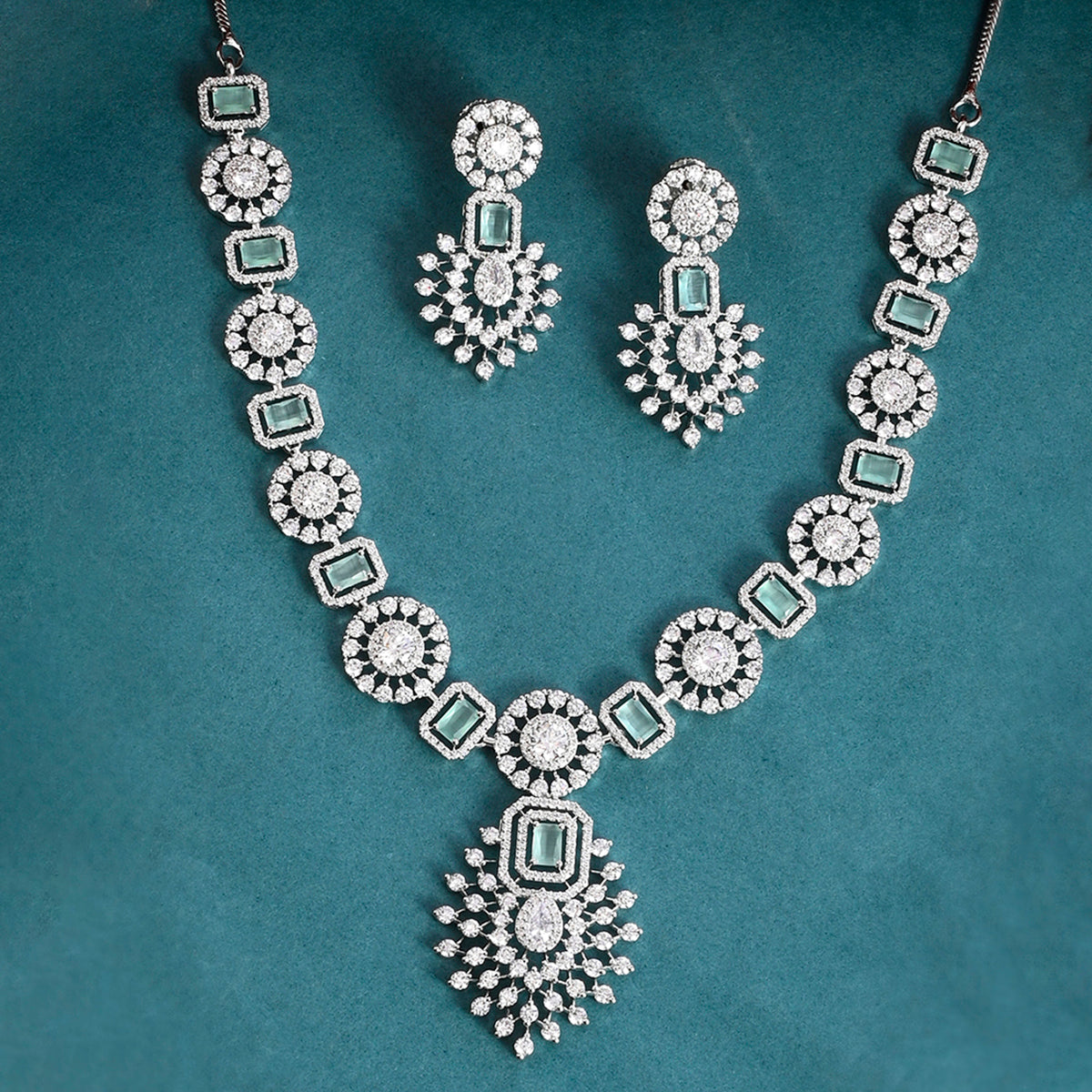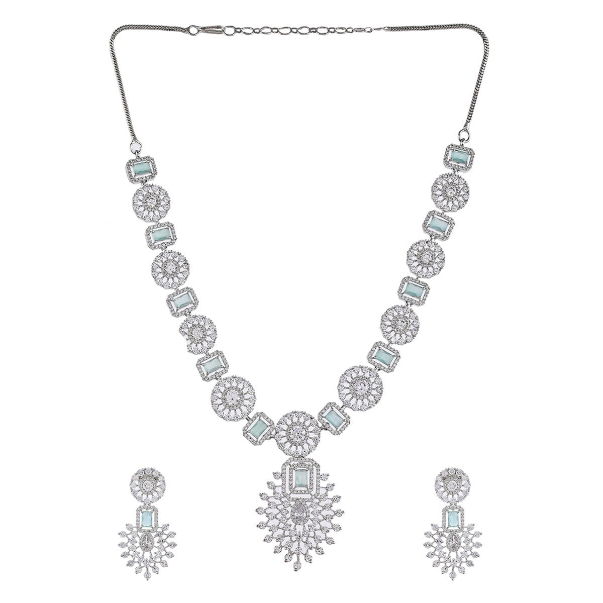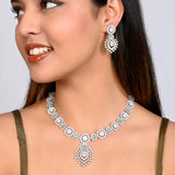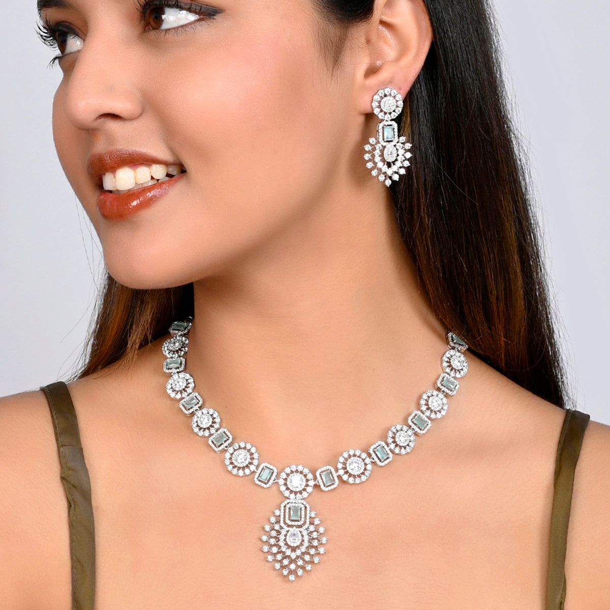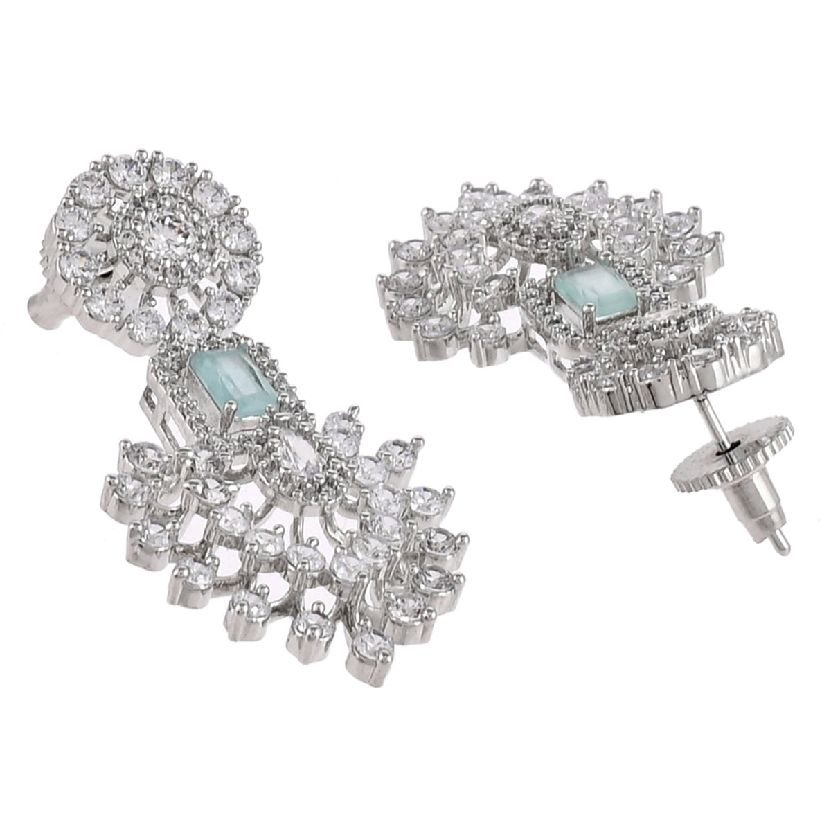 A classic drop style, zircons adorned jewellery set, with silver plating. Made from brass. Pair with formal outfits of all kinds.