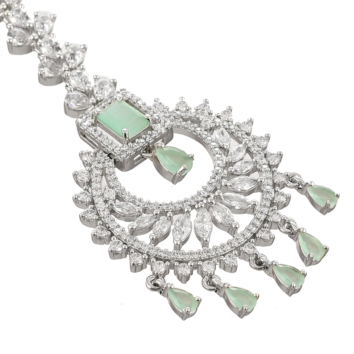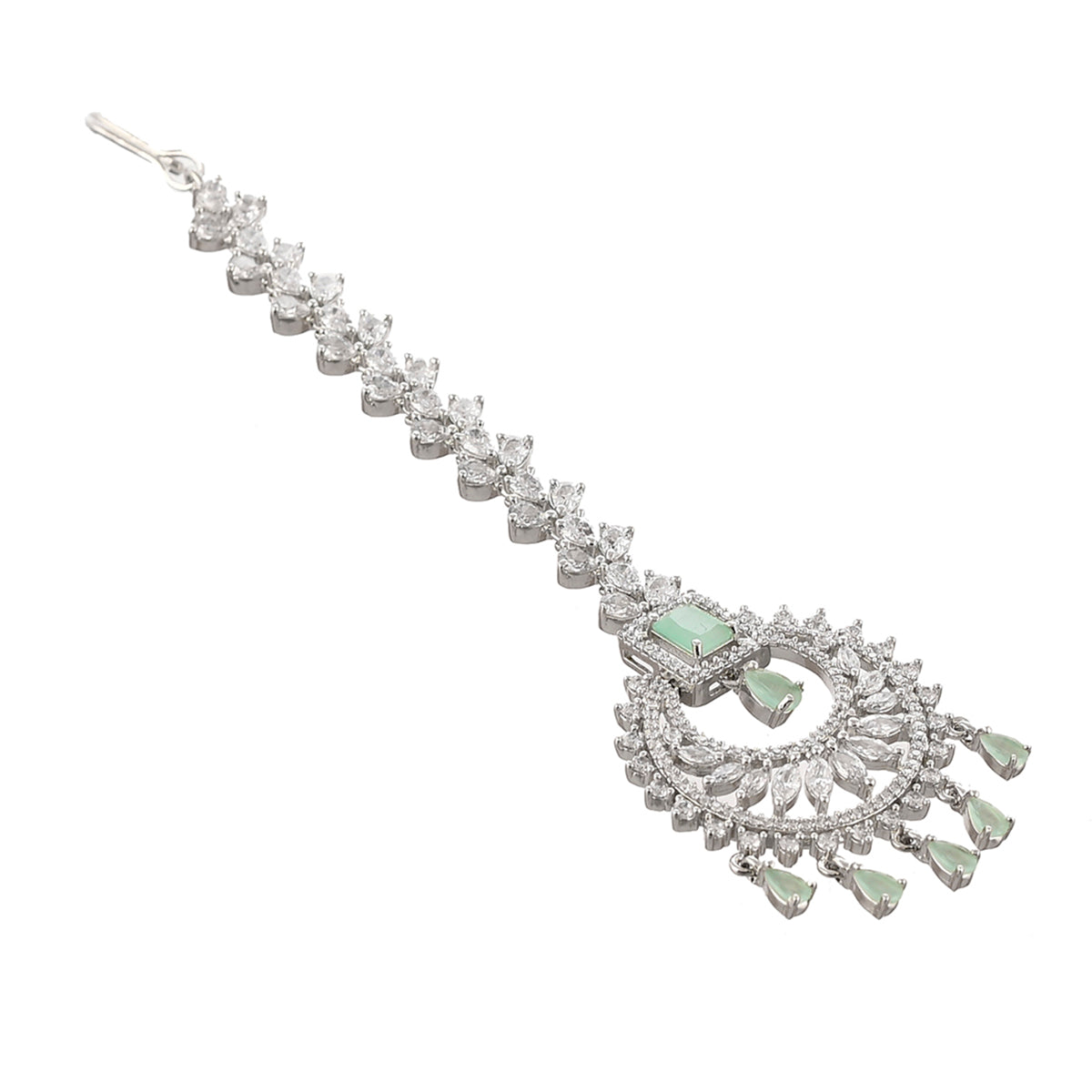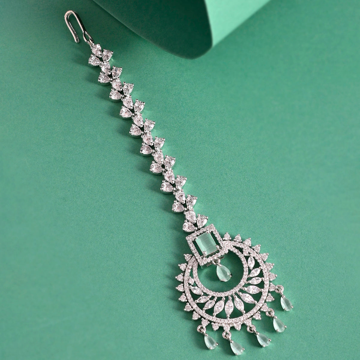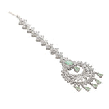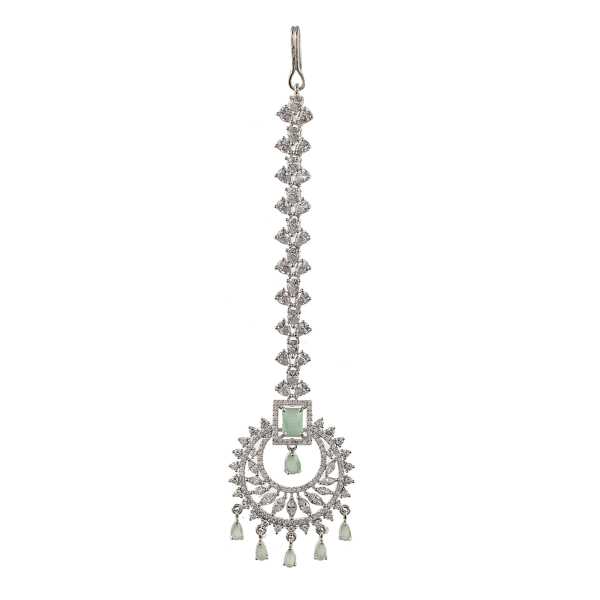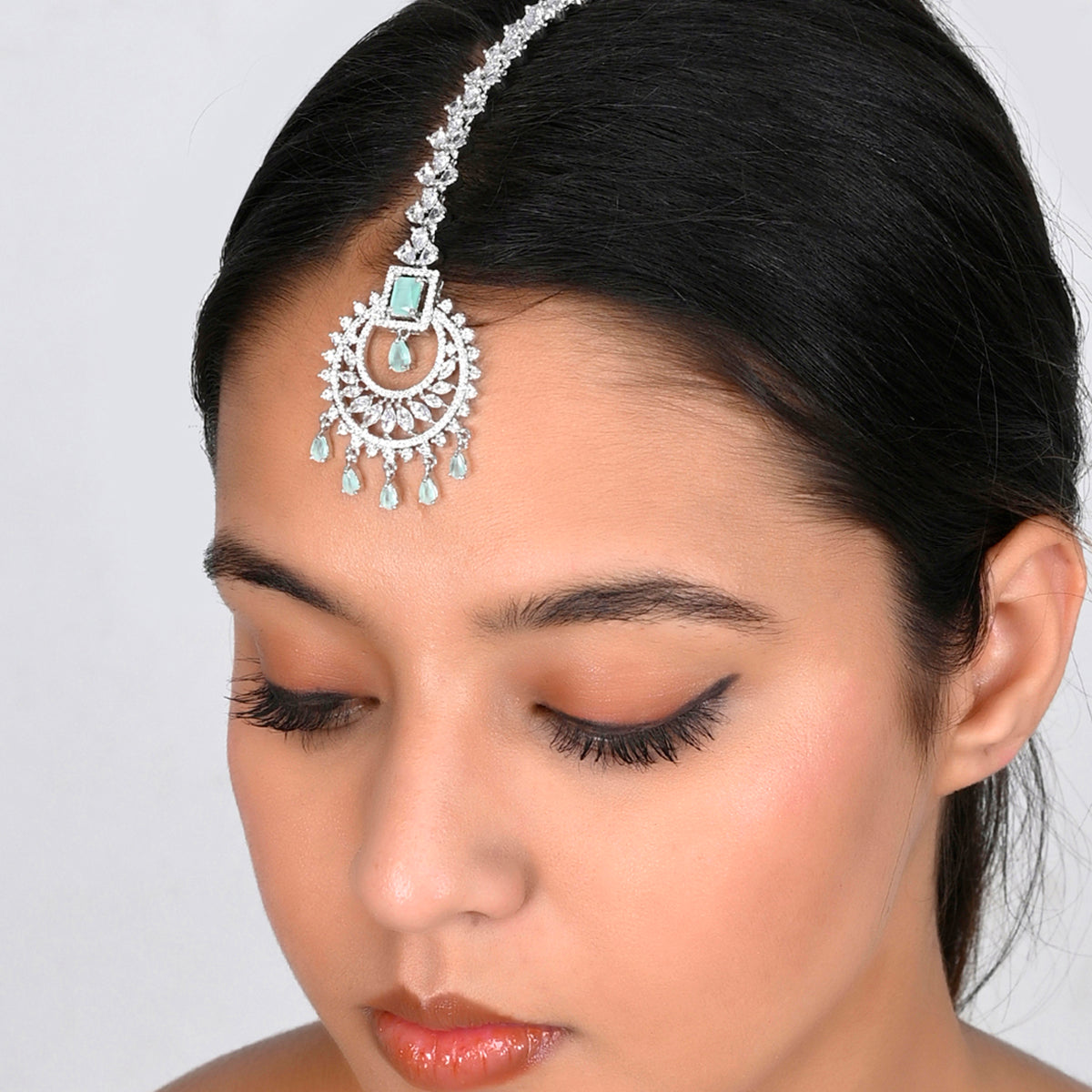 Adorned with a single, large emerald cut CZ and tinier cluster setting gems, this maang tika has been crafted from brass. The silver plated tika is lightweight, comfortable and versatile.