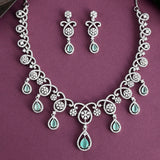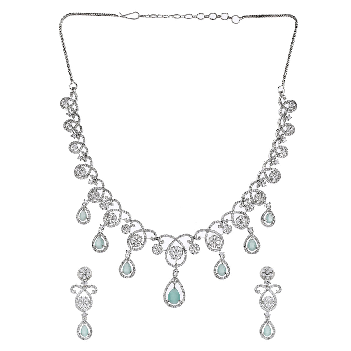 Brass jewellery set with CZ gemstones in a floral pattern. Beaded and silver plated, the set is lightweight, comfortable and versatile.