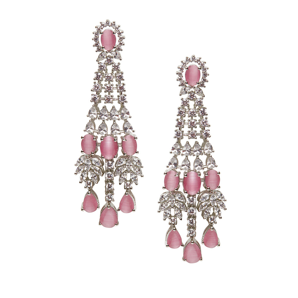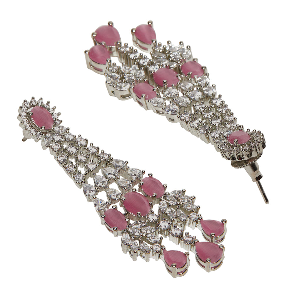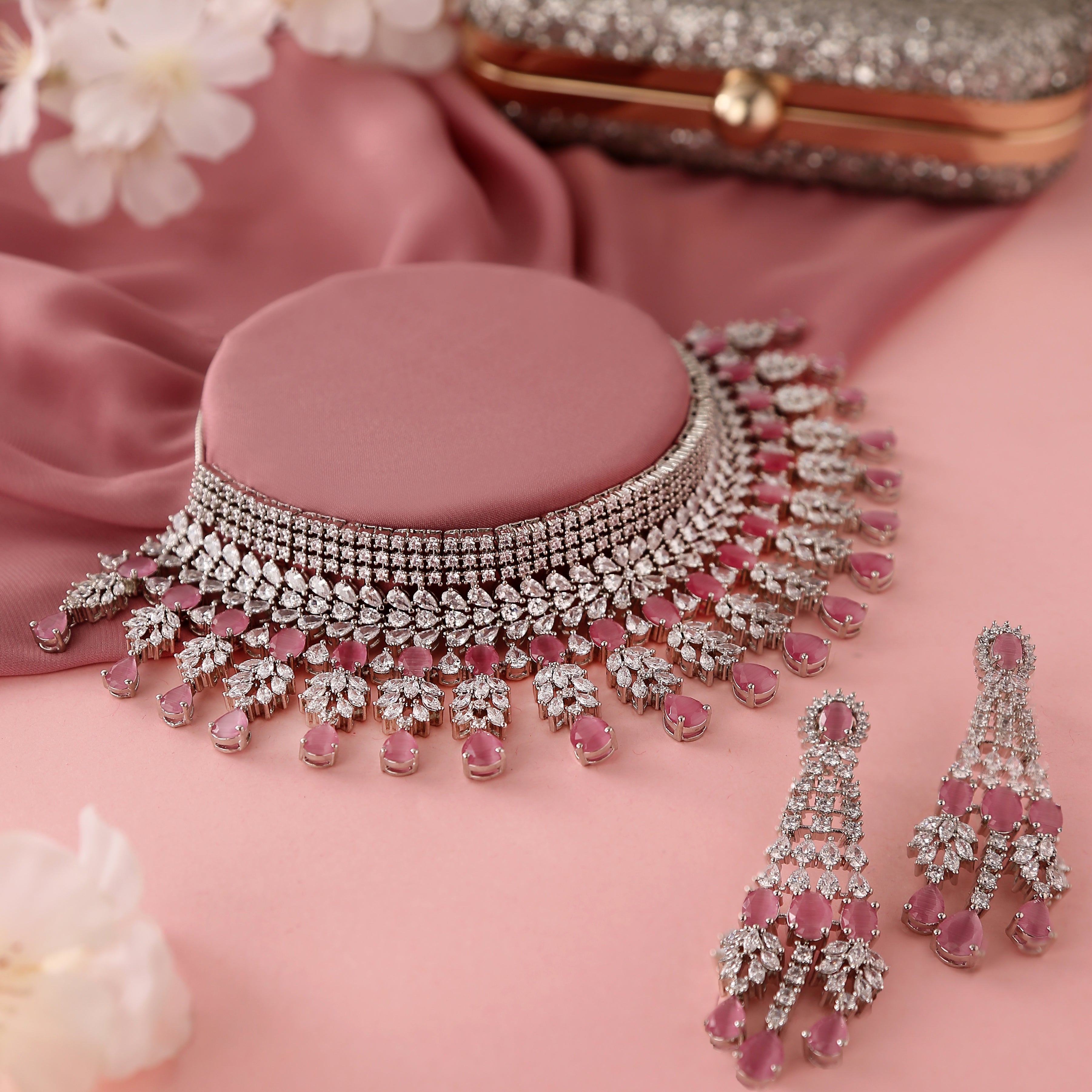 Heavily embellished with CZ gems and fashioned out of brass, this necklace set has been given a silver plating. Wear with formal attire.