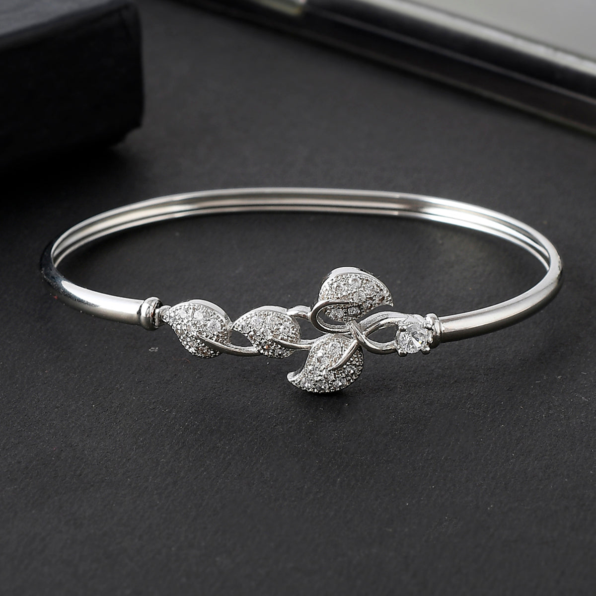 White CZ gemstones adorned leaves motifs bracelet. Made from brass and silver plated. A good match for formal and casual looks.