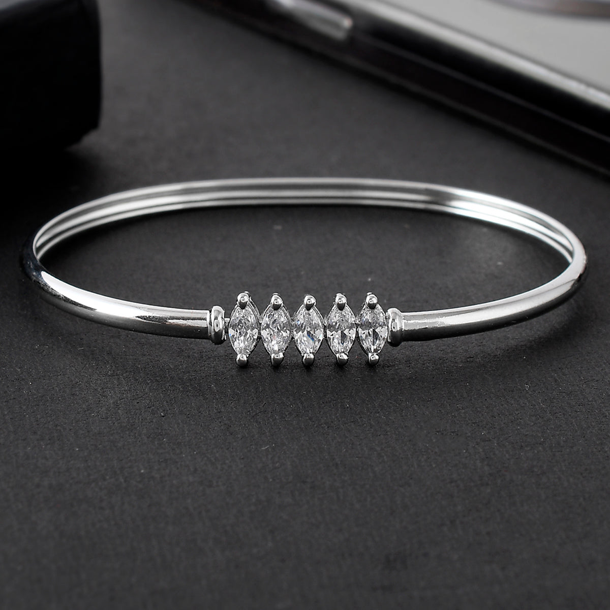 White marquise cut zirconia gemstones bracelet with classic silver plating. Fashioned out of brass and a very versatile piece.