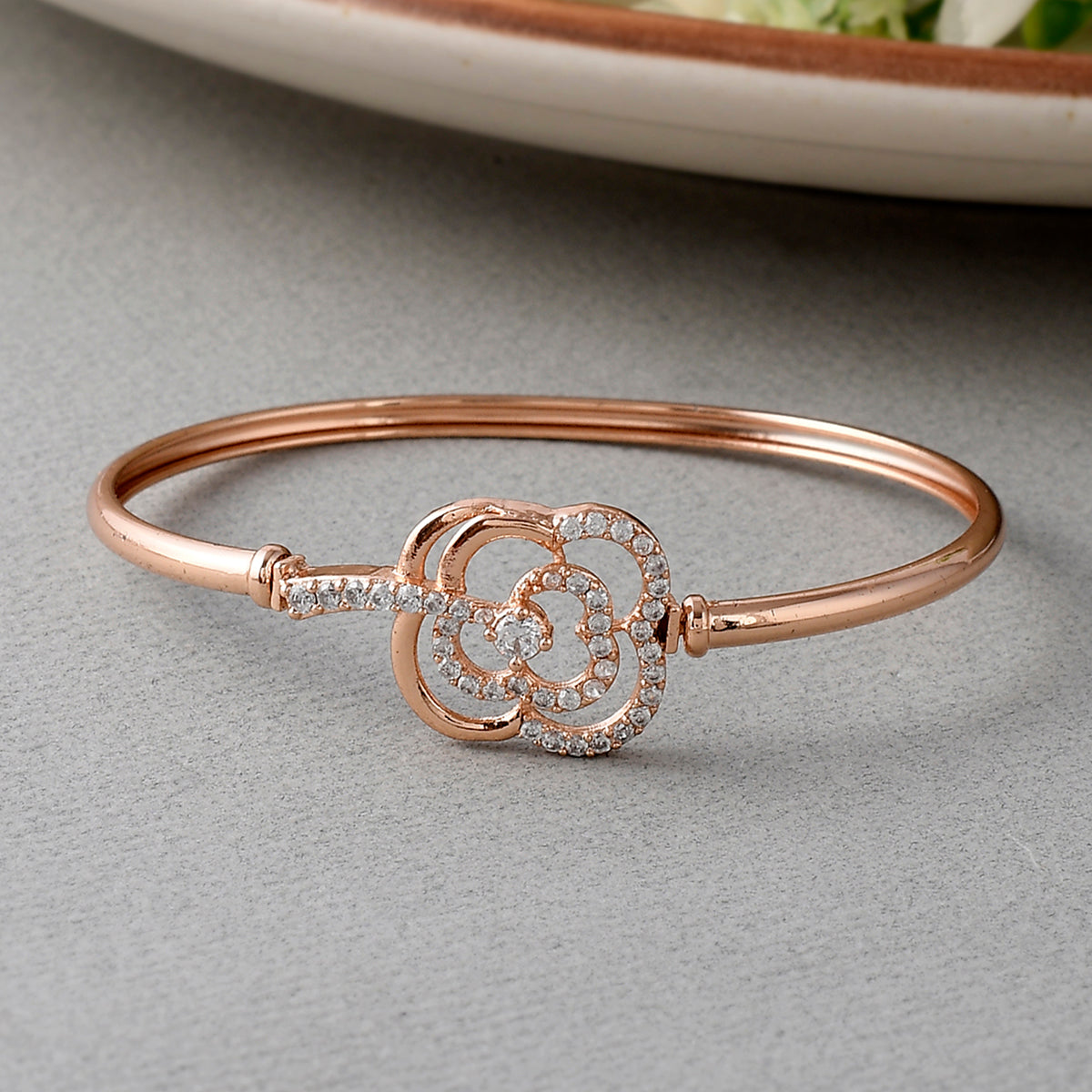 Floral motif brass bracelet with white cubic zirconia gemstones. Rose gold plated and versatile enough to be paired with just about everything.
