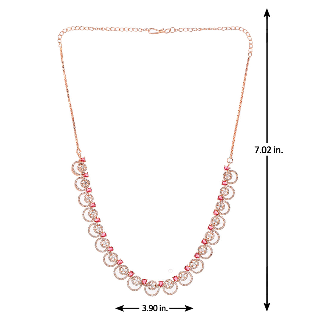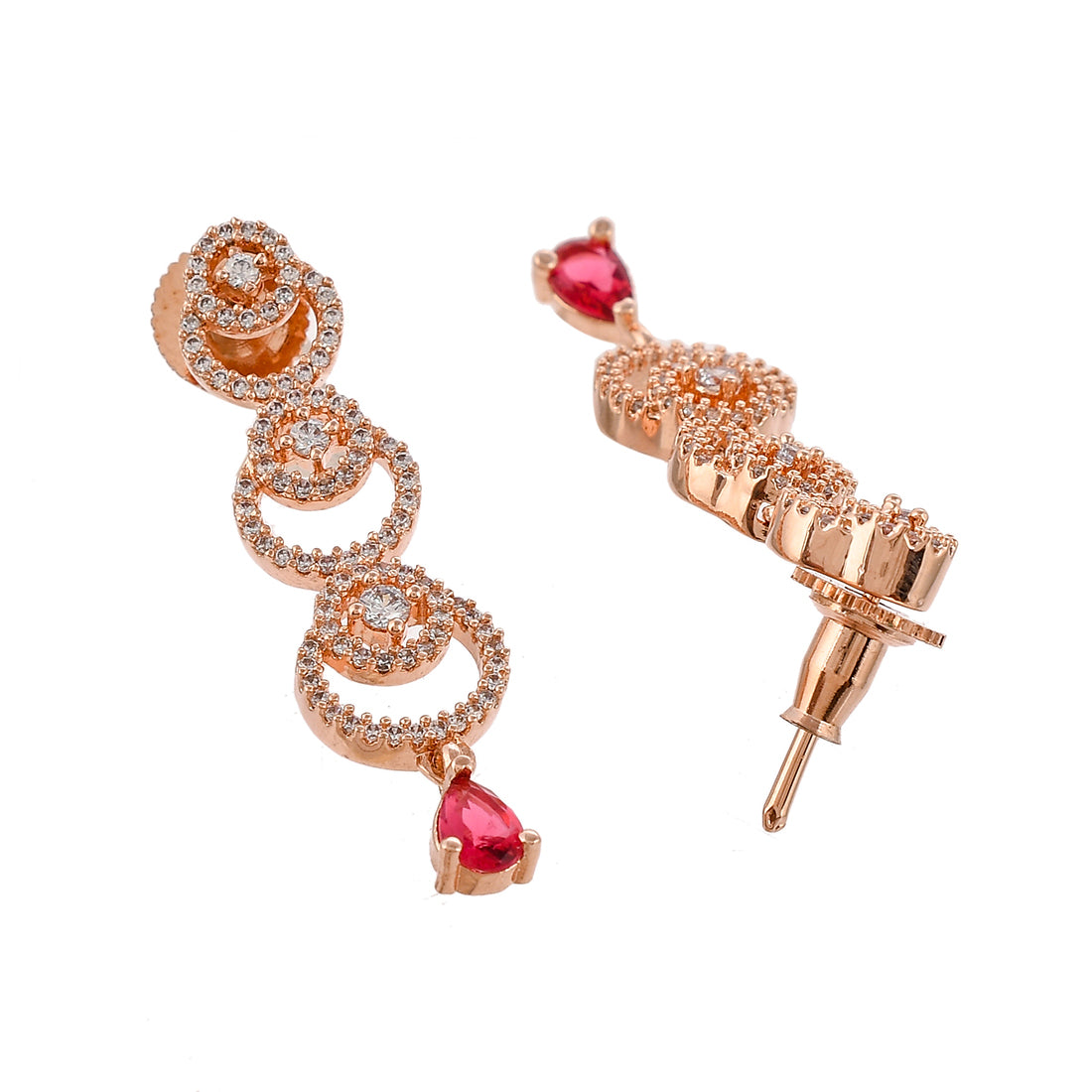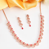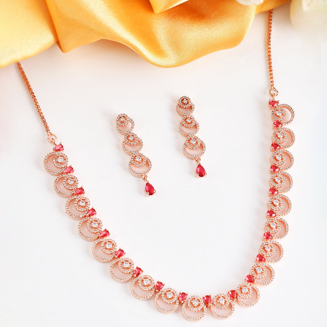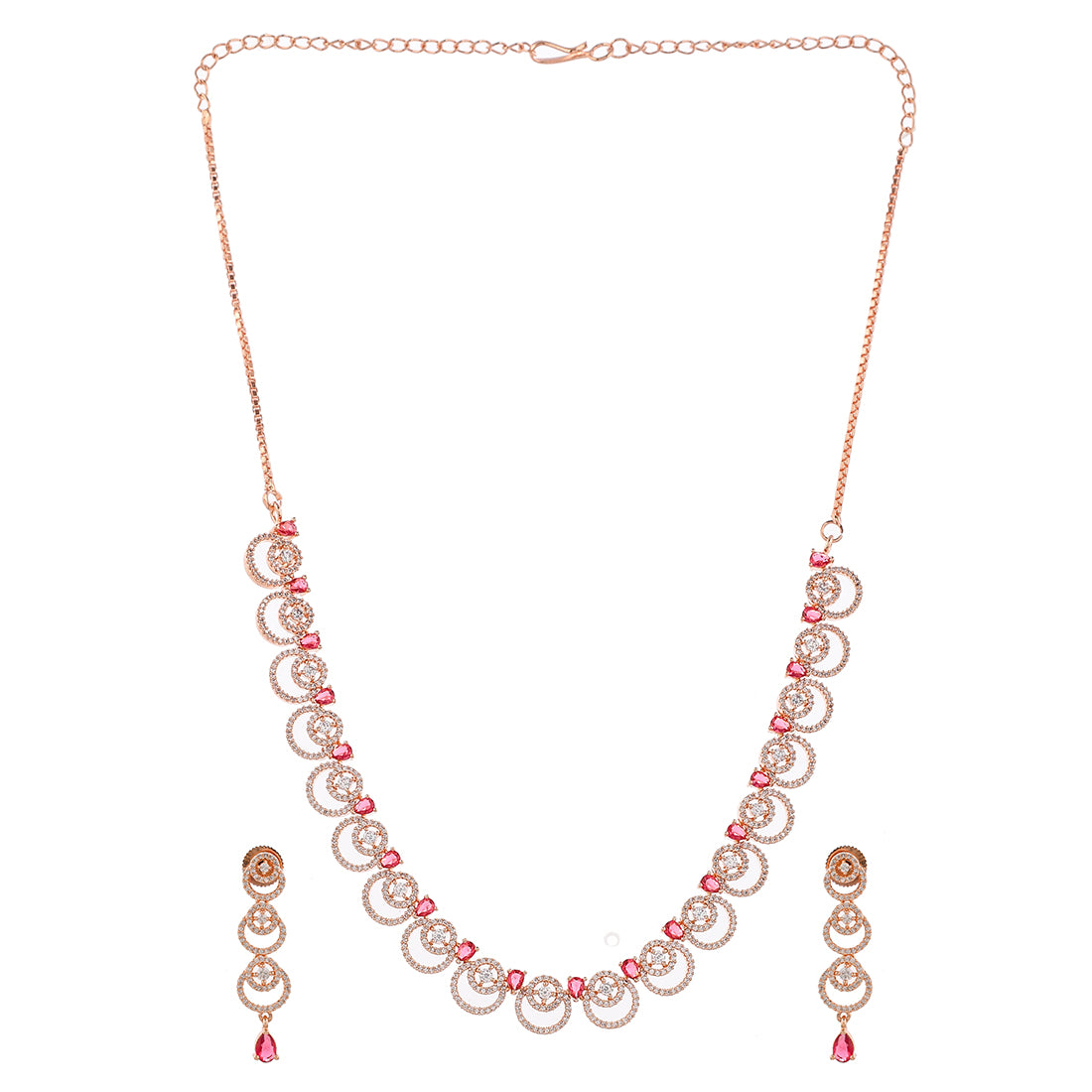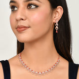 The rose gold necklace set from CZ collection is a stunning piece of jewellery that adds a touch of glamour and femininity to any outfit. Made of high-quality brass with a rose gold finish, the necklace features intricately designed pendants adorned with sparkling CZ stones that add a touch of luxury to the piece. This set is perfect for special occasions, adding a hint of romanticism and charm to any look.