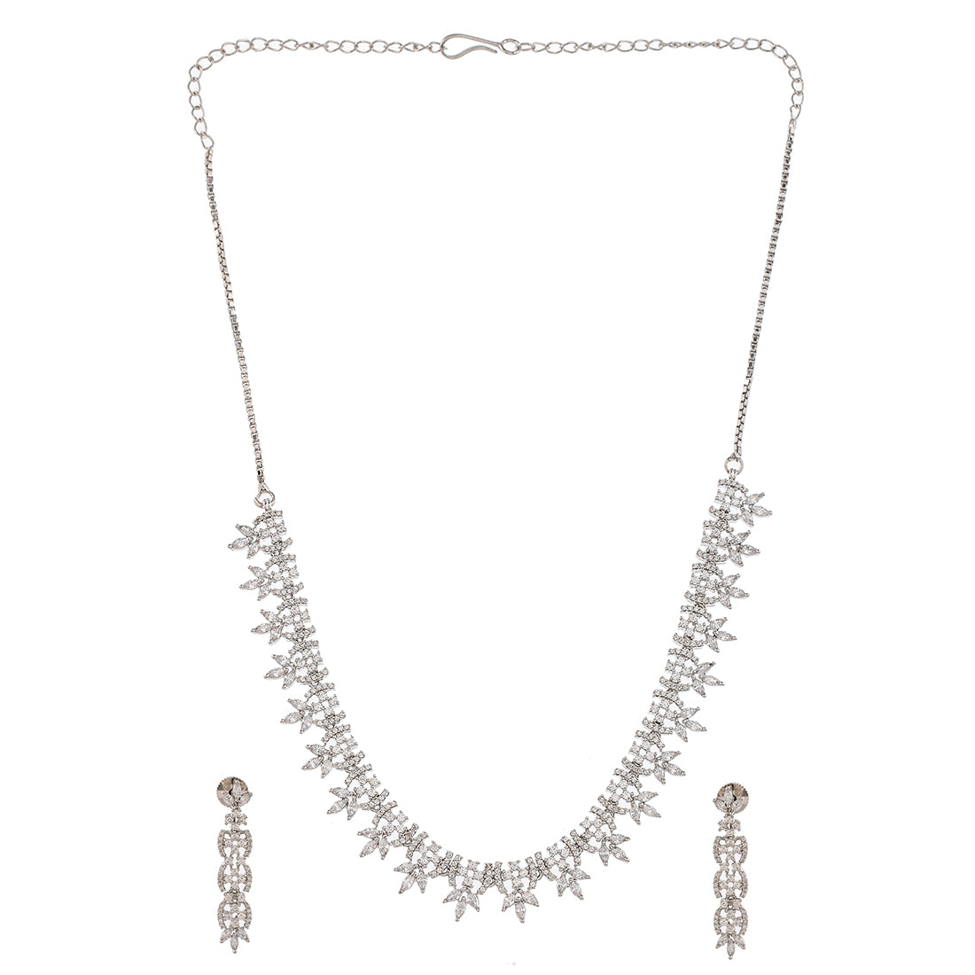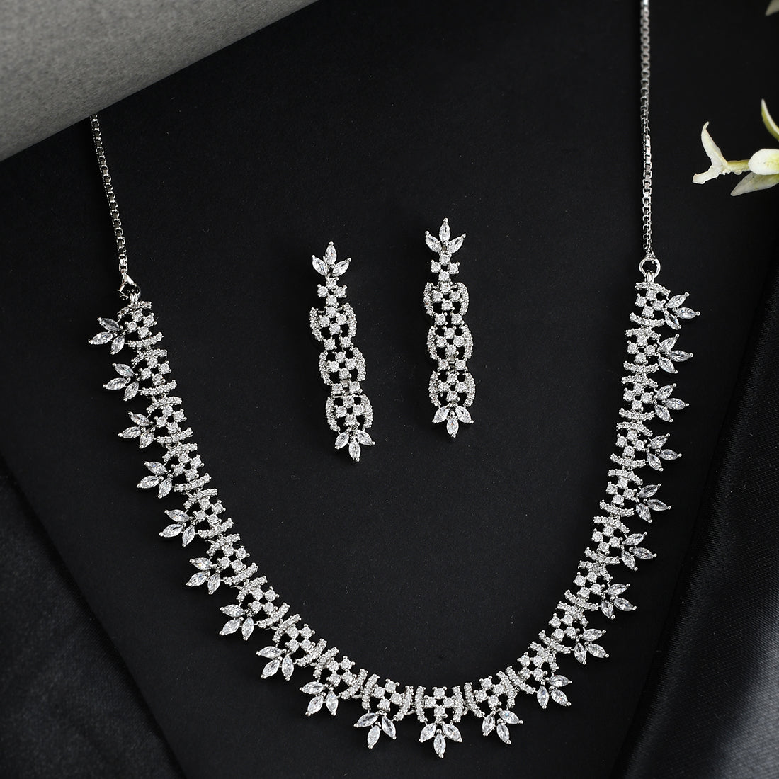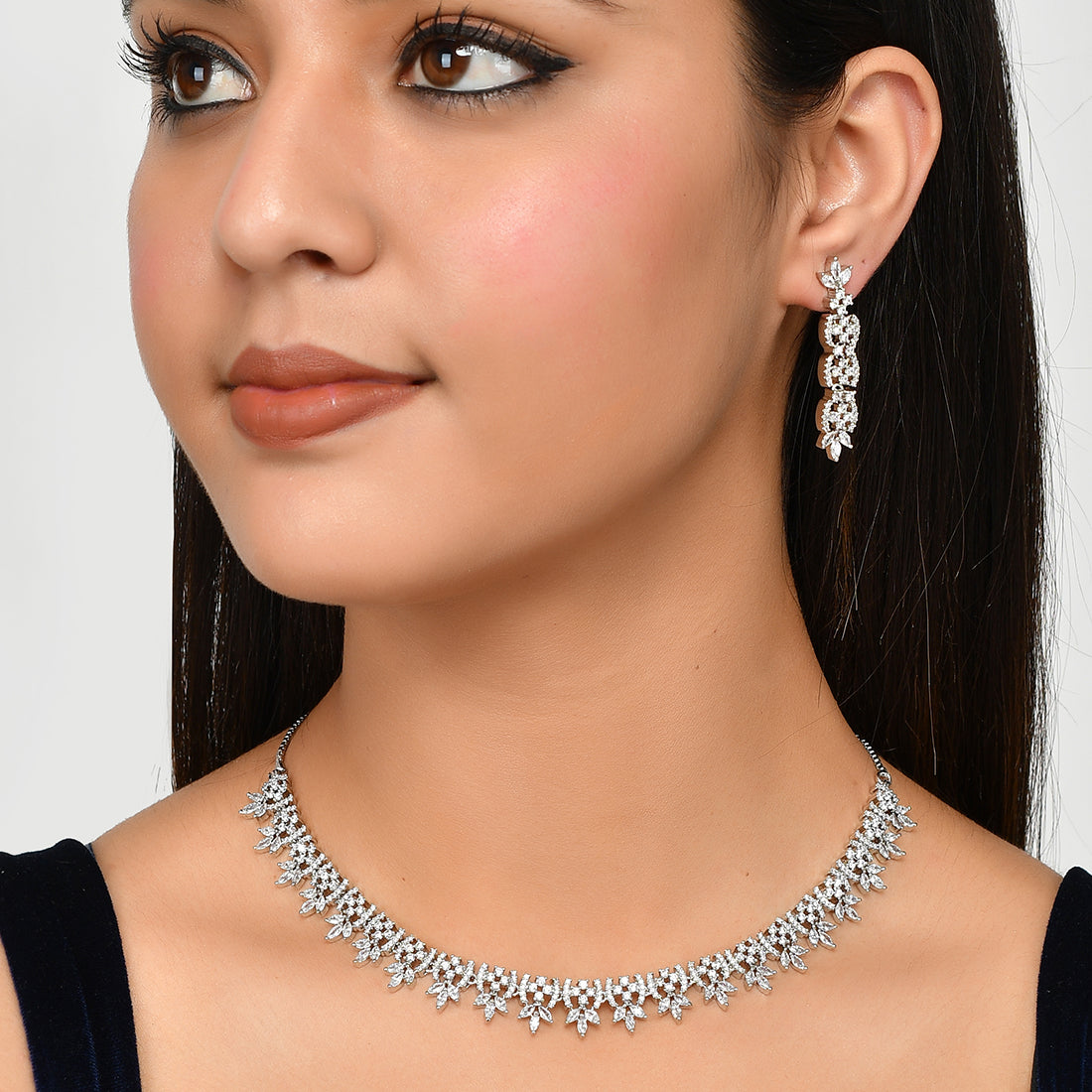 Cz Elegance Silver Plated Brass Made Leafy Necklace And Earrings