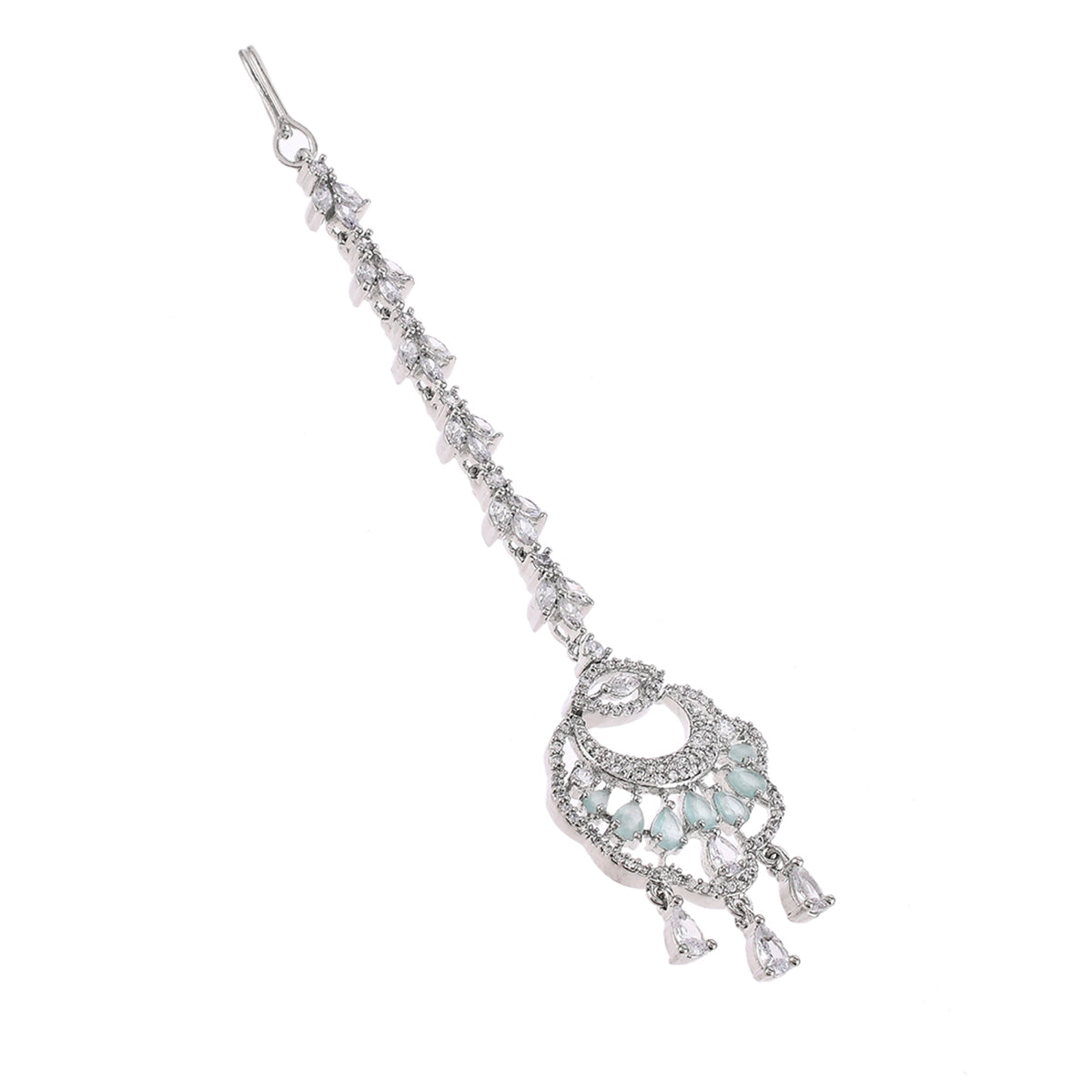 Silver plated classic maang tika with zirconia gemstones and beads. Made from brass and a good match for formal looks.