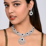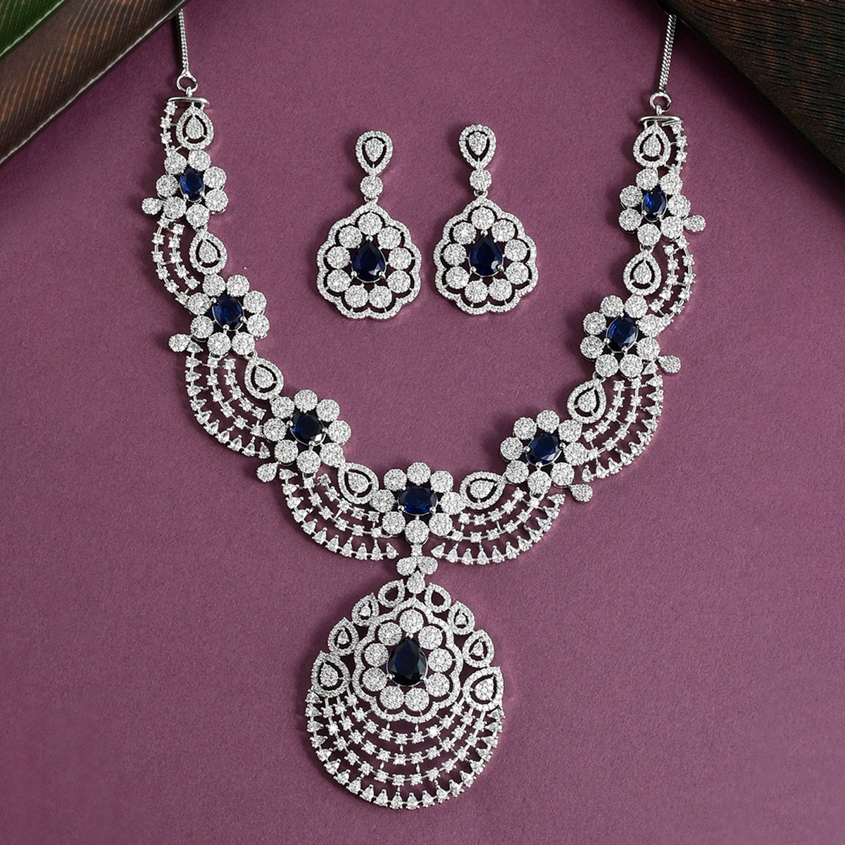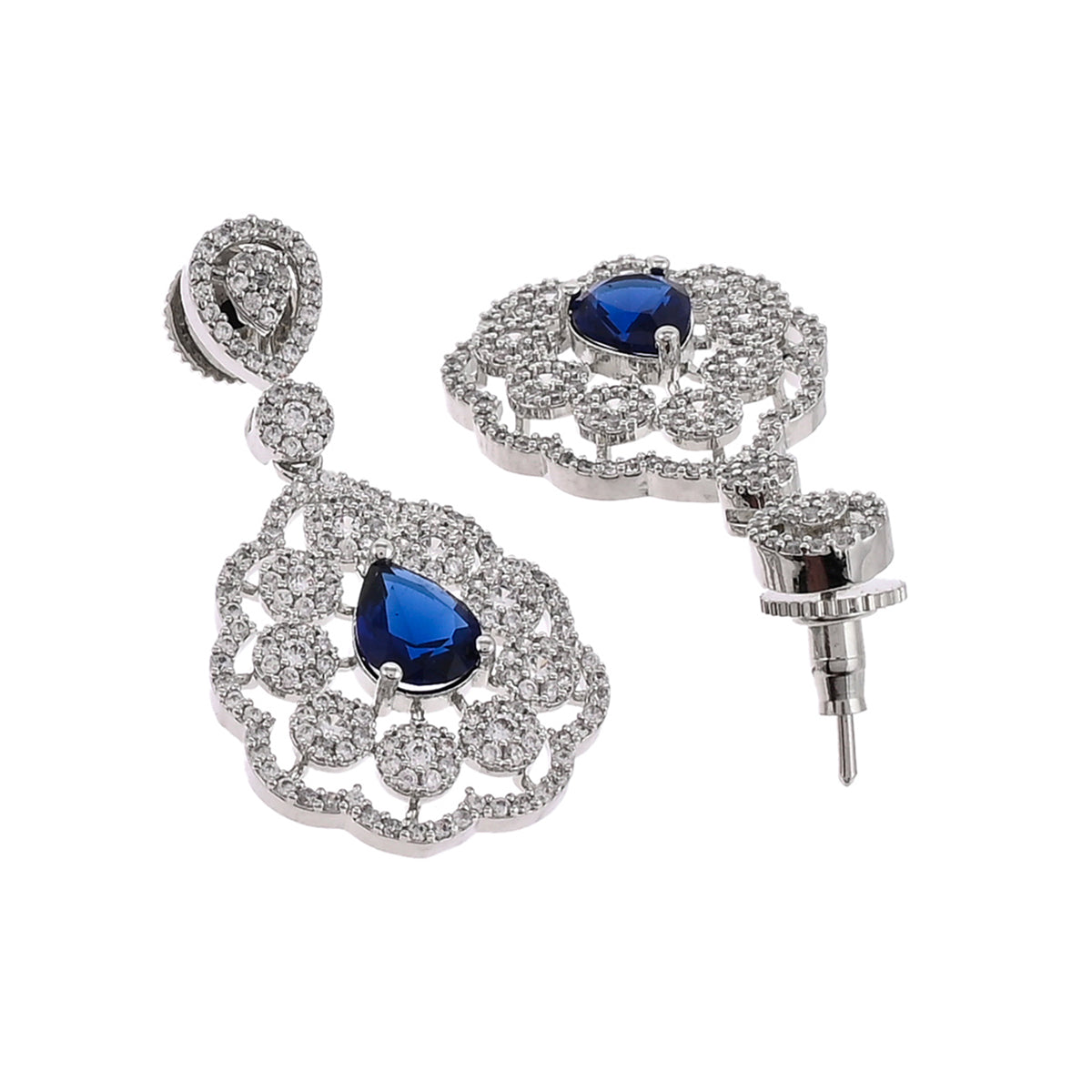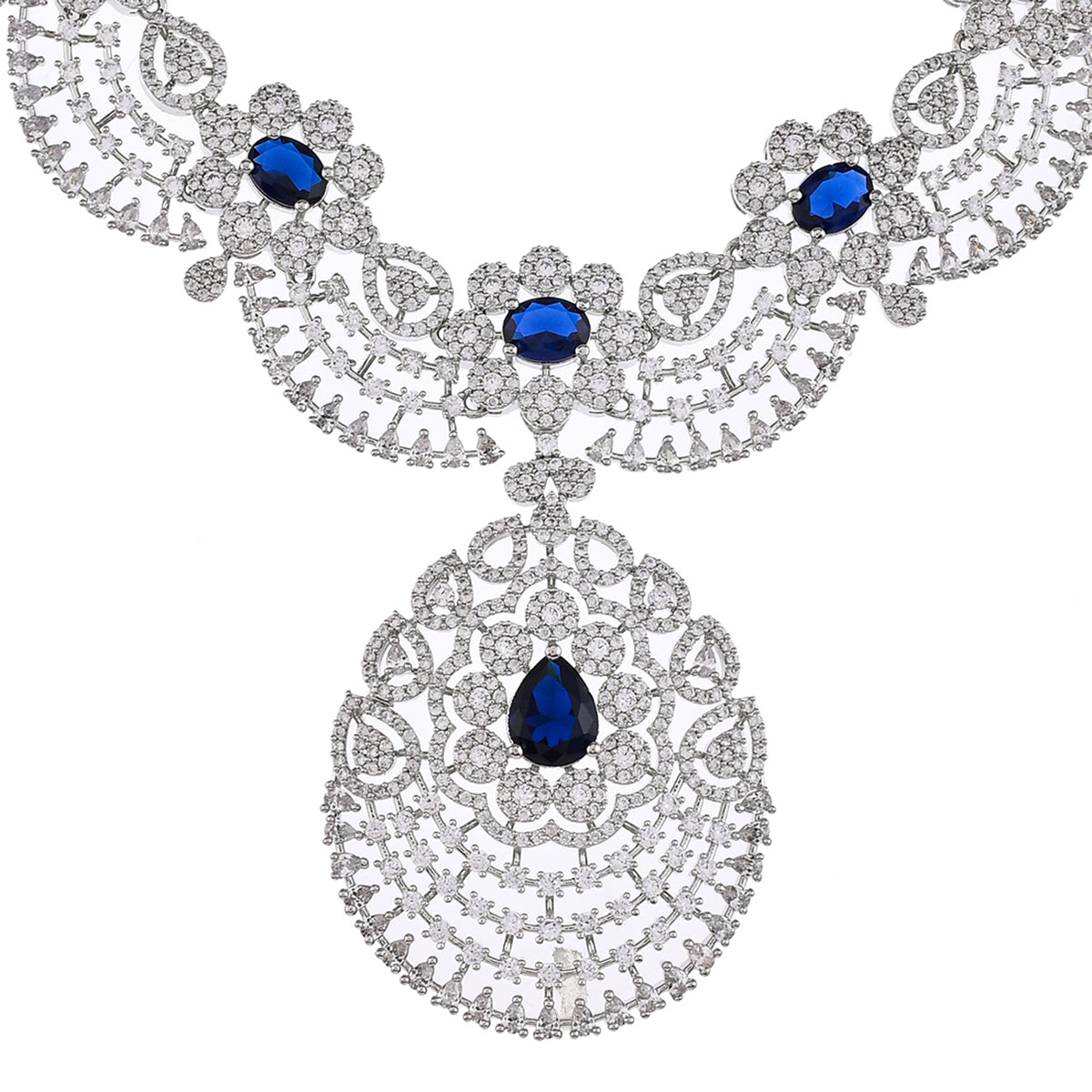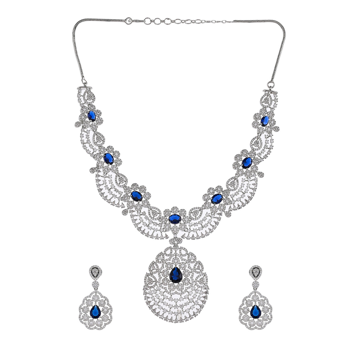 Teardrop cut blue zircons adorned brass jewellery set with lovely silver plating. Pair with any of your favourite formal outfits.