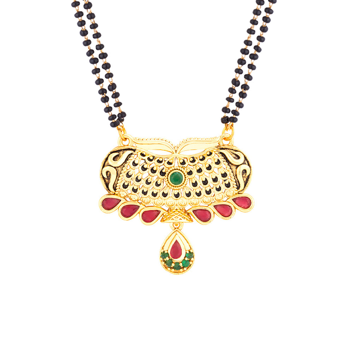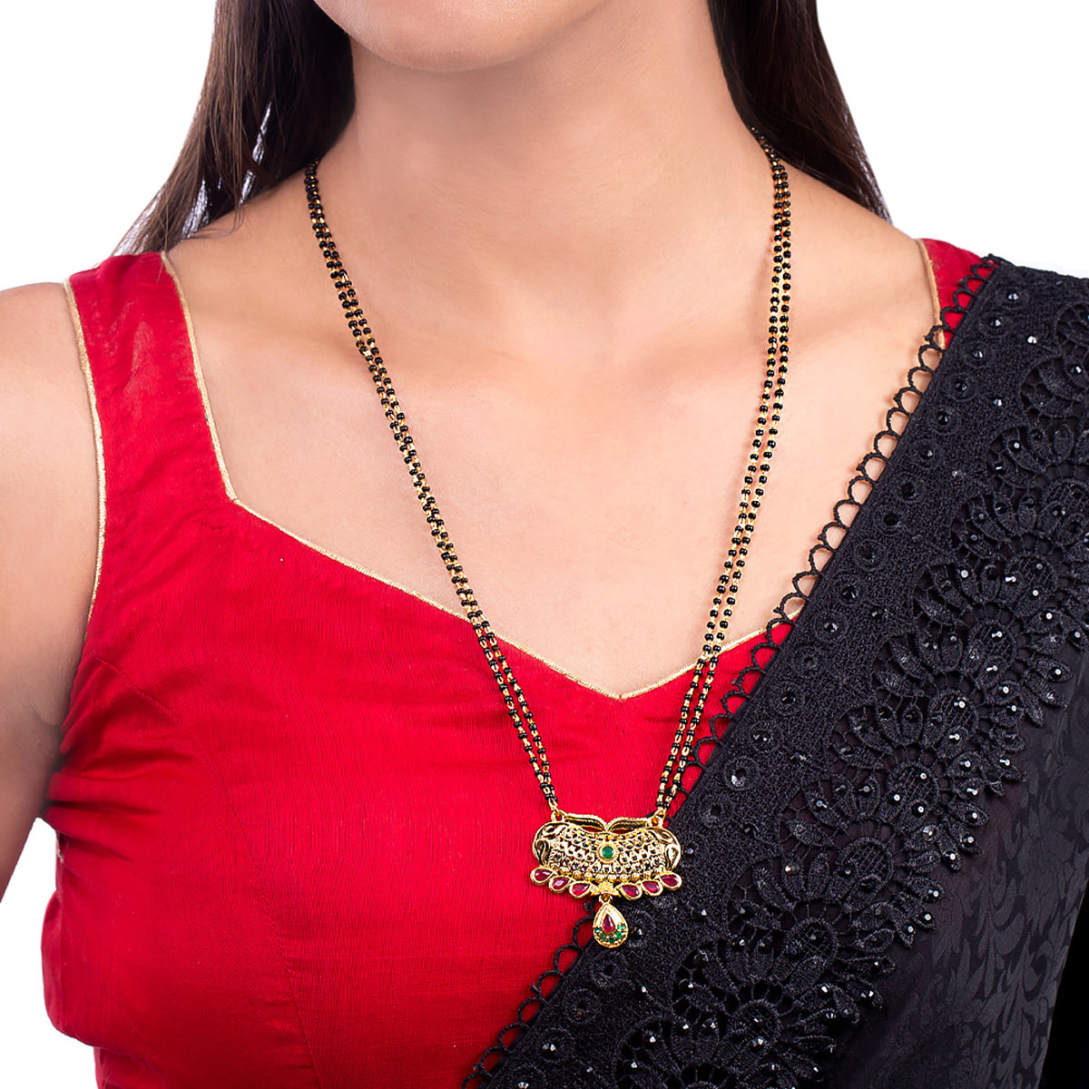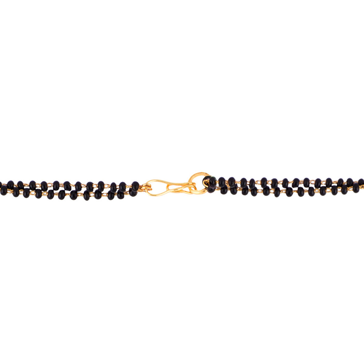 Brass mangalsutra embellished with zircon gems. Yellow gold plated. Wear with a traditional silk saree.