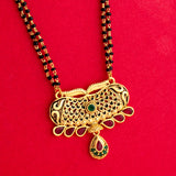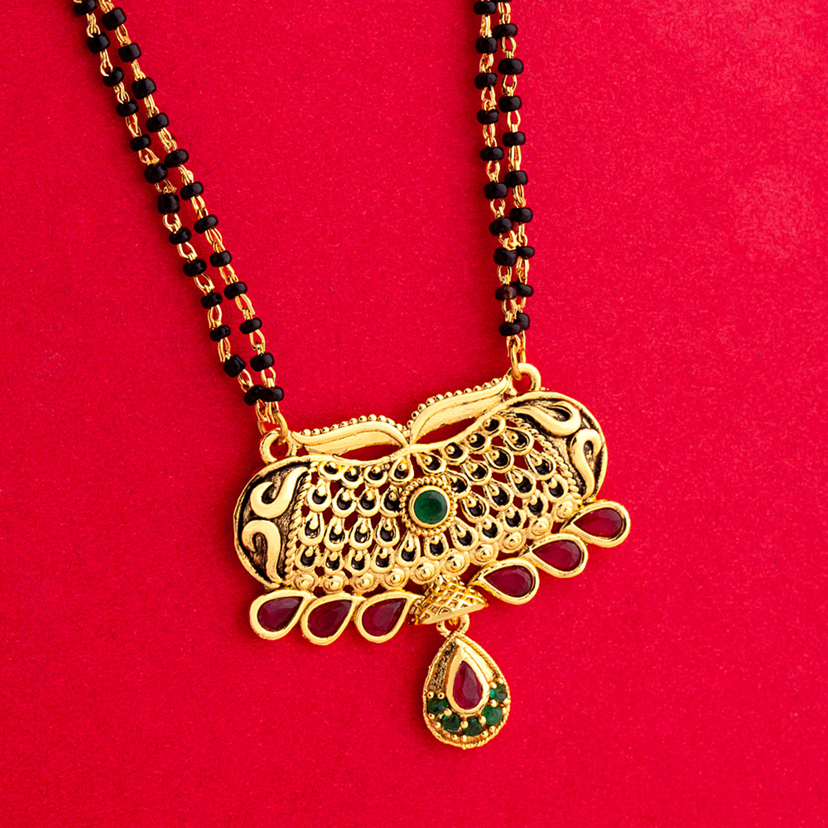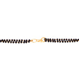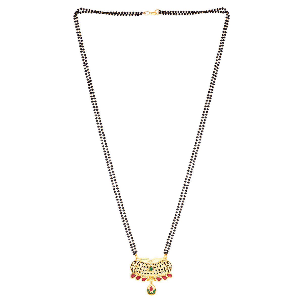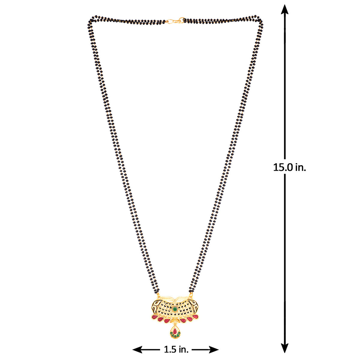 Brass mangalsutra embellished with zircon gems. Yellow gold plated. Wear with a traditional silk saree.
