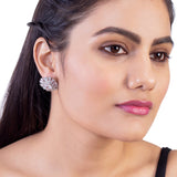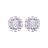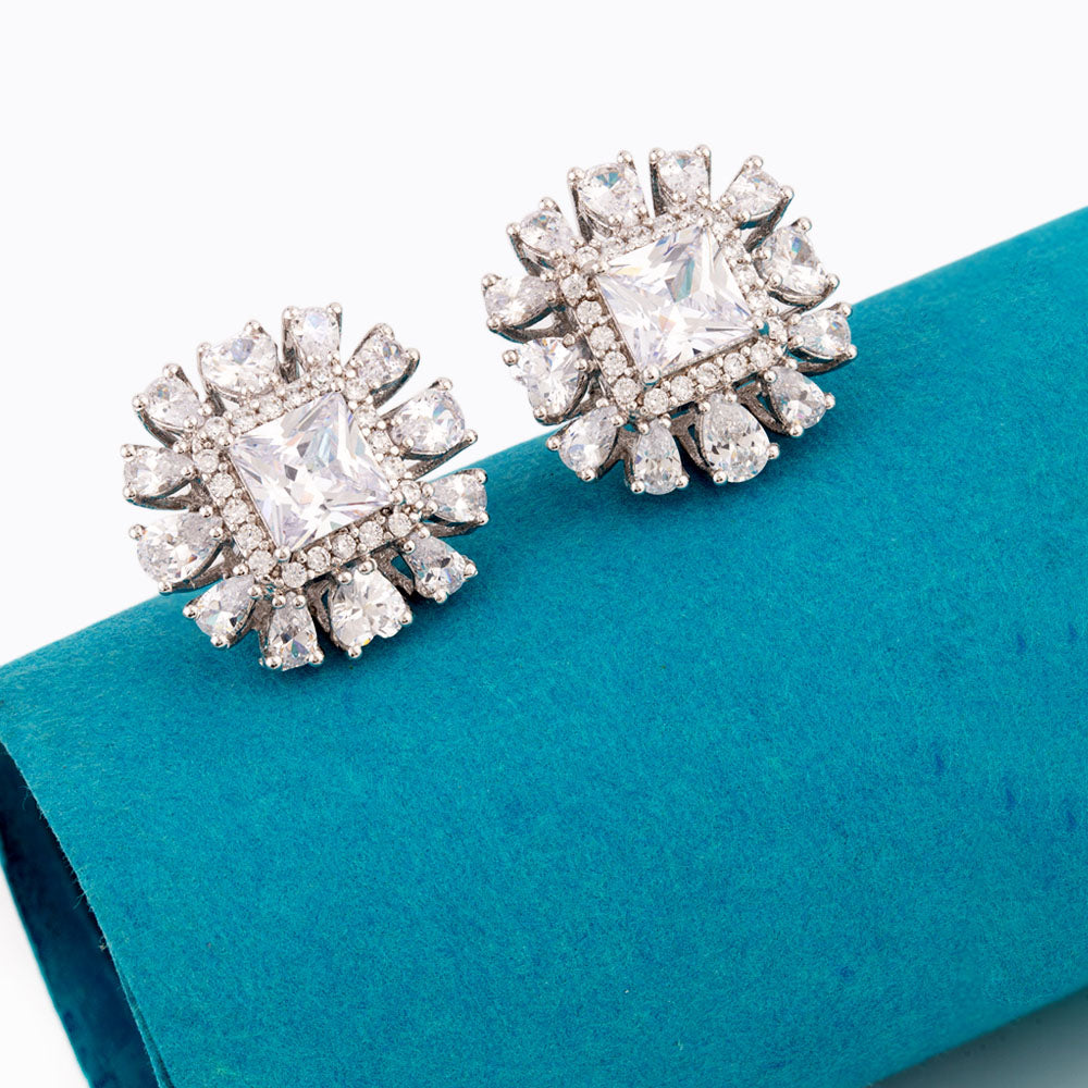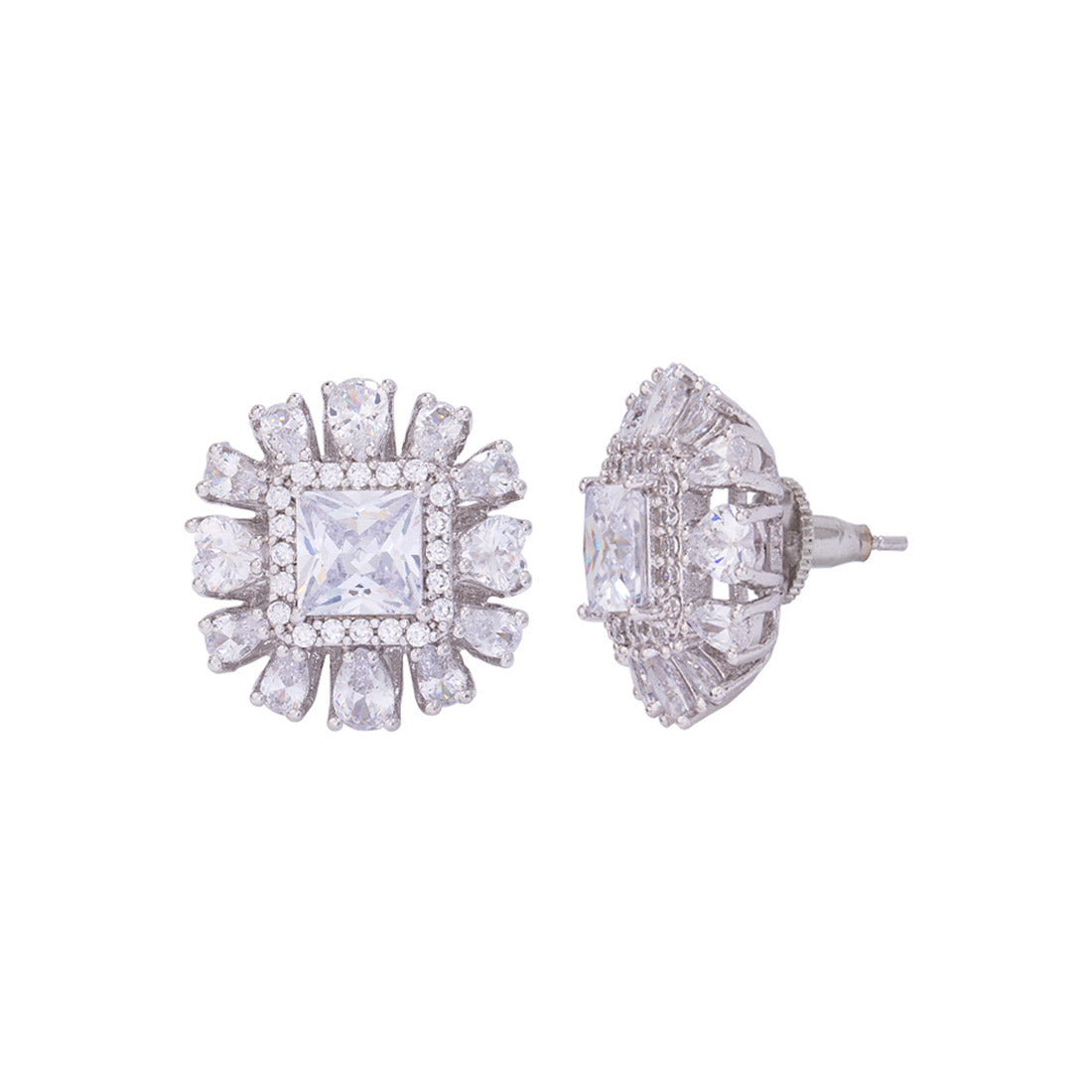 Stud earrings embellished with American Diamond gems. Made from brass and silver plated. Pair with formal attire. This piece of jewelry comes with the Voylla assurance of quality and durability.