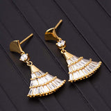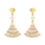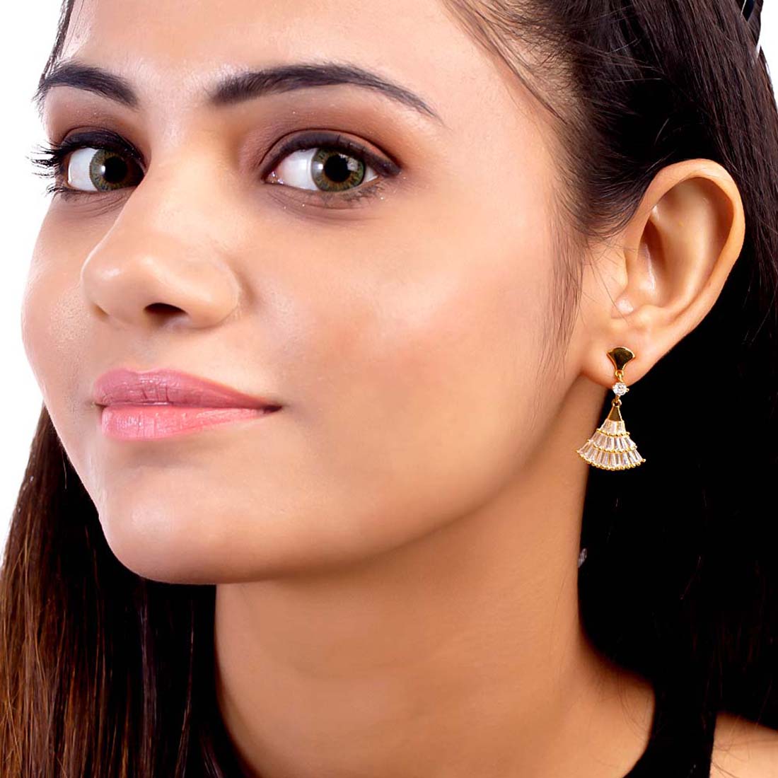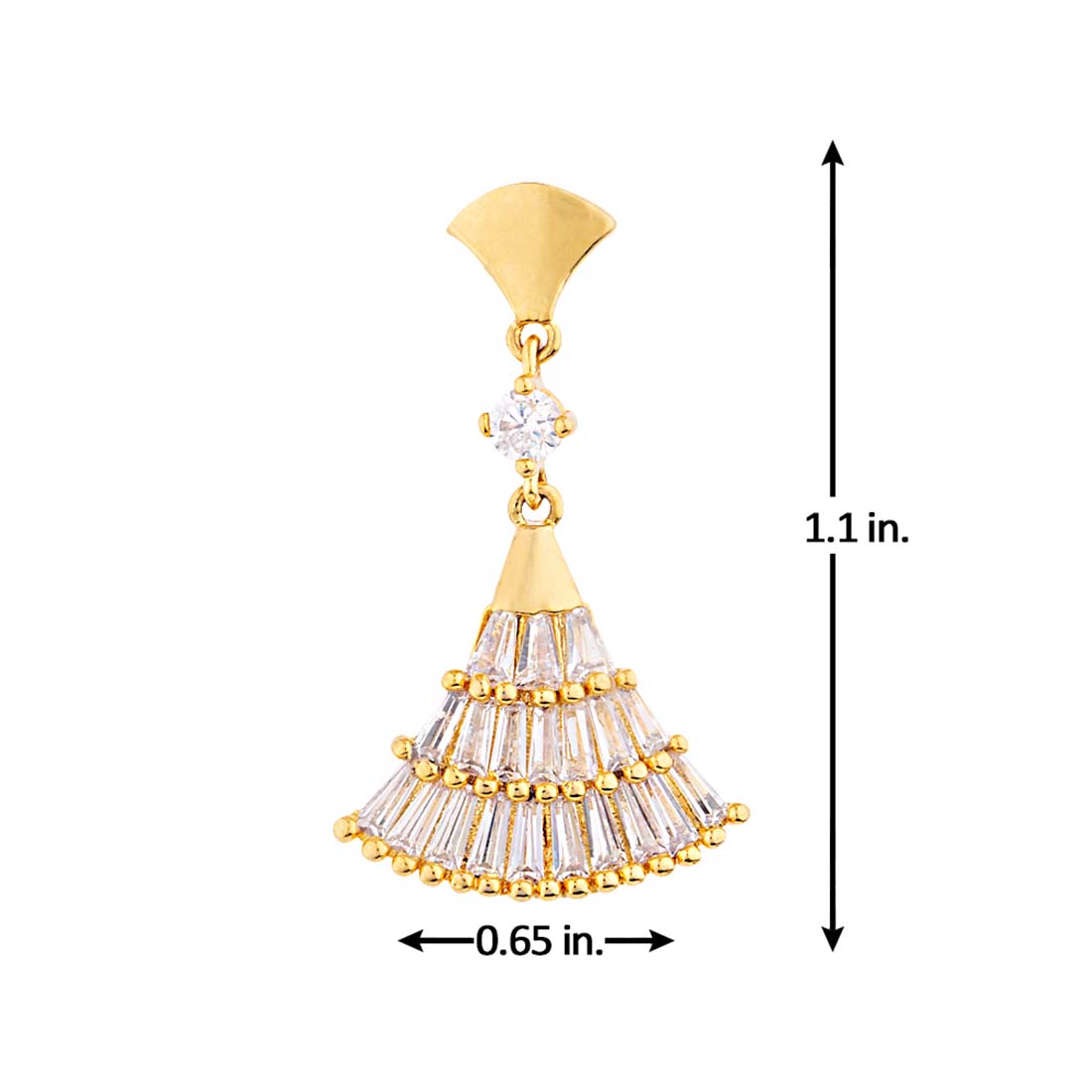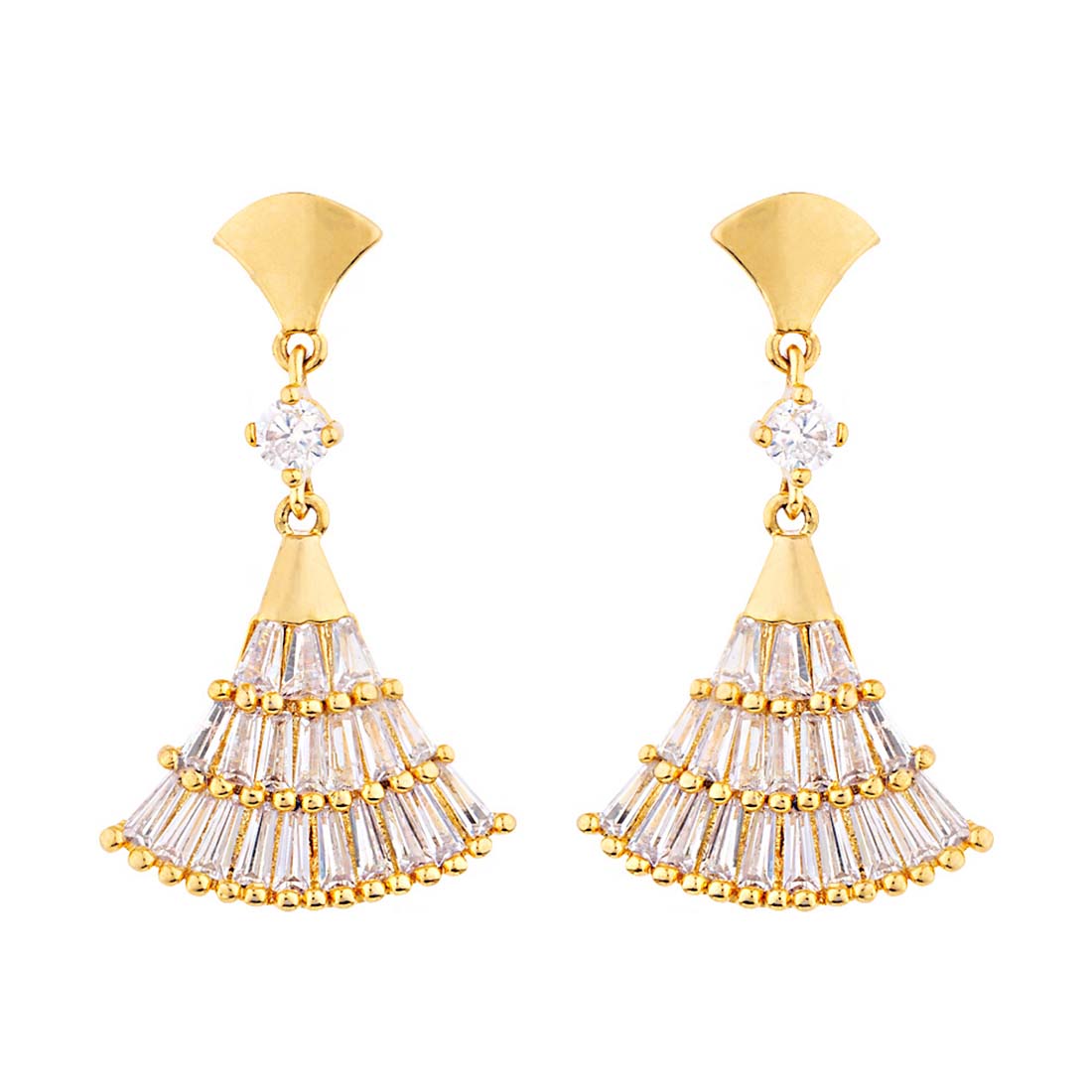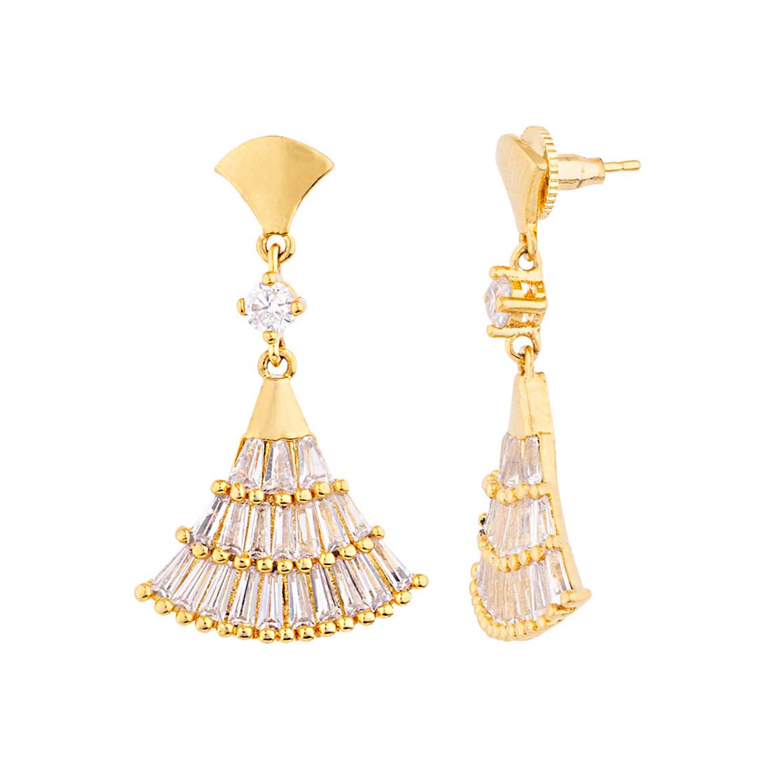 Triangle motif earrings, fashioned out of brass and yellow gold plated. Wear the zircons adorned pair with a casual summer dress.