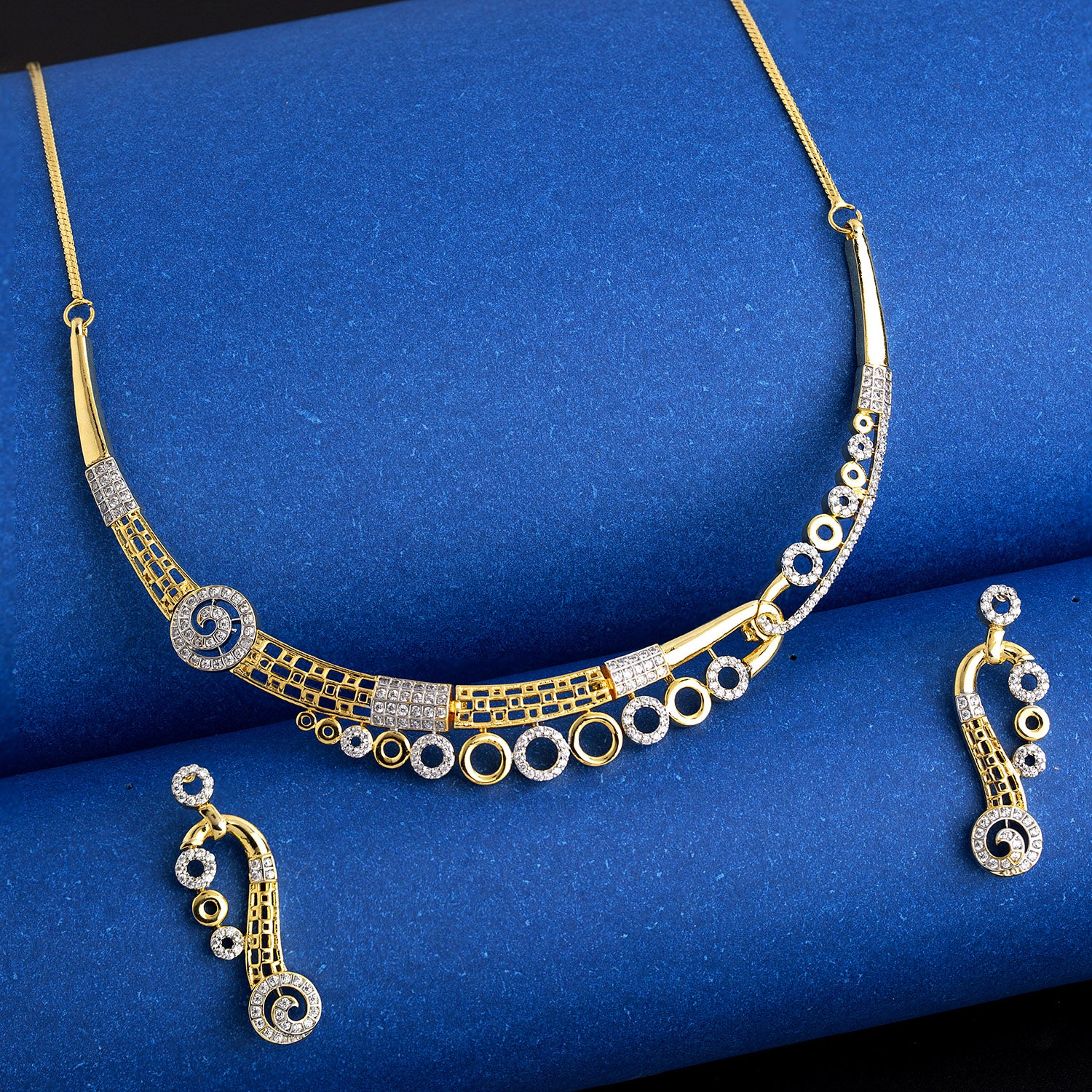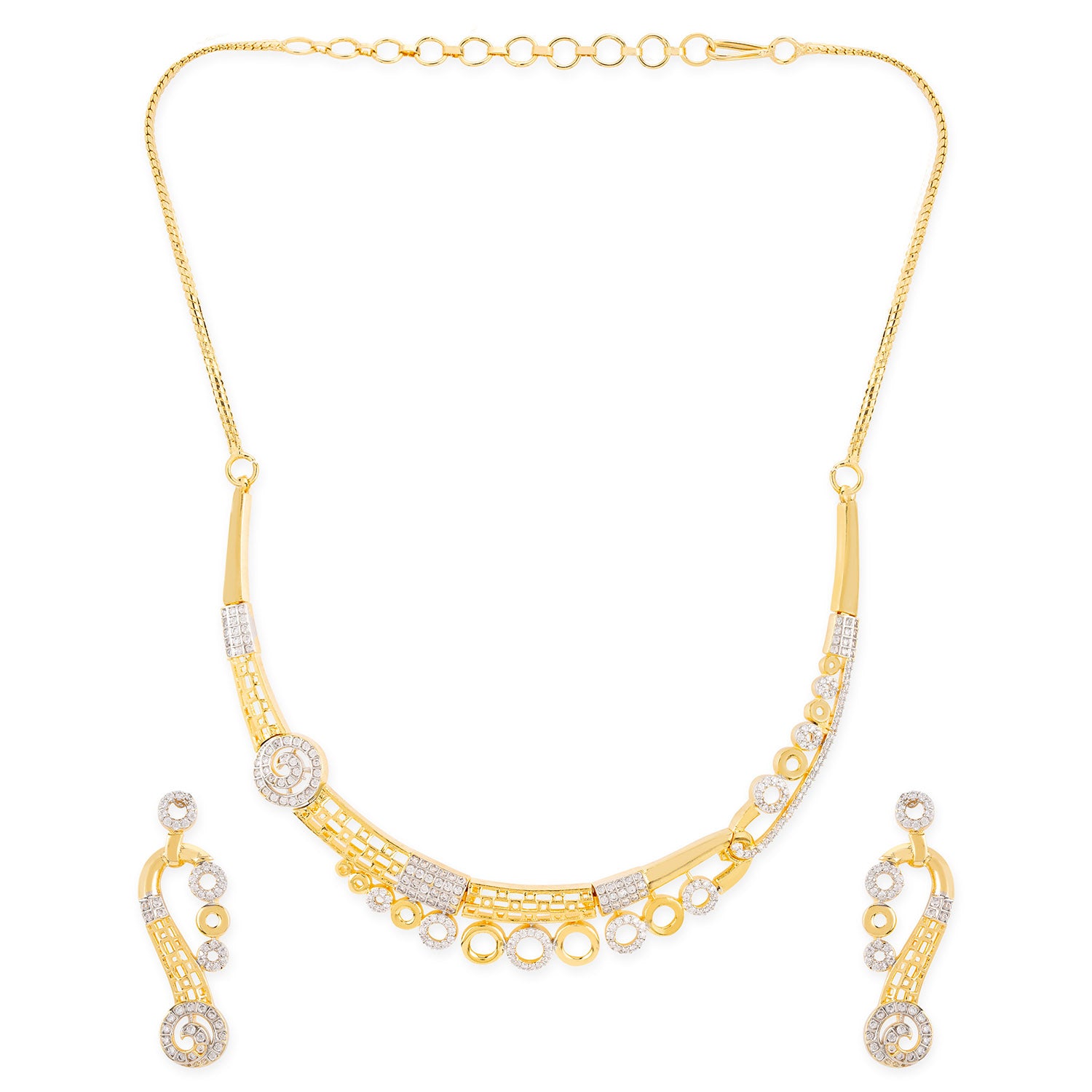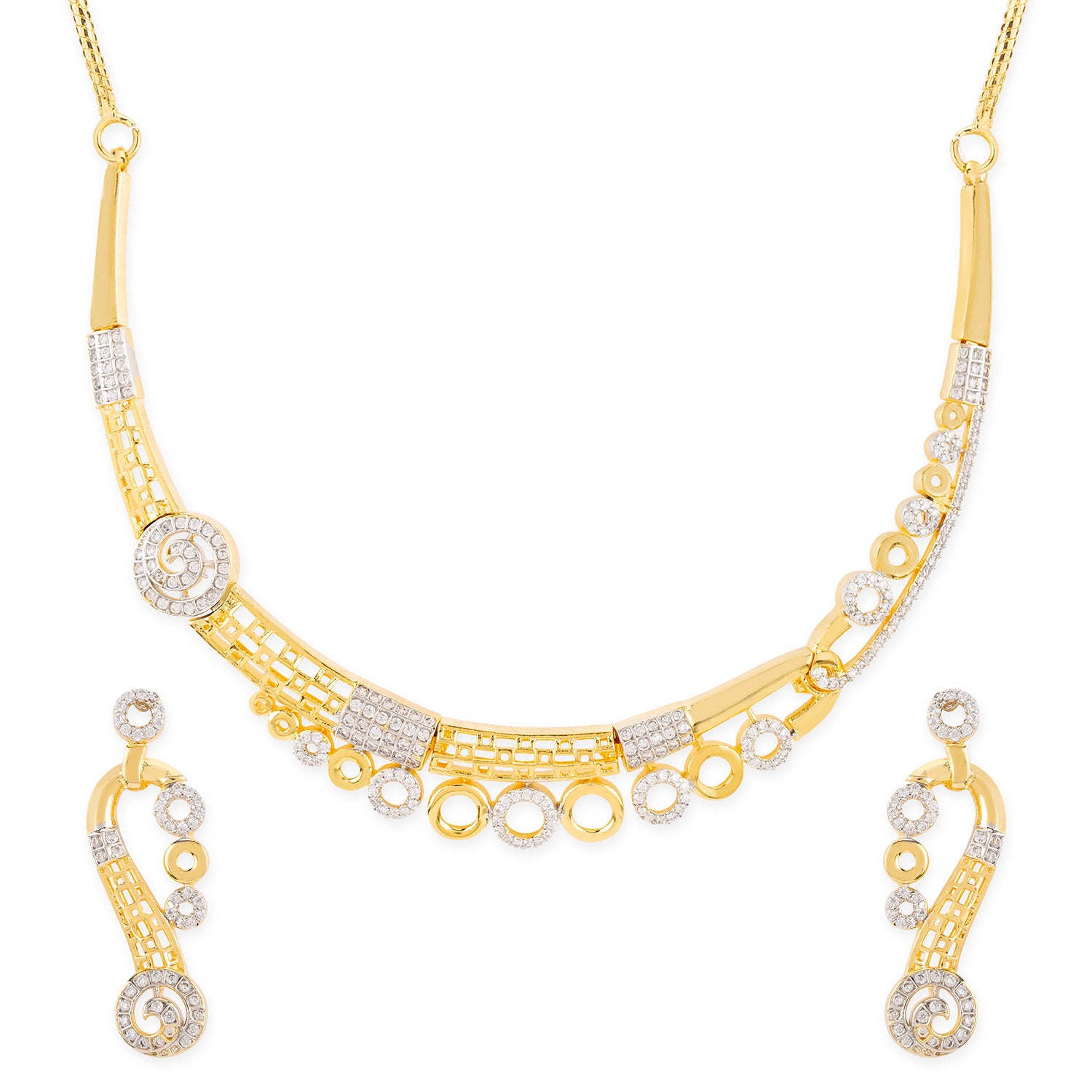 Geometric pattern brass jewellery set with gold plating. Round cut zirconia gemstones adorned. A good match for formal looks of all kinds.