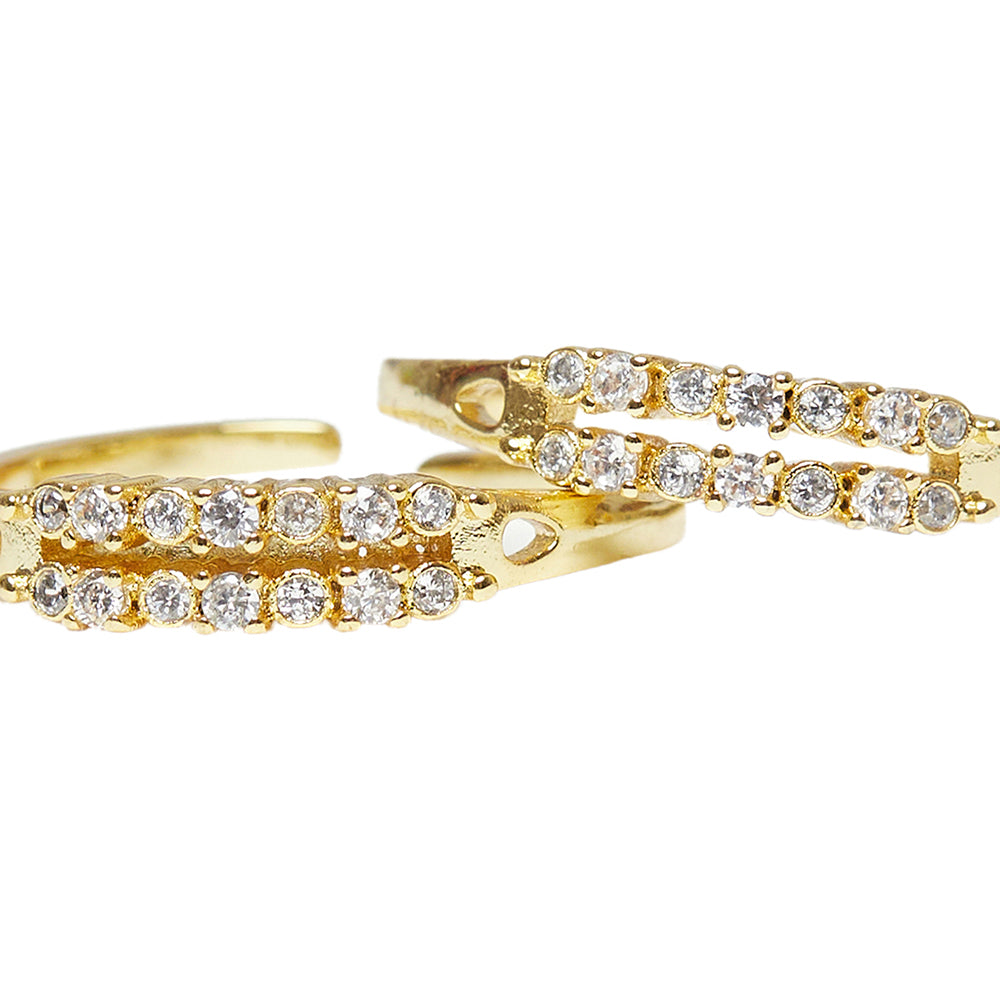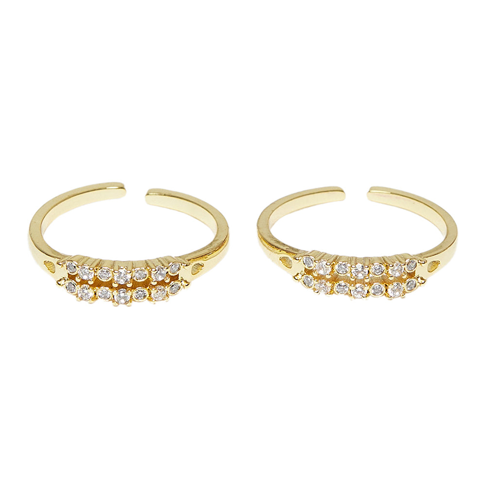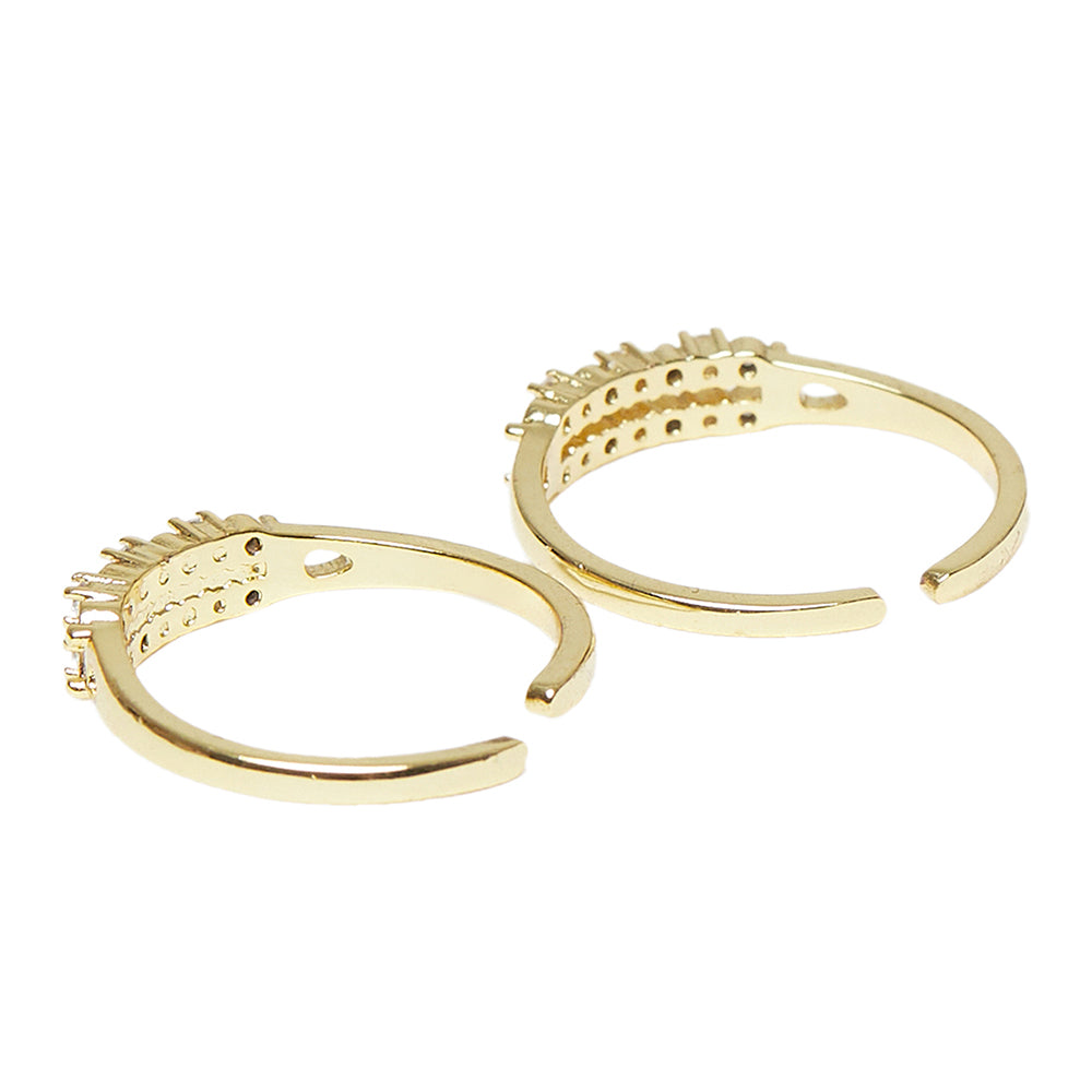 Toe rings embellished with CZ gemstones. Fashioned out of brass and yellow gold plated. Wear the adjustable pair with causal attire.