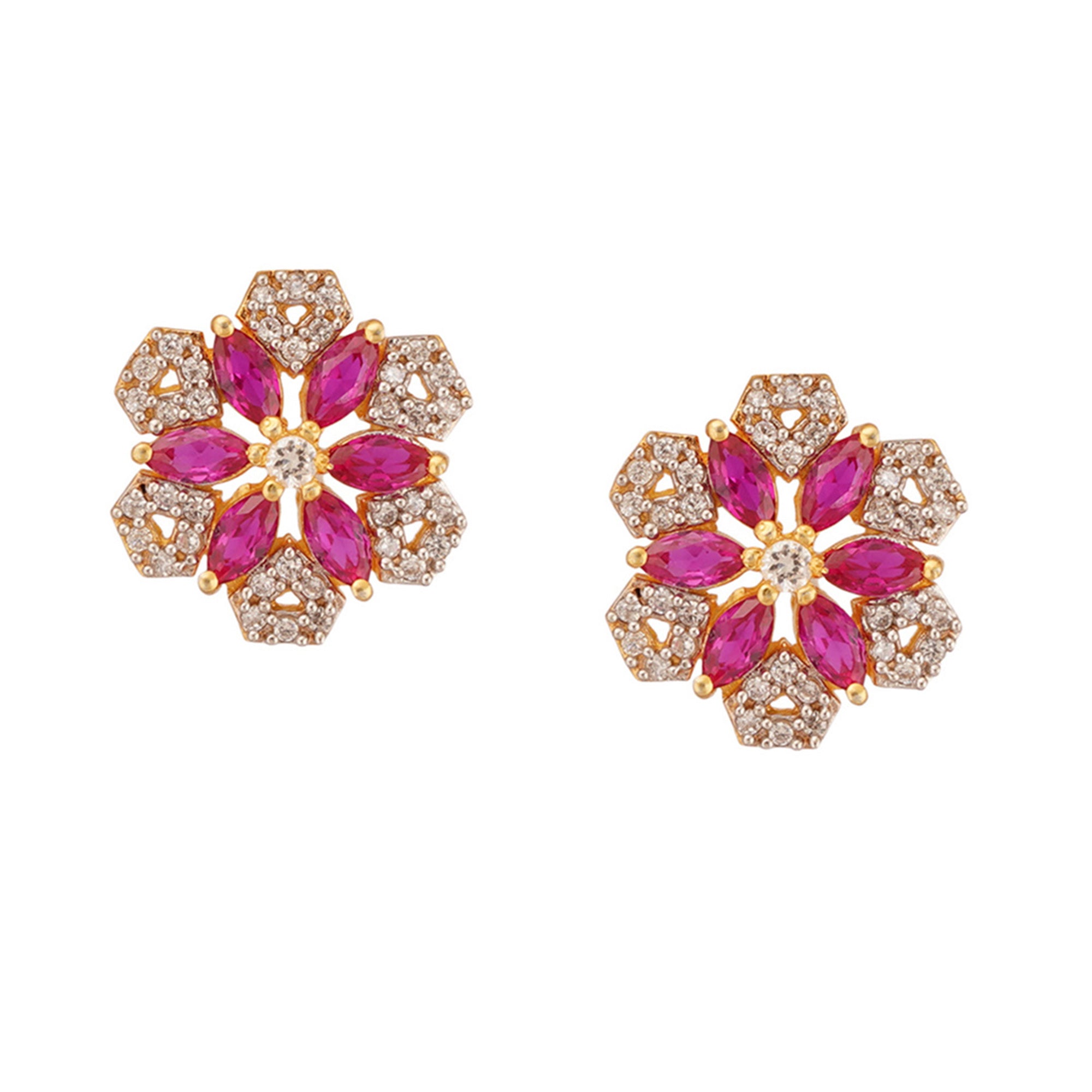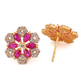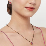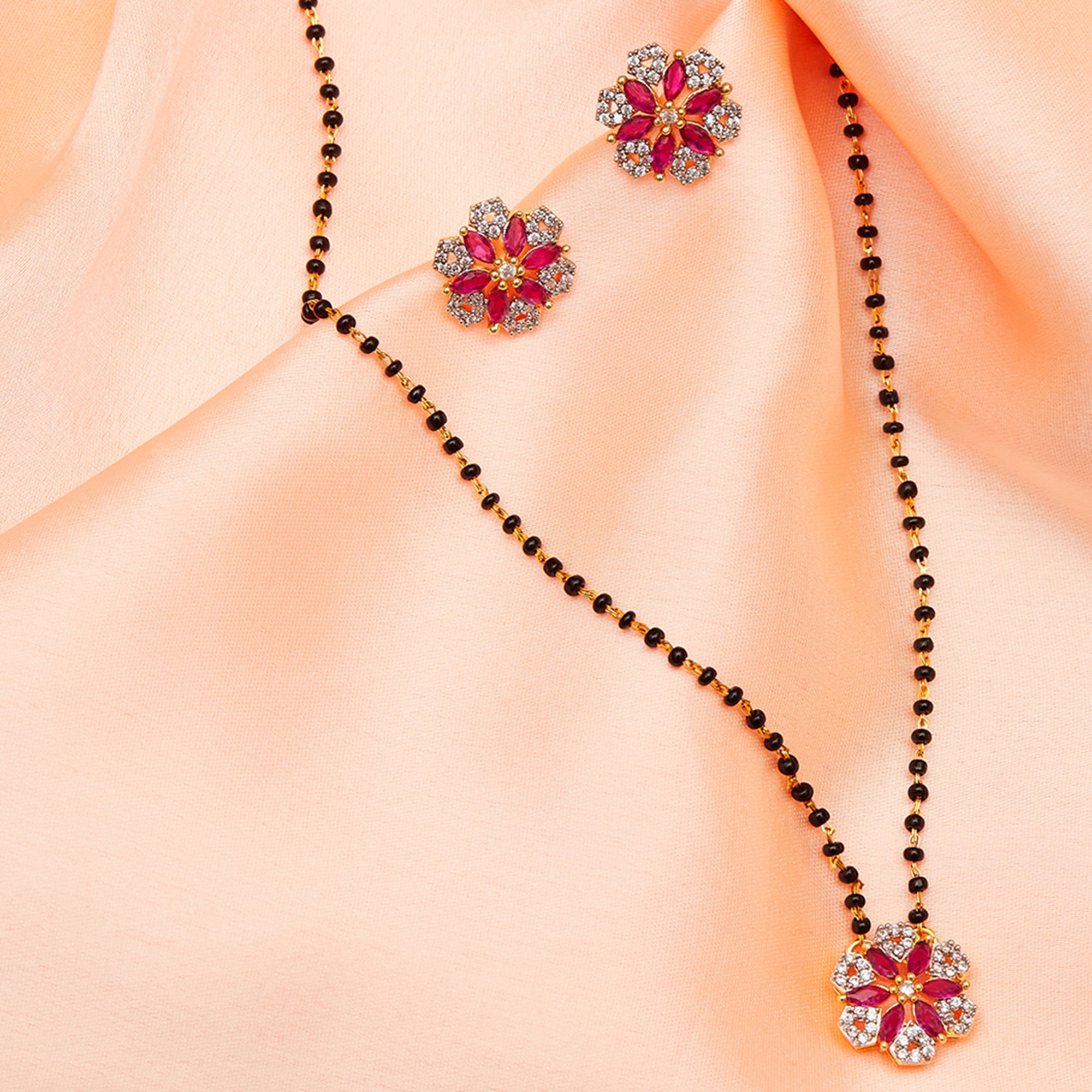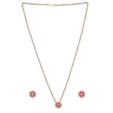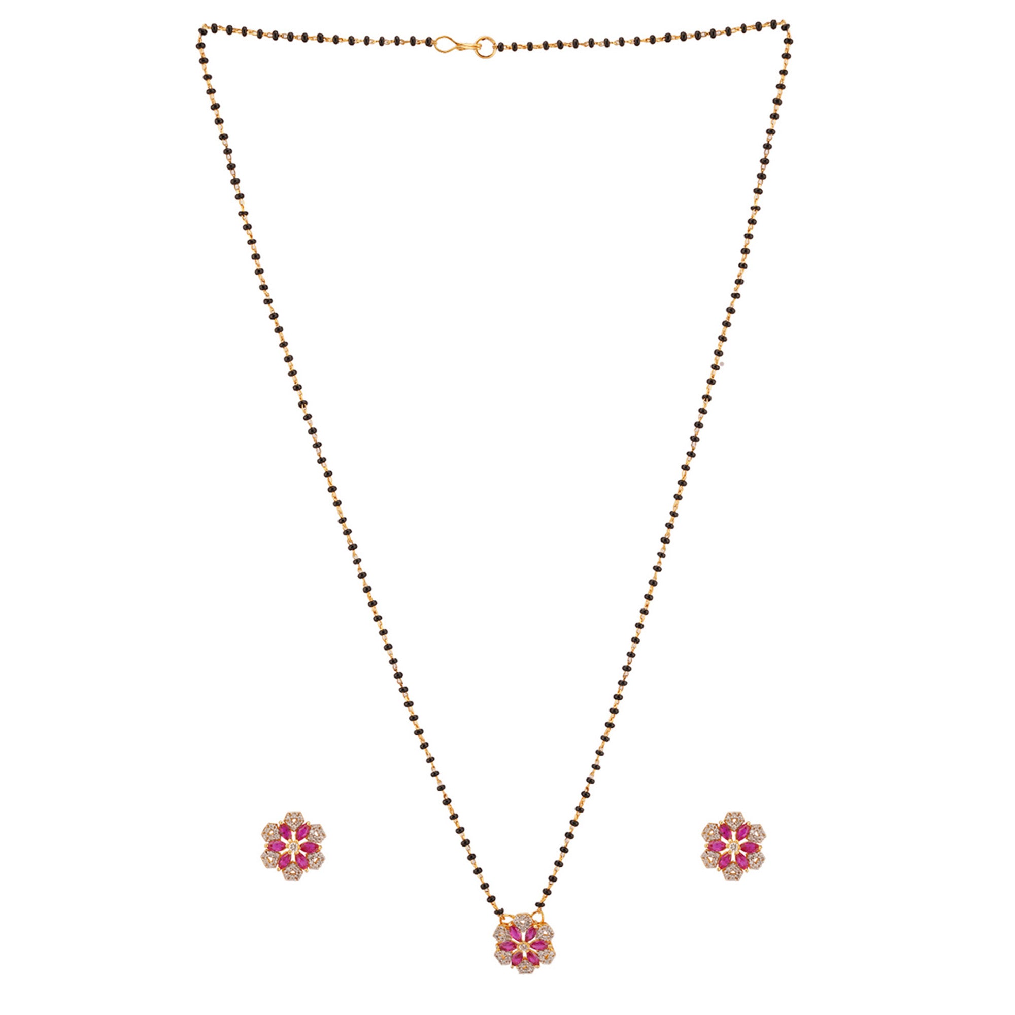 Shimmering Floret American Diamond CZ Gold Plated Brass Black Beaded Mangalsutra with Earrings